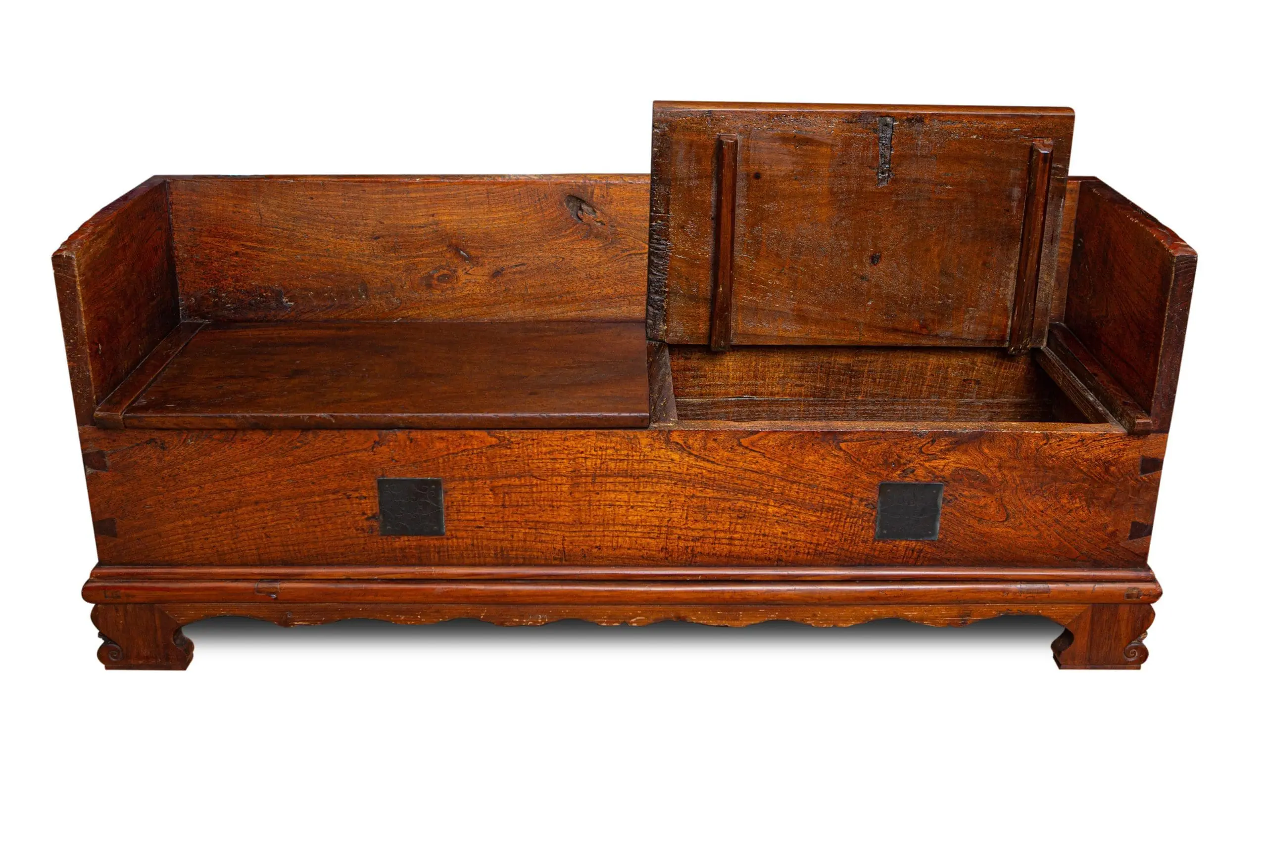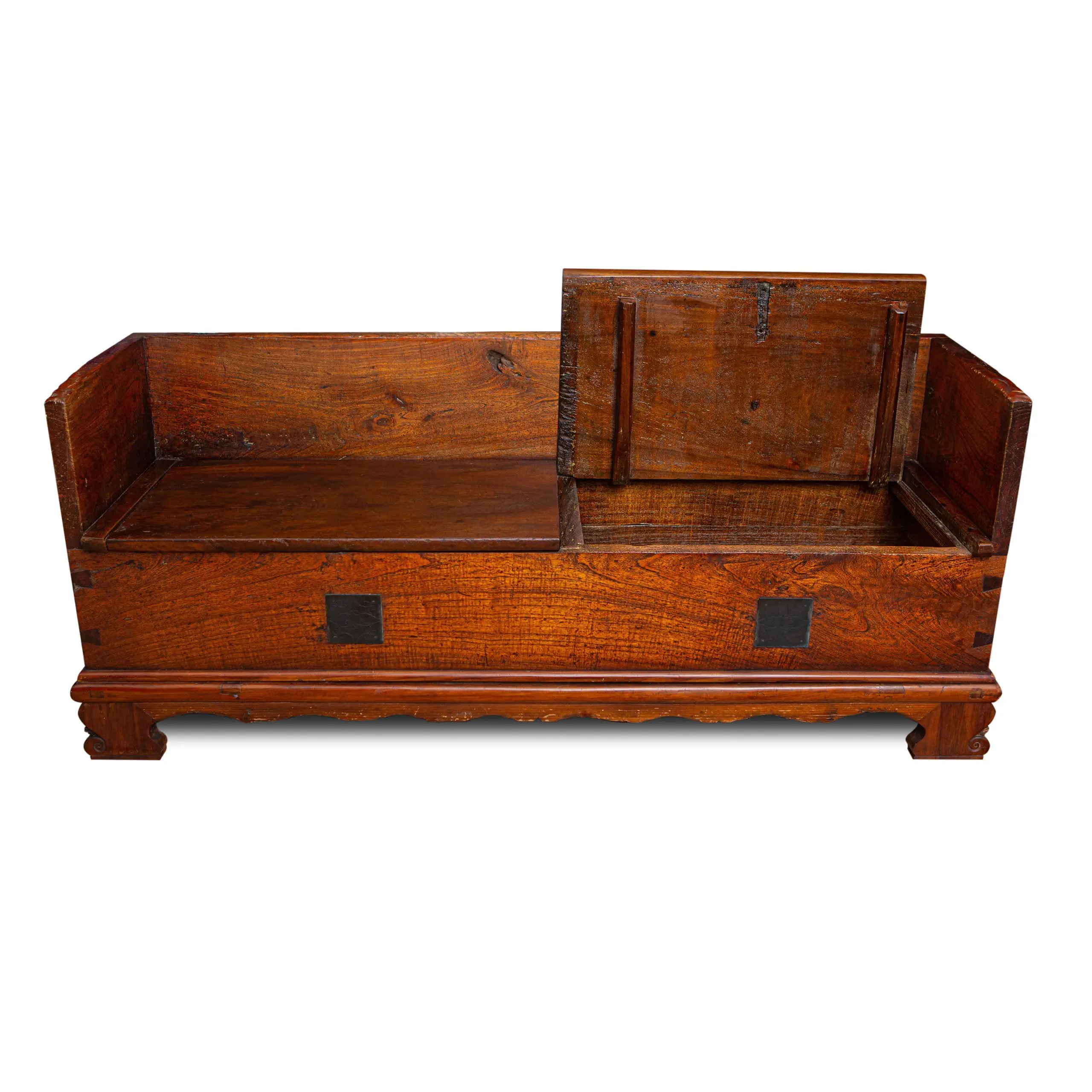 | Description | An unusual coin chest bench with two slabbed top lifting lids, thick paneled sides and back, original square brass lock plates. From the guard house of the Lin family home in Wufeng, Taiwan. |