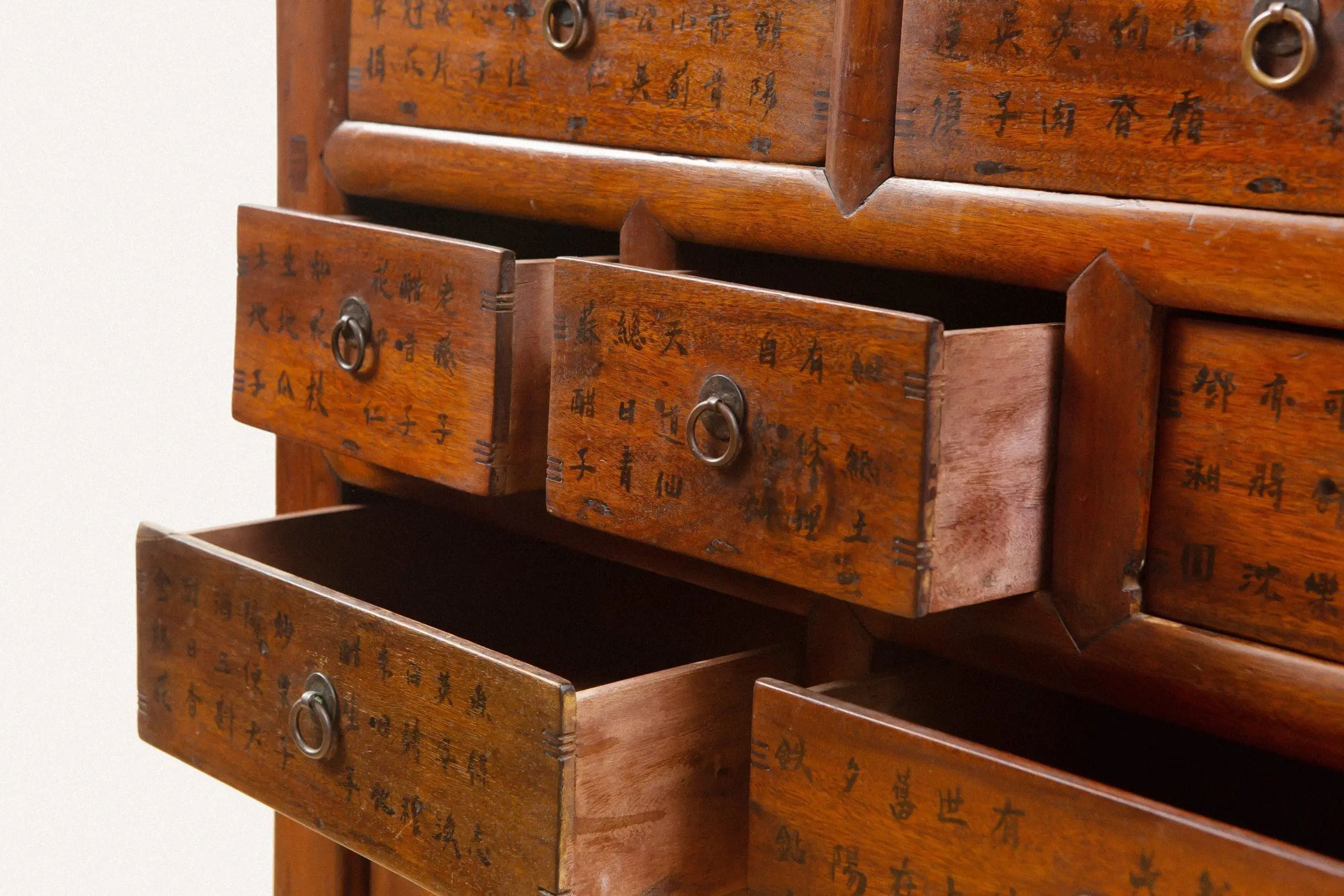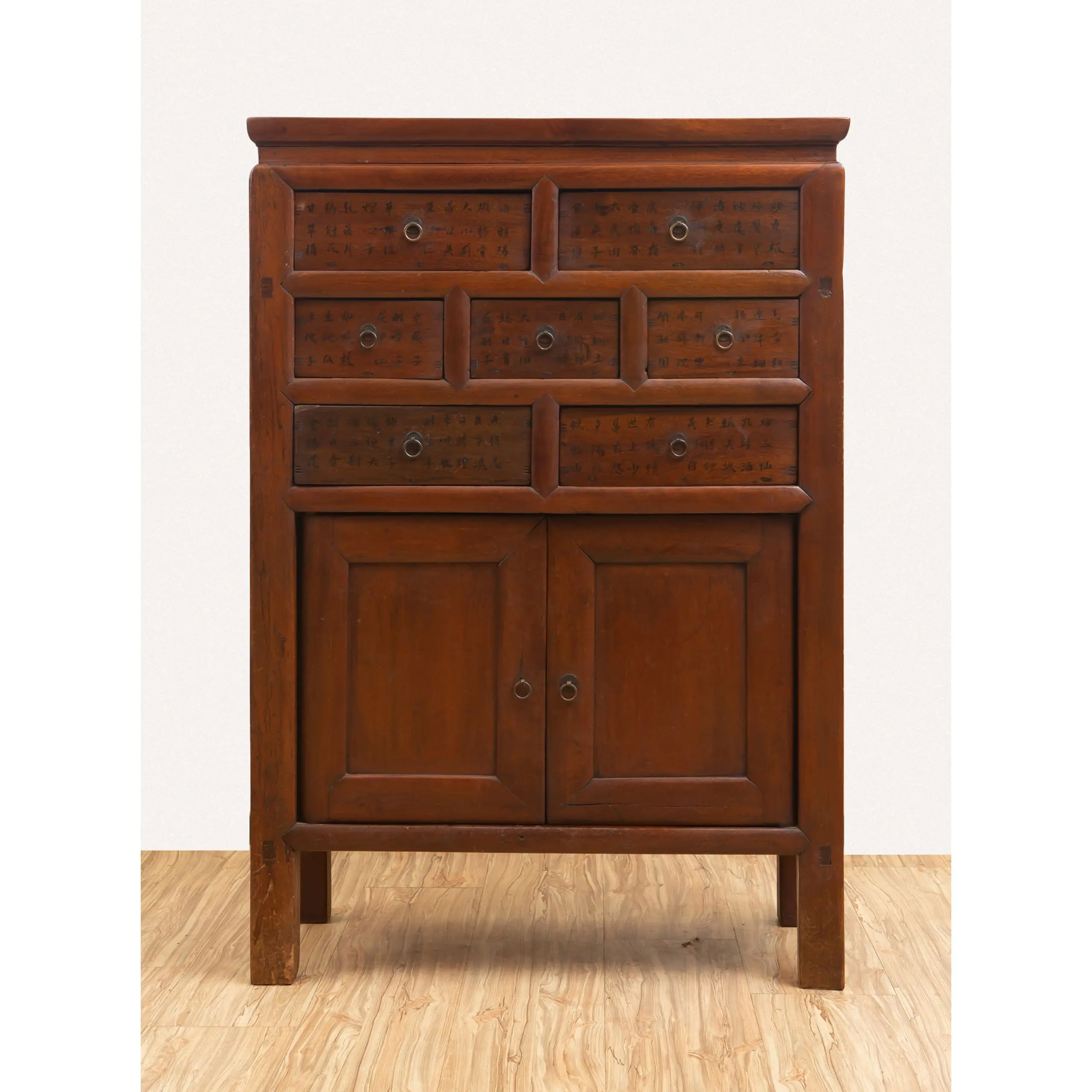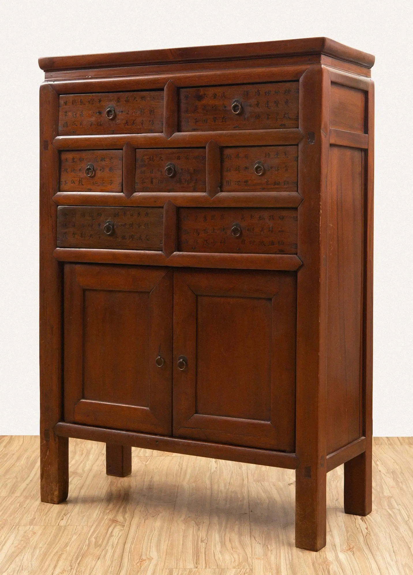 | Description | Mini medicine chest with drawers above, doors below, ink painted calligraphy on the drawers representing various herbs. |