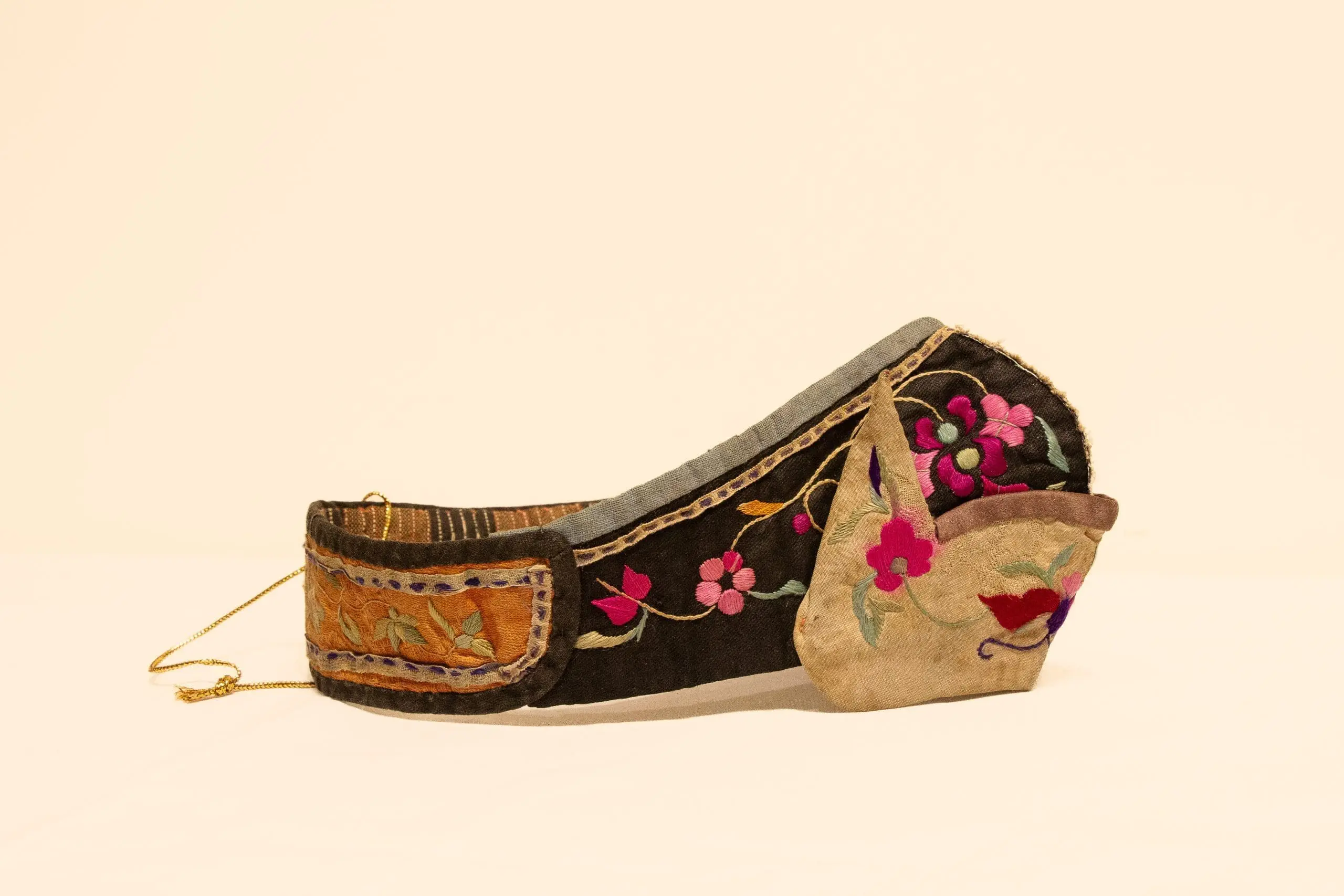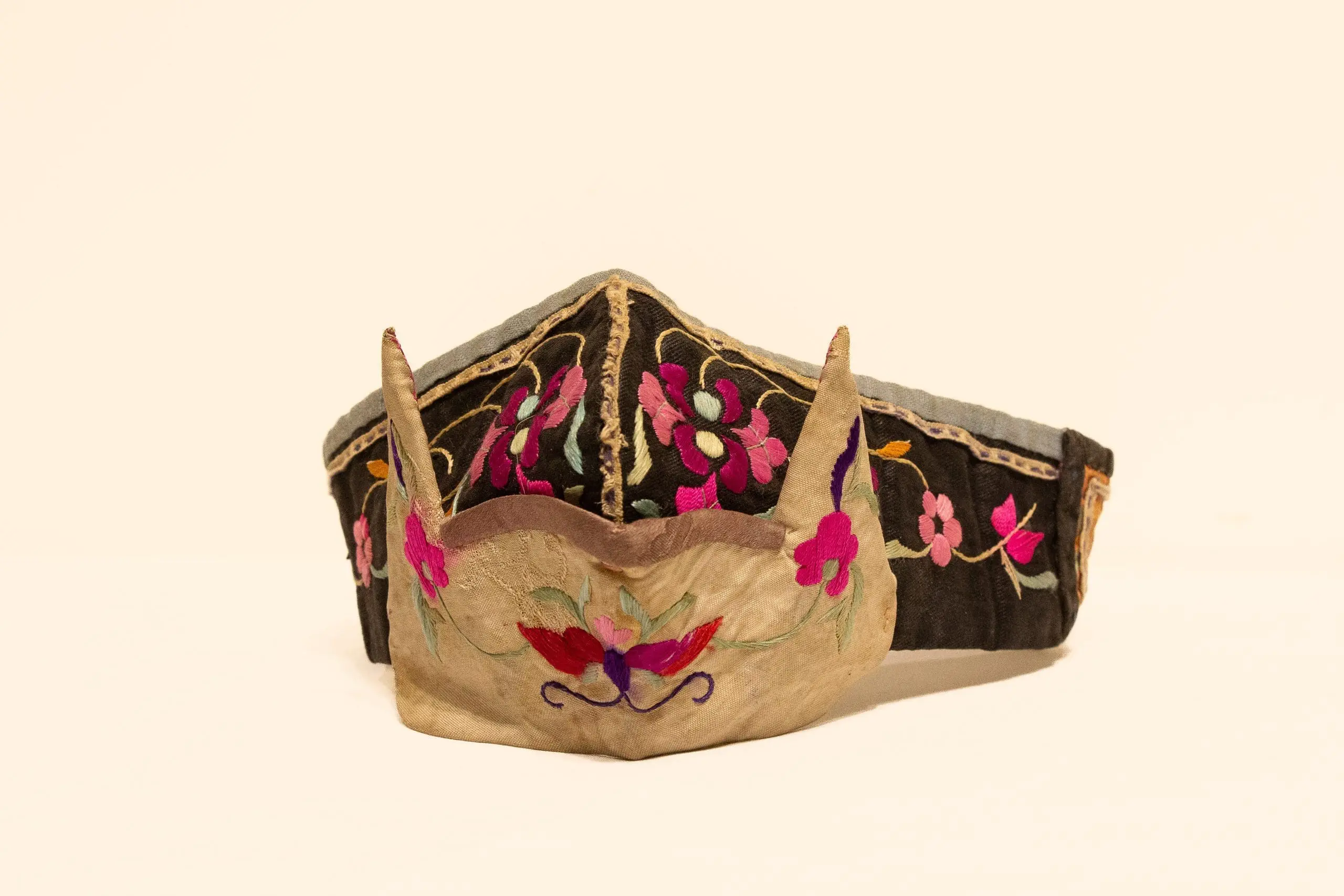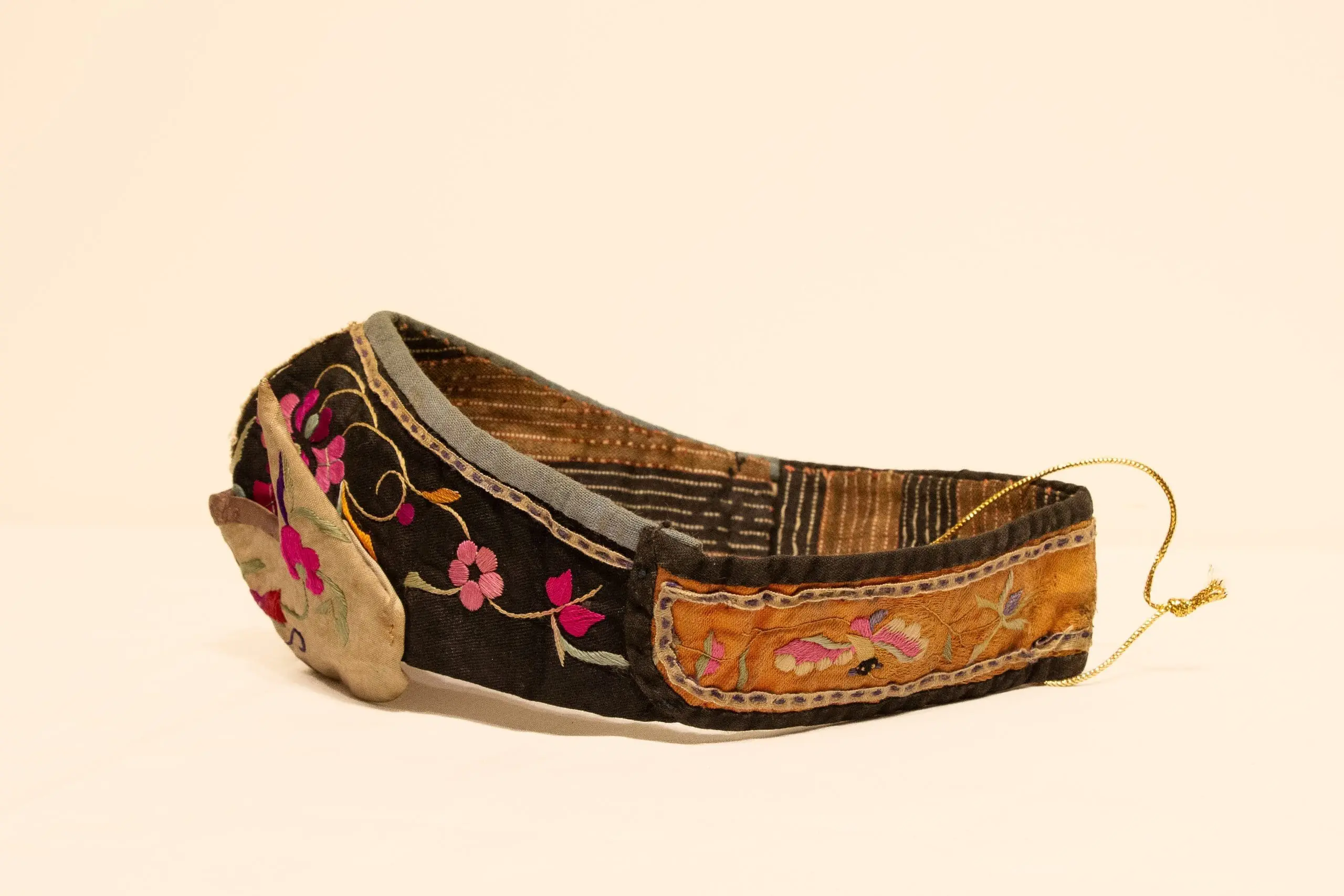 | Description | This late 19th-century Taiwanese embroidered hat band features bold red and pink floral motifs stitched in silk on a dark velvet ground. Likely part of traditional festive attire, it reflects regional folk artistry where vivid colors and auspicious floral patterns conveyed prosperity and cultural identity. |