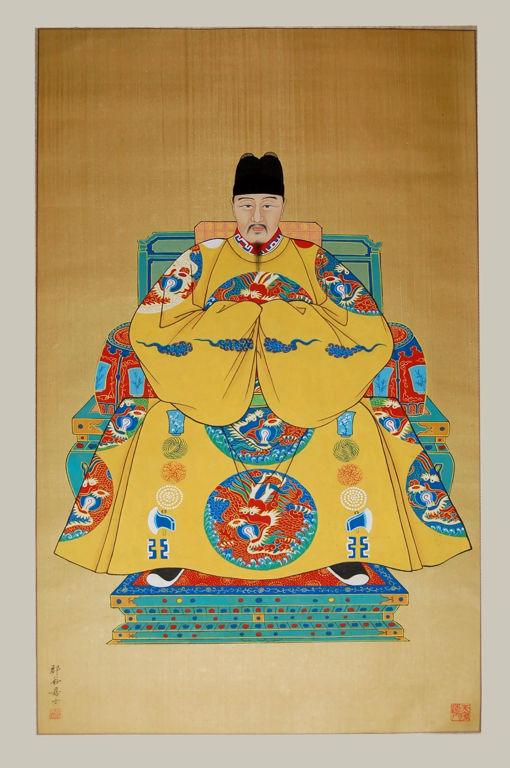 | Description | An ancestral painting of an emperor on gold background. The sun and moon depicted on his garment form the character “ming”, naming the dynasty. The dragon motif symbolises imperial power, set in the clouds representing authority and the Mandate of Heaven. His robe shows 9 dragons, a number reserved for the Emperor alone, and the yellow colour of the robe was usually reserved for members of the royal family. |
