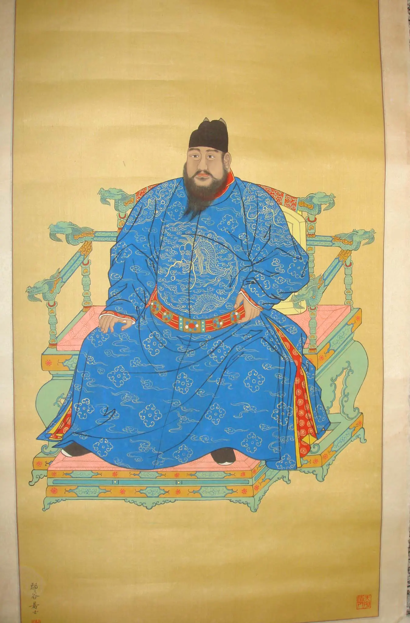 | Description | An ancestral painting of an Imperial man sits enthroned, gold backdrop. Dragon motifs amidst clouds denote imperial power and divine right. His upright pose, echoing Buddha, reflects dignity and religious authority, bridging ancestral communication. |