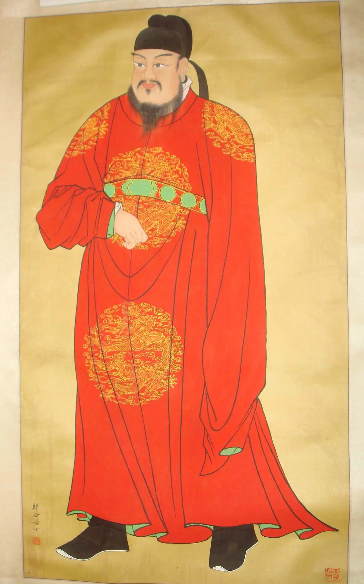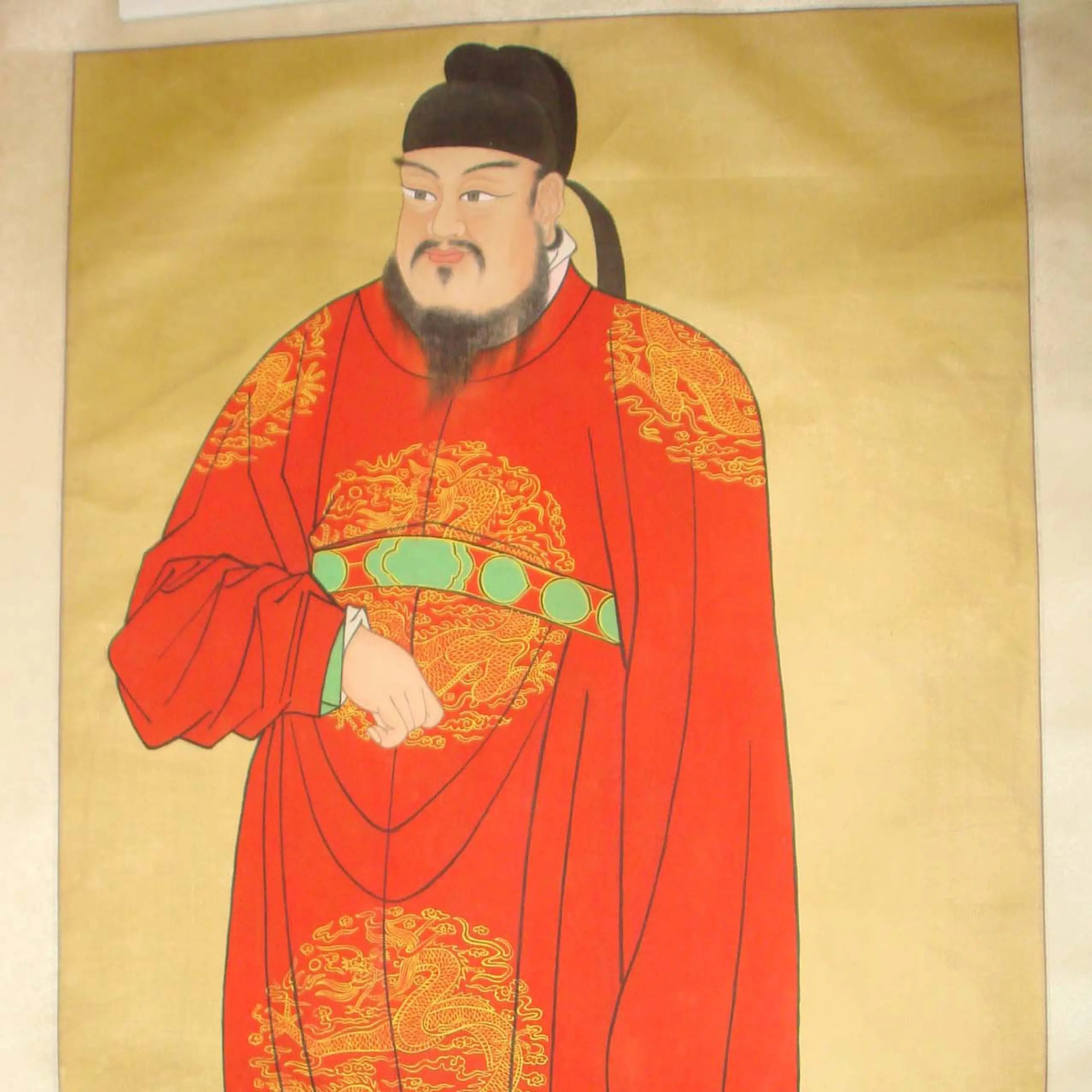| Description | A high official, possibly Emperor Gaozu, sits on a gold backdrop. Dragon motifs amidst clouds signify imperial power. His upright pose, like Buddha's, displays dignity. Red, in ancestral art, represents fire, among the five elements. |