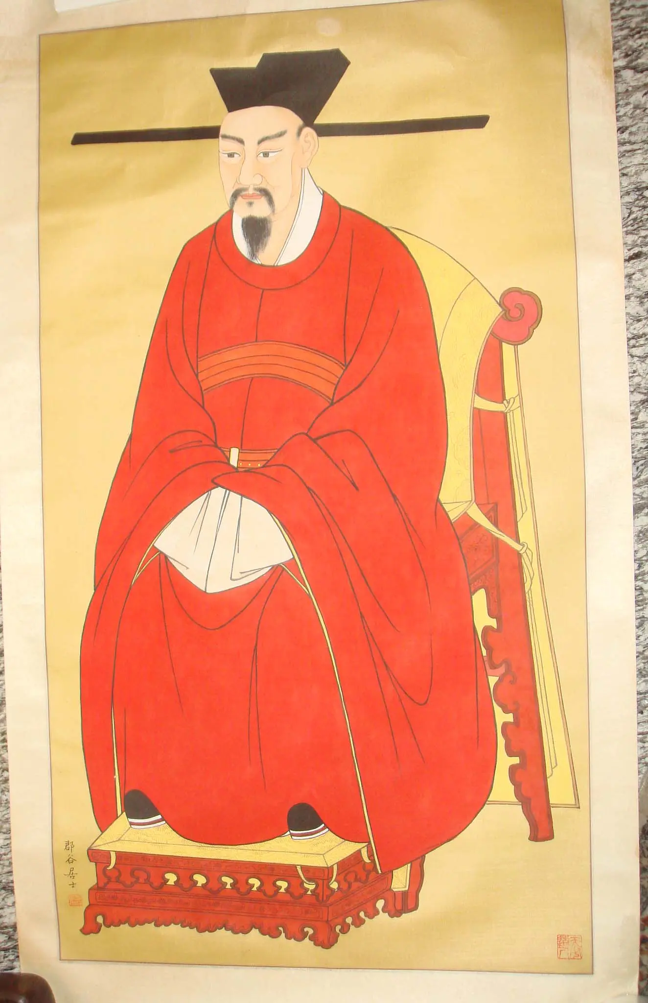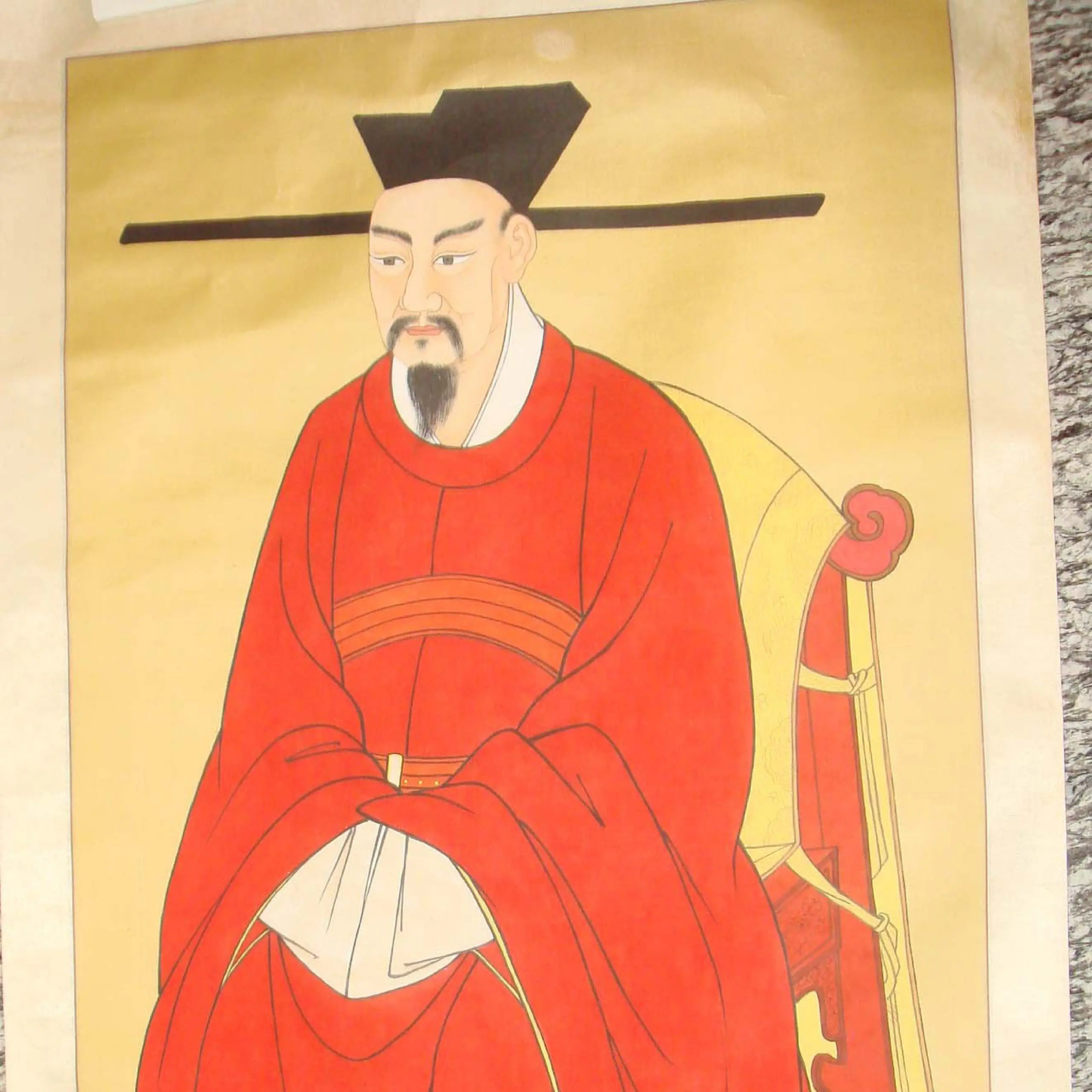 | Description | Song Dynasty portrait: red-robed official on gold, Zhanjiao futou hat. Yellow chair cloth symbolizes imperial earth authority. The hat's long flaps prevented whispers, reflecting official's rank and dignity during assemblies. |