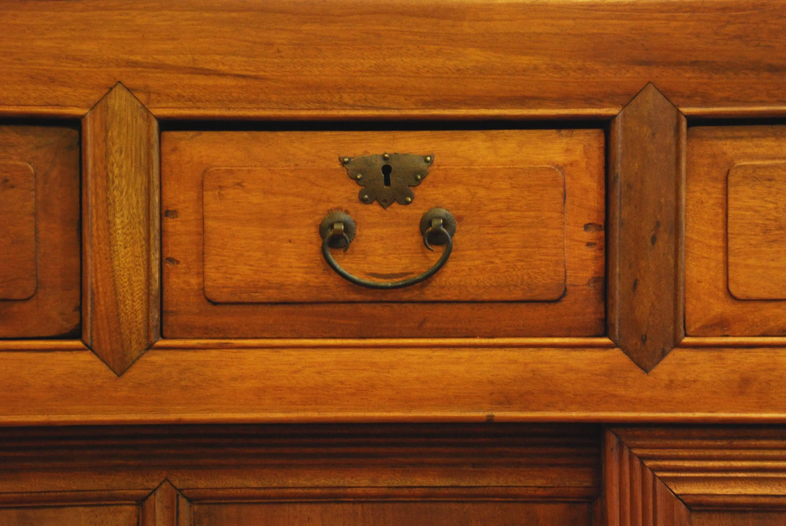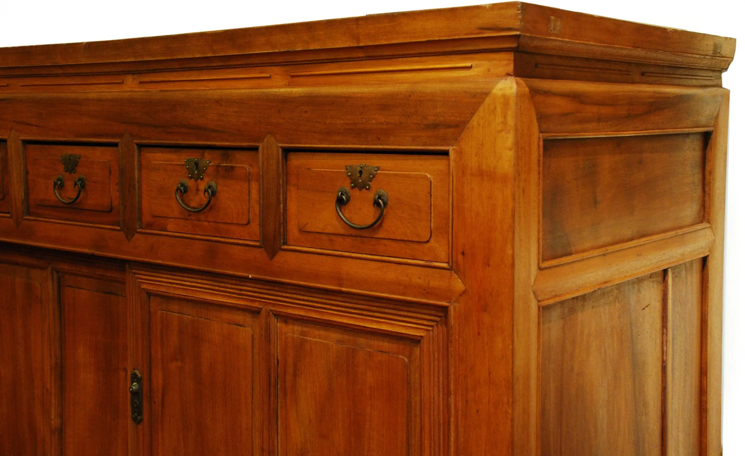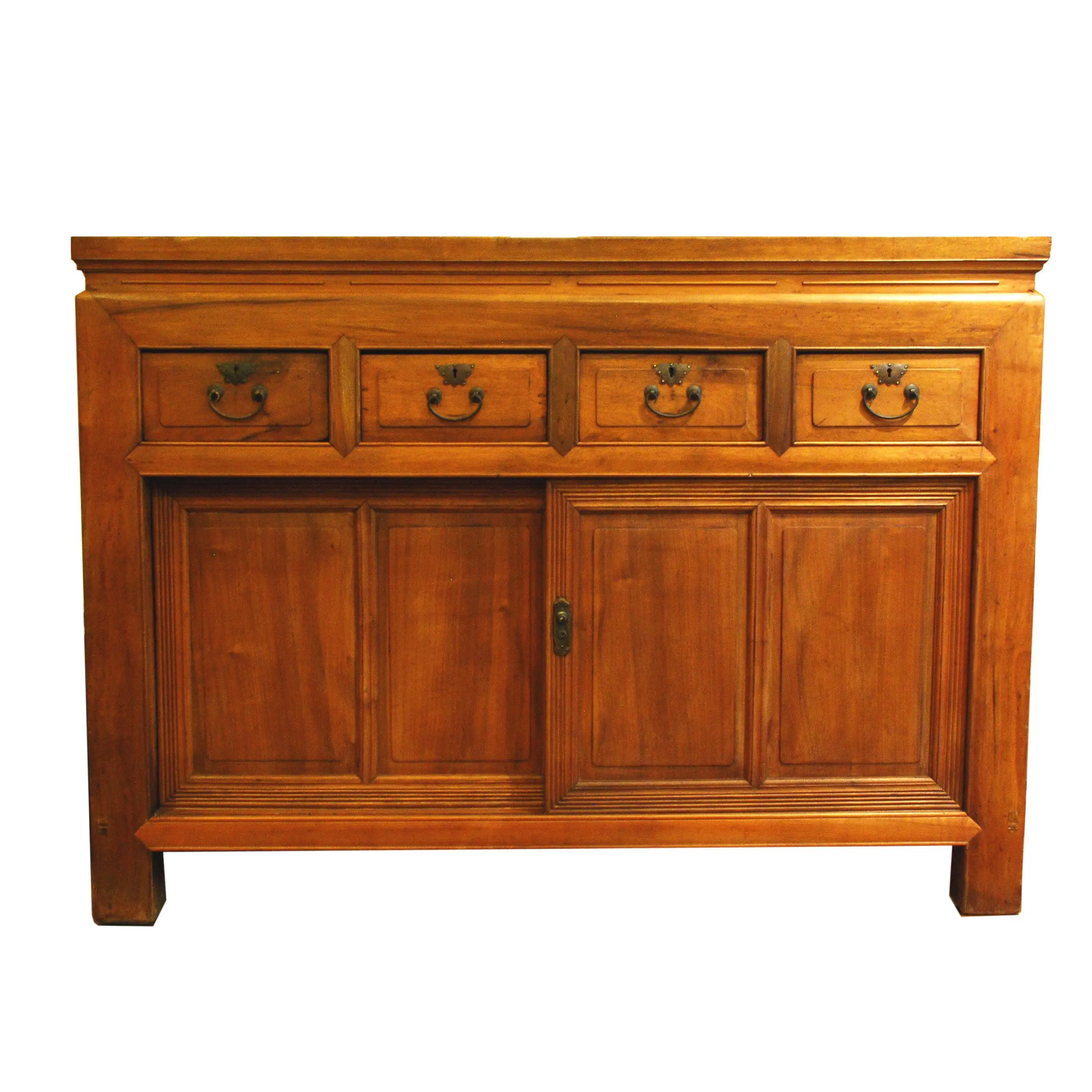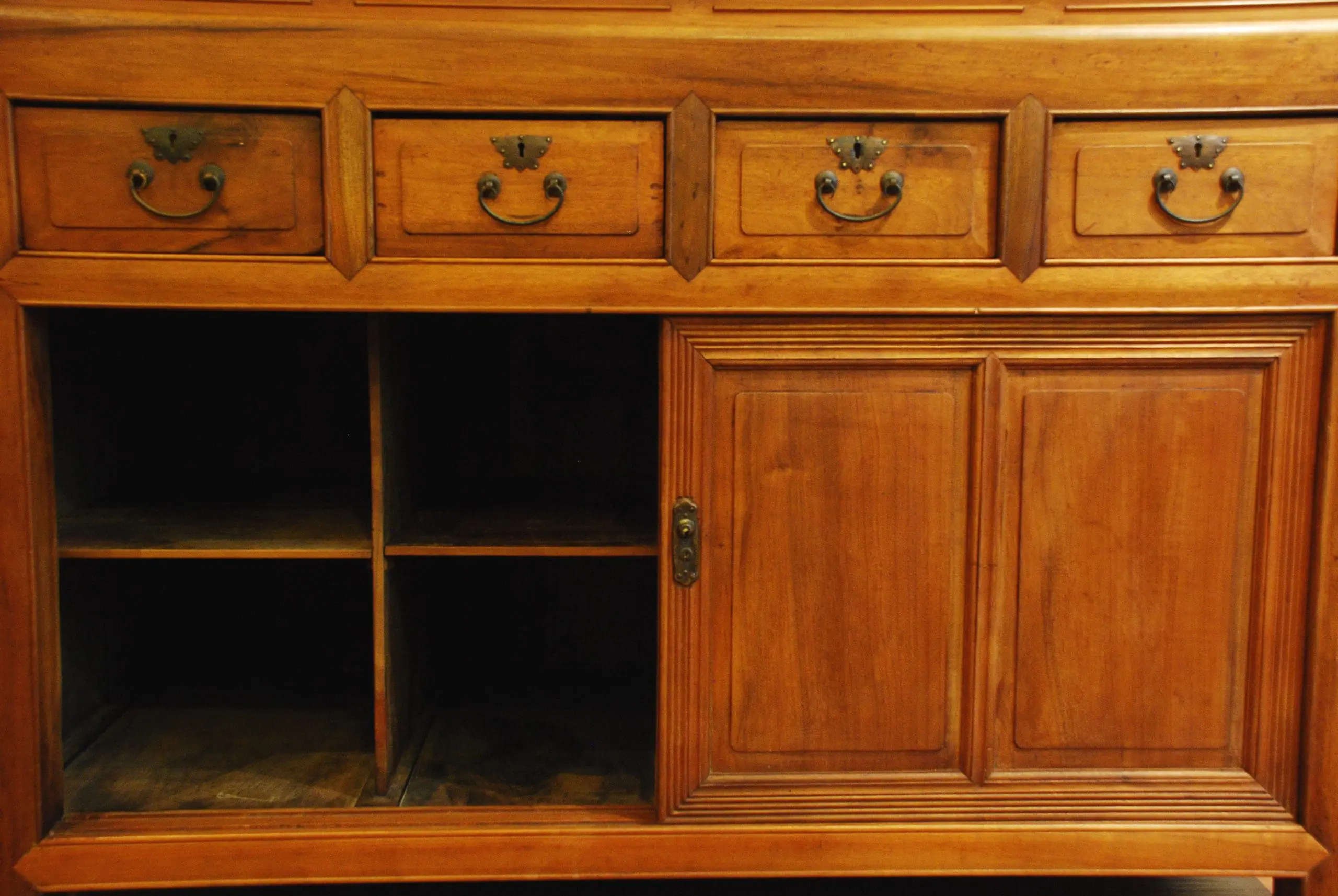 | Description | A large chest with a mitered, mortised. and tenoned frame, four drawers above, followed by two wide sliding doors with beading on the frames, and rectangular legs. A unique garment chest from Taiwan. |