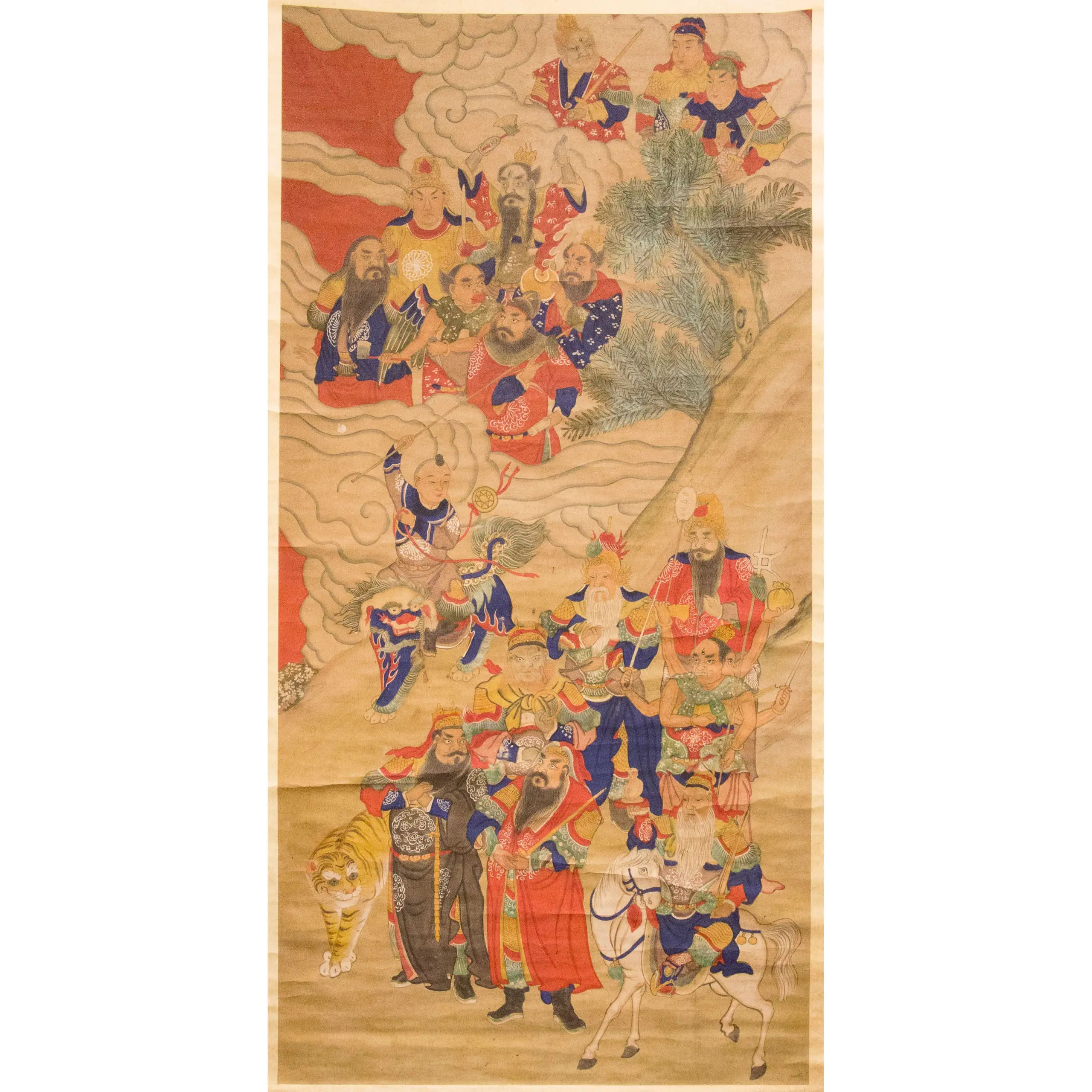 | Description | This mid to late Qing Taiwanese temple painting illustrates a celestial procession of heavenly generals and deities. Clad in vibrant robes, the figures ride tigers, horses, and mythical beasts while wielding divine emblems. Against a backdrop of swirling clouds and mountain forms, the painting embodies cosmic order, martial power, and protective guardianship. |