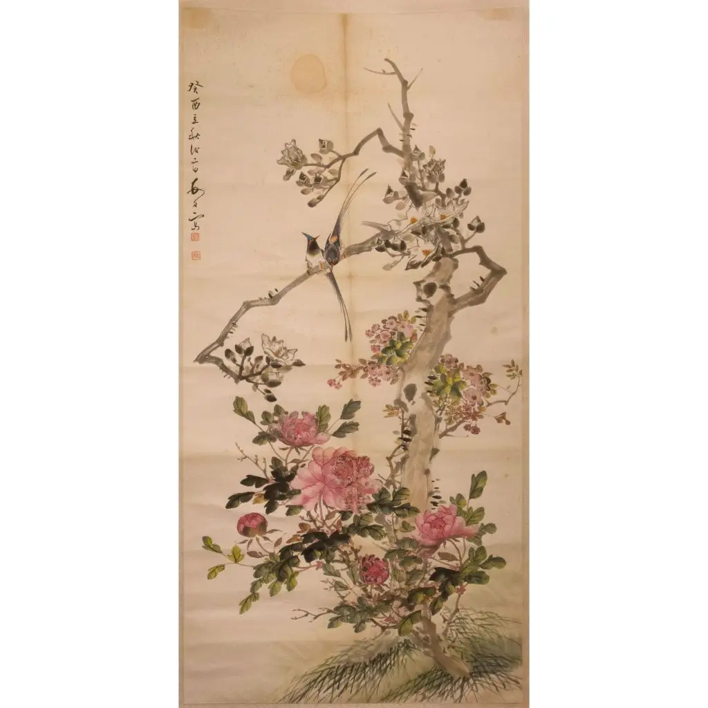 | Description | A vertical scroll from the Qing Dynasty depicting a scene of two long-tailed magpies perched on a blossoming tree trunk. The painting uses ink and color to illustrate large pink peonies and smaller floral blossoms. The composition, known as Huaniao (bird and flower), includes expressive calligraphy and a red seal. |
