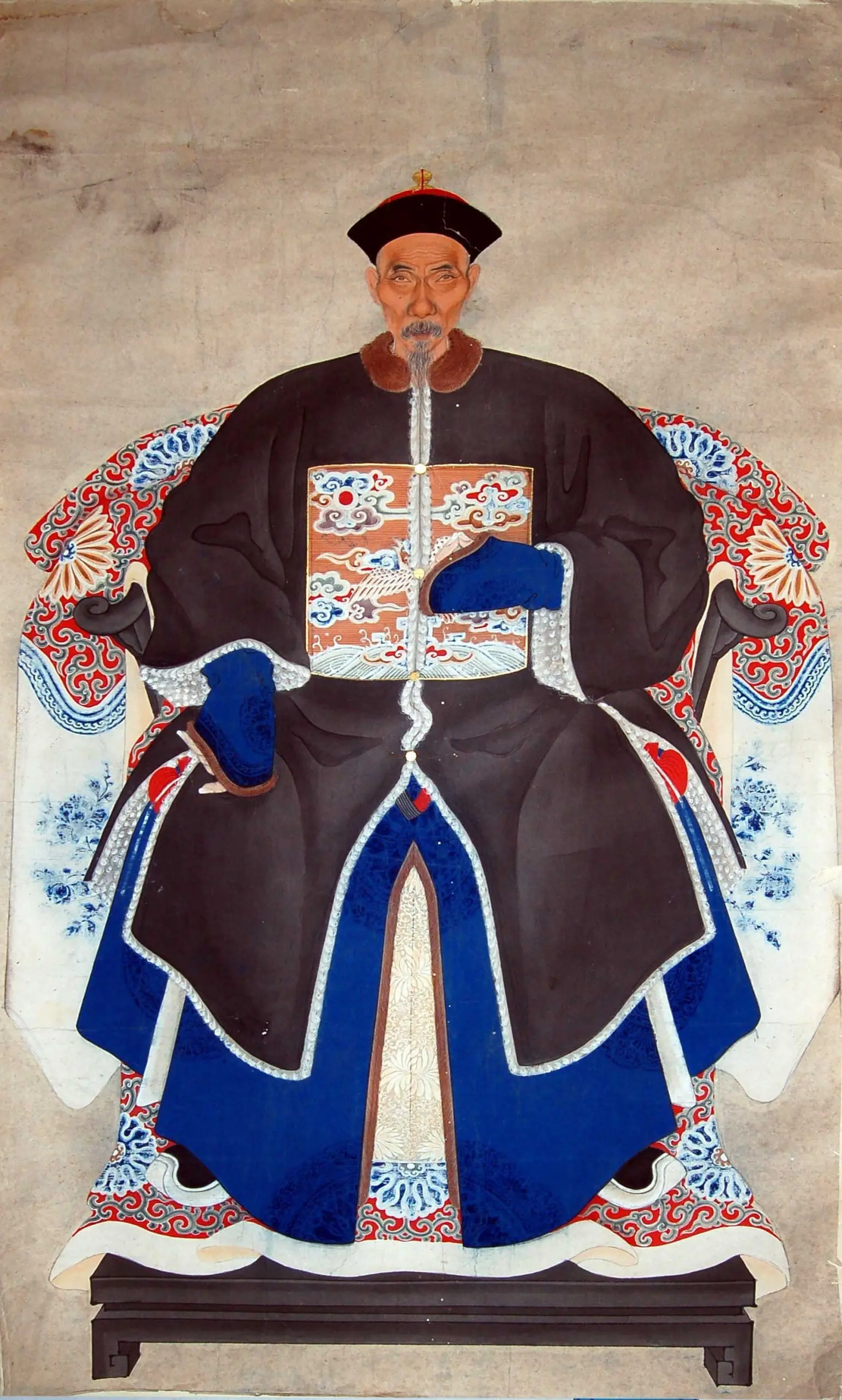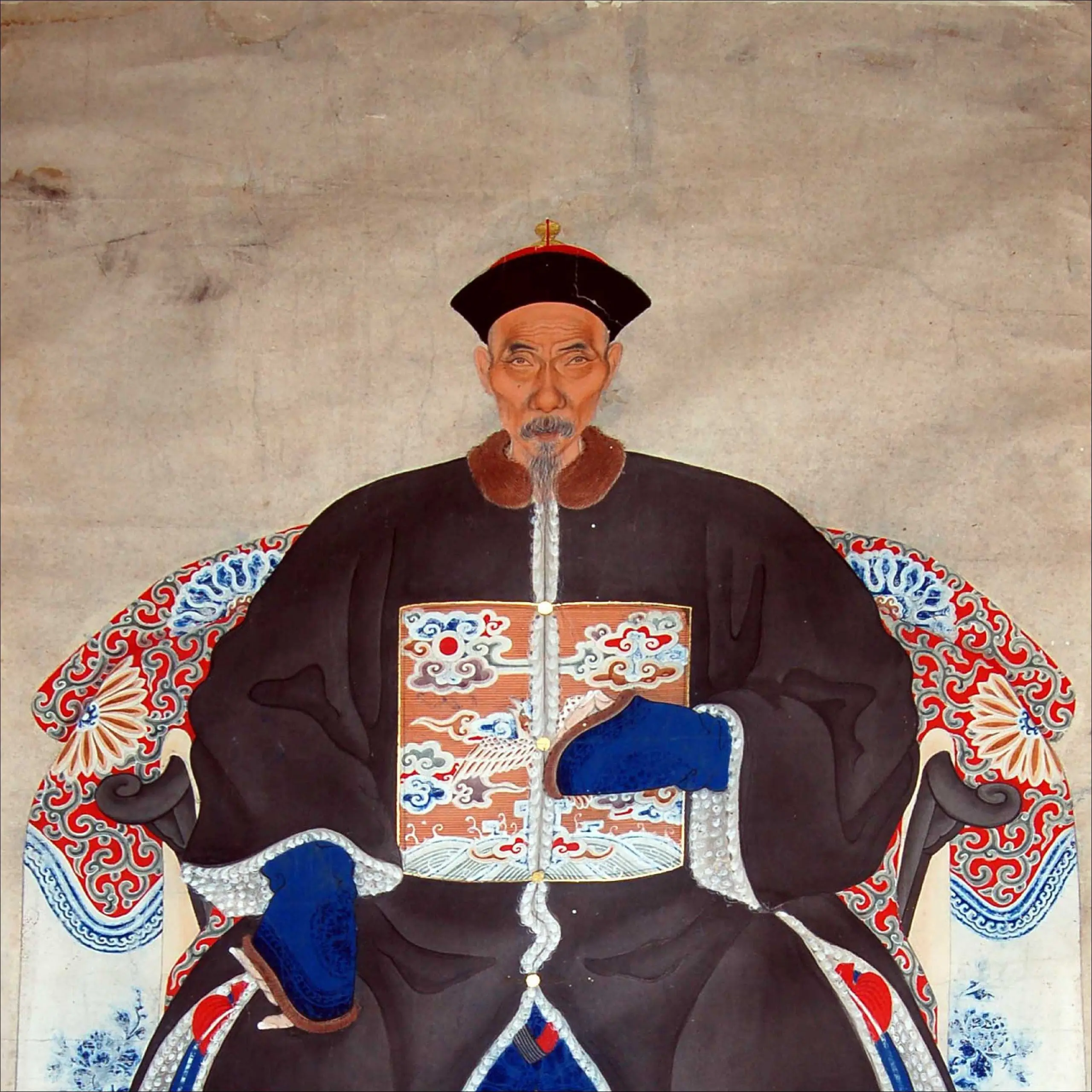 | Description | Qing Dynasty portrait: dignified official in black silk robe, crane badge denoting high civil rank. Ceremonial hu tablet and finial hat signify status. Minimal background emphasizes his authority and lineage. Formal pose reflects Confucian respect. |