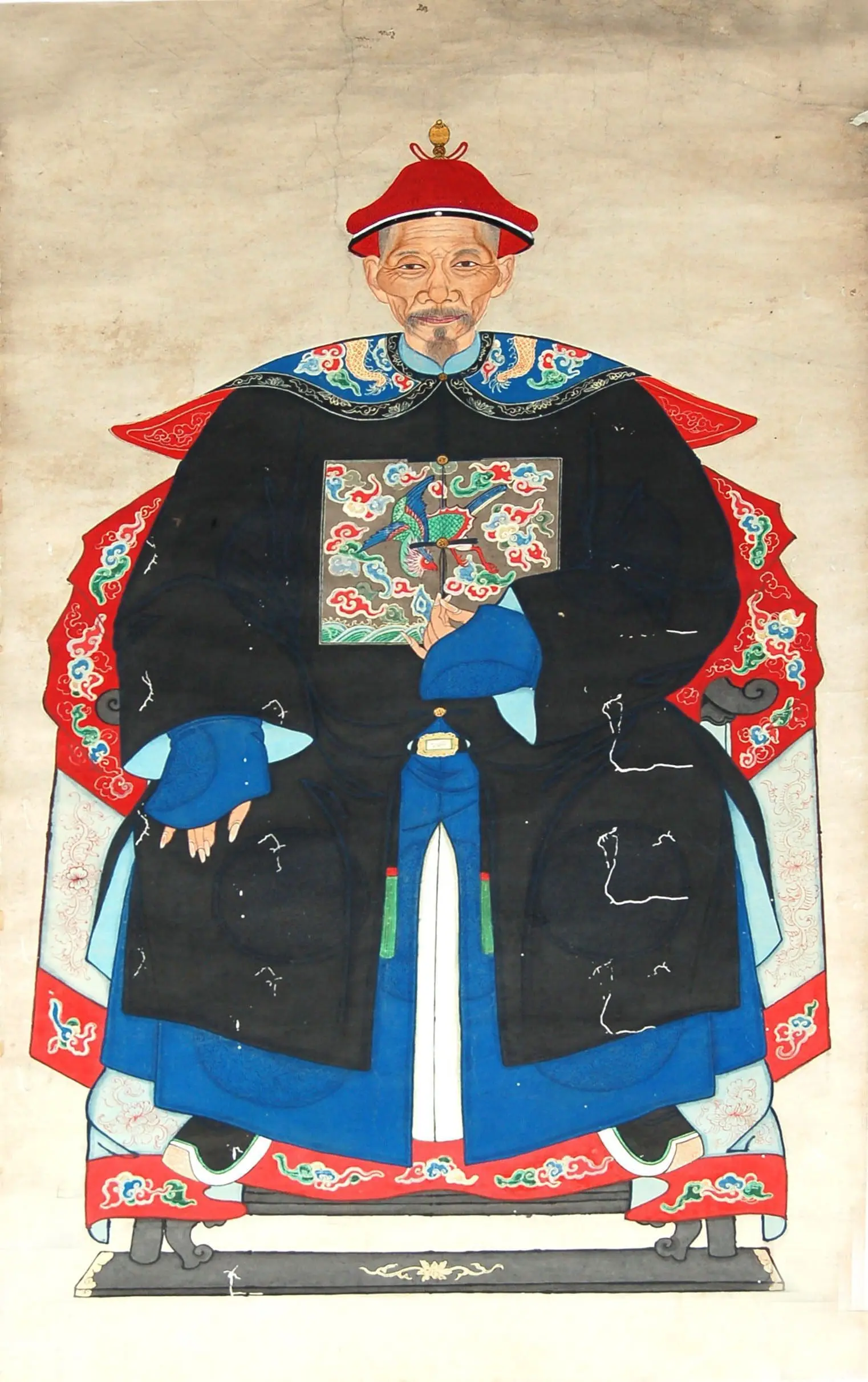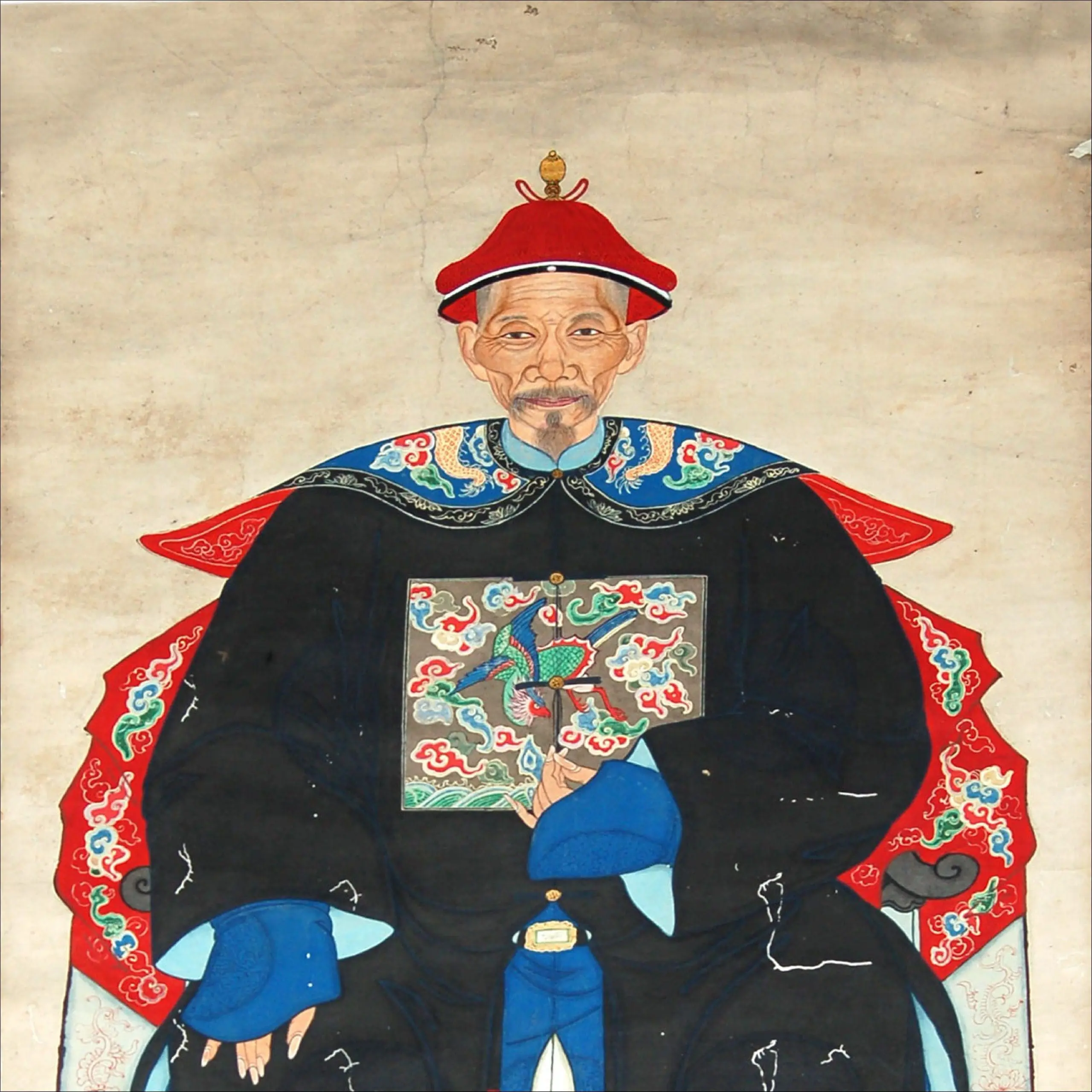 | Description | Qing Dynasty portrait: high-ranking civil official in black robes, bird rank badge. Red hat and ornate chair denote status. Detailed face and formal pose reflect Confucian respect. Plain background emphasizes his dignity and lineage. |