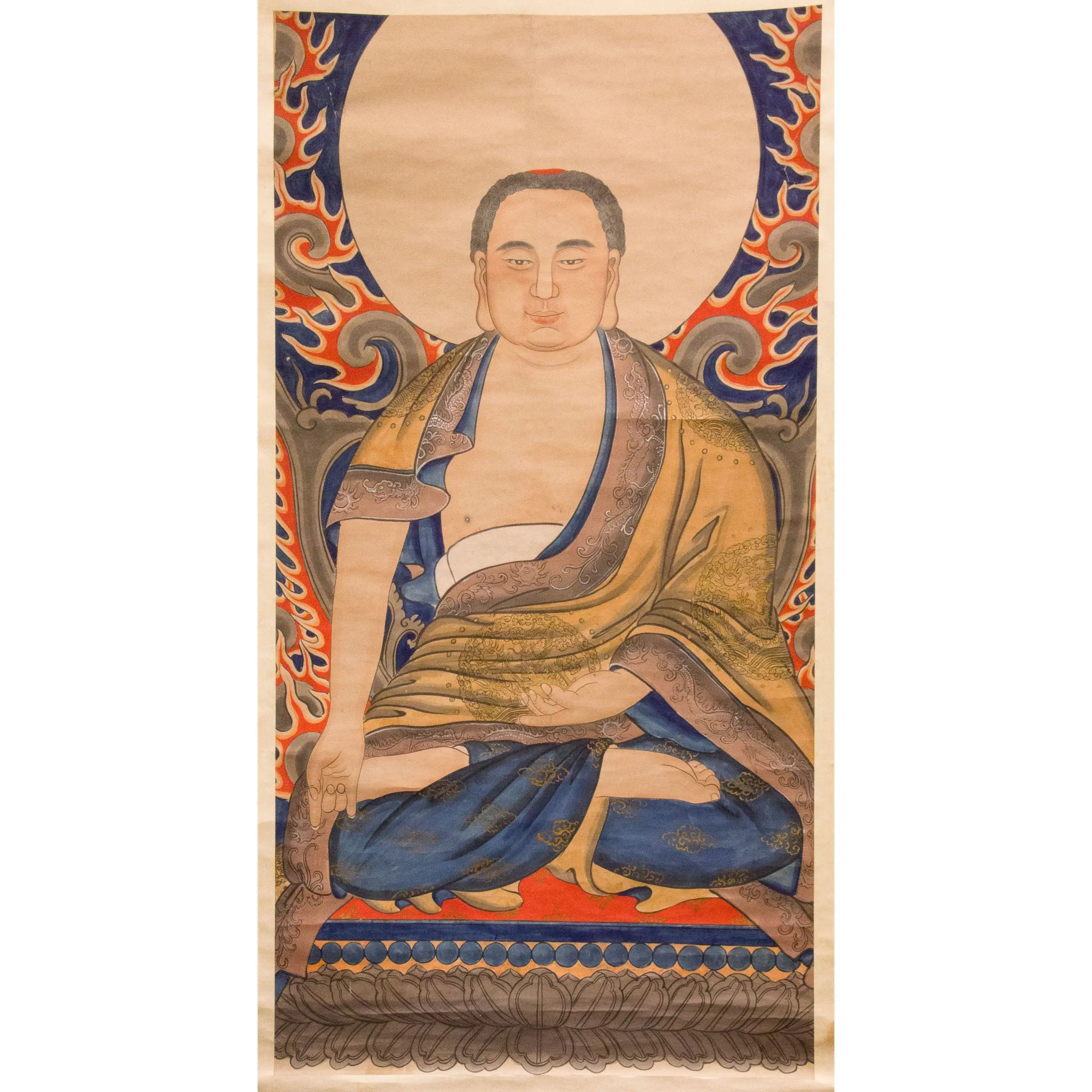 | Description | This vertical scroll depicts a seated Buddhist figure, possibly Shakyamuni Buddha or an Arhat. The figure sits cross-legged, wearing a monk's robe (saffron and blue) draped over a green lower garment. They are backed by a large halo and framed by decorative red and blue flames, painted with color pigments on paper. |