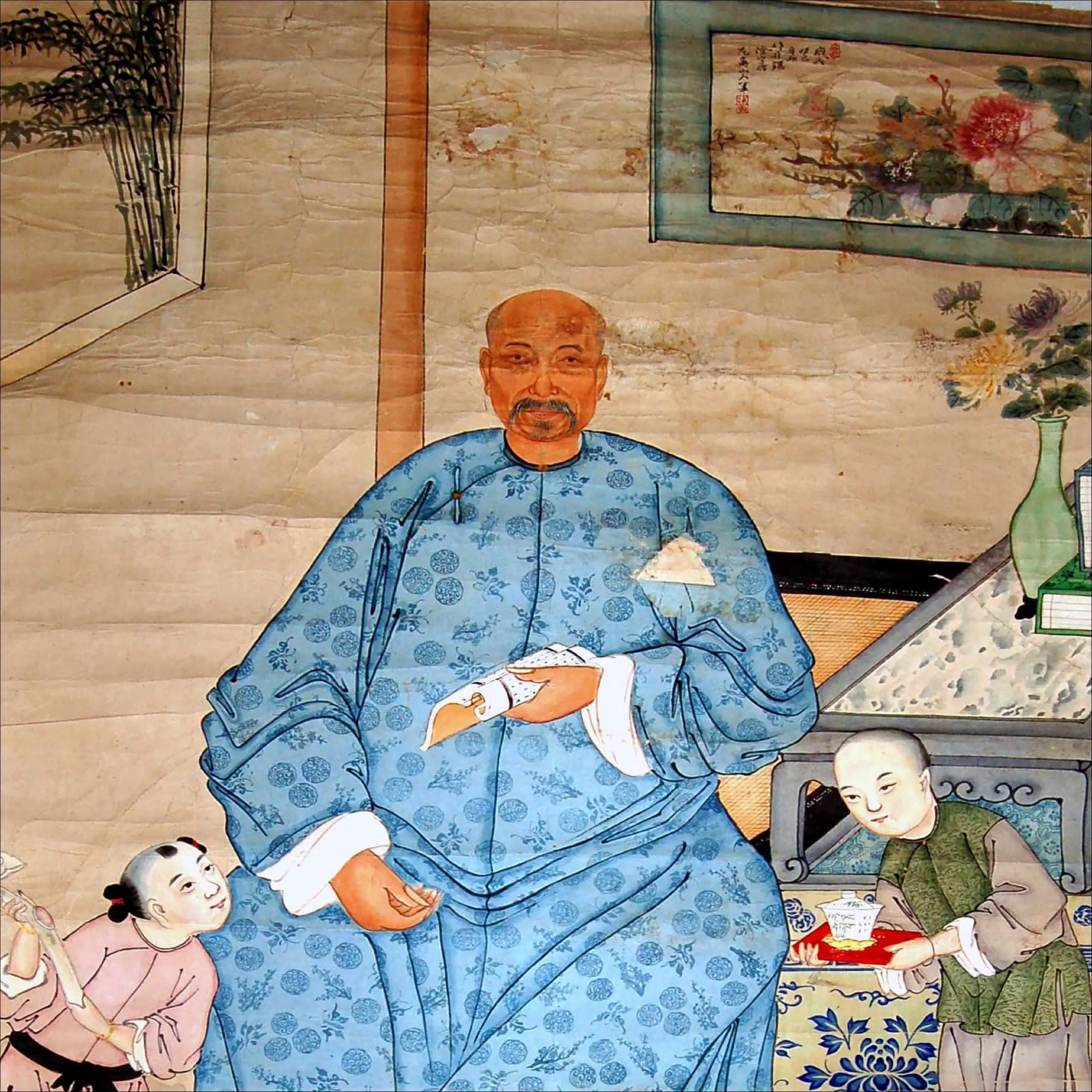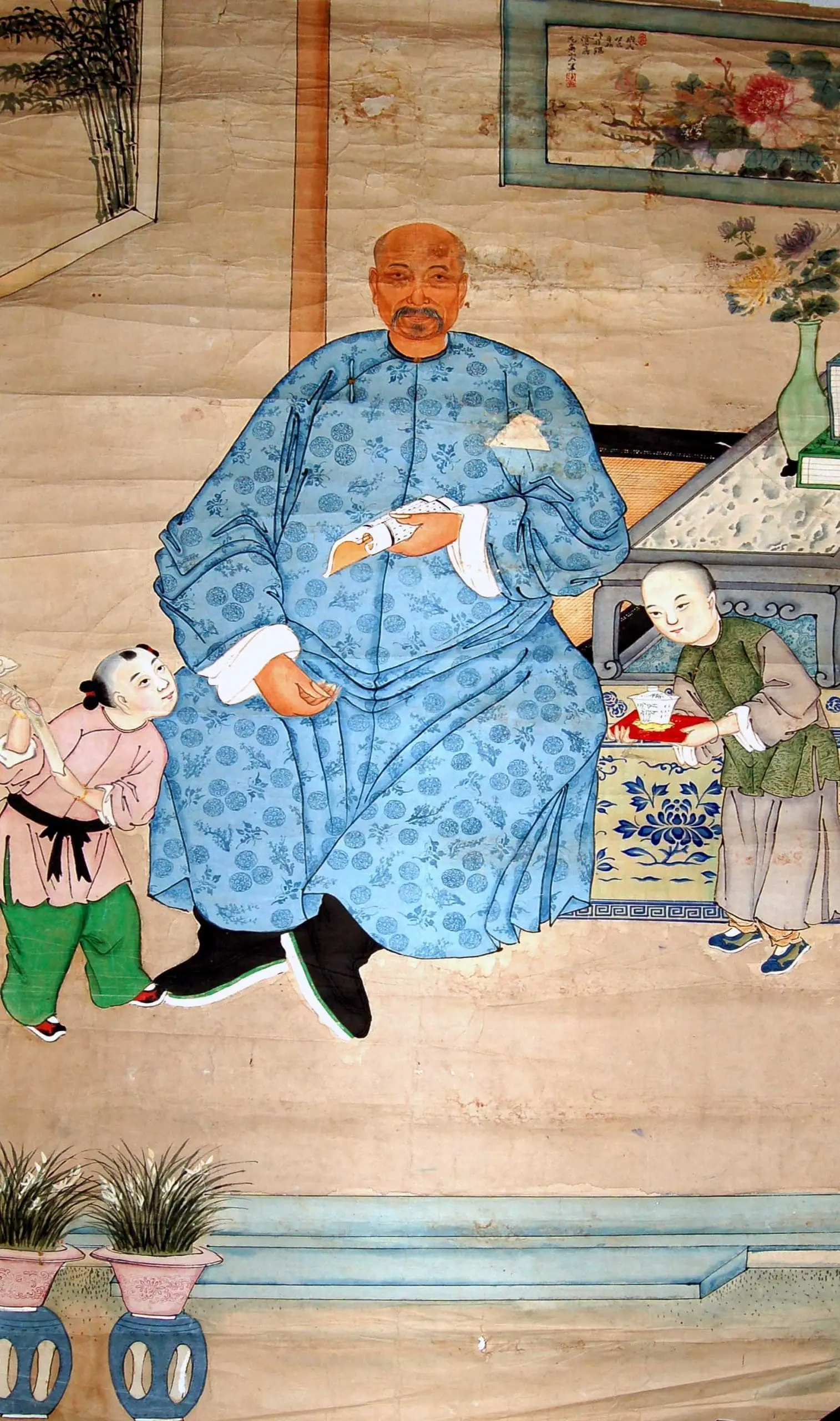 | Description | Qing Dynasty portrait: seated man, flanked by two figures. Traditional attire suggests status. Domestic interior, with paintings and plants, hints at a family setting. Formal poses contrast with the domestic scene, reflecting ancestral veneration. |