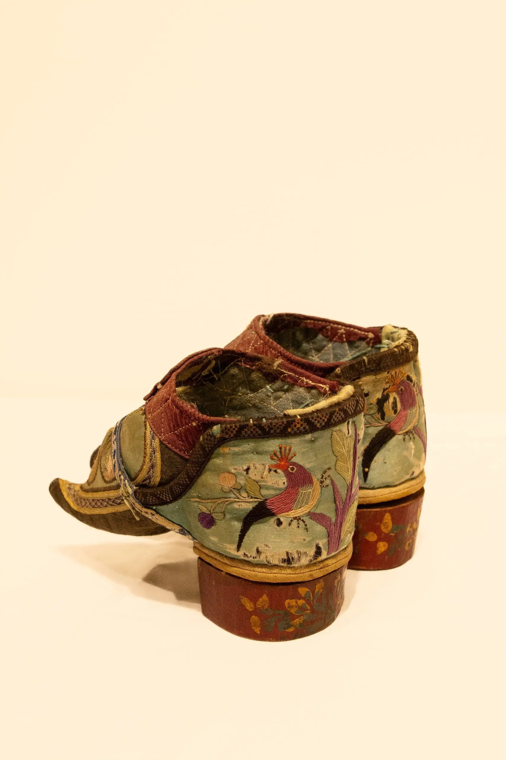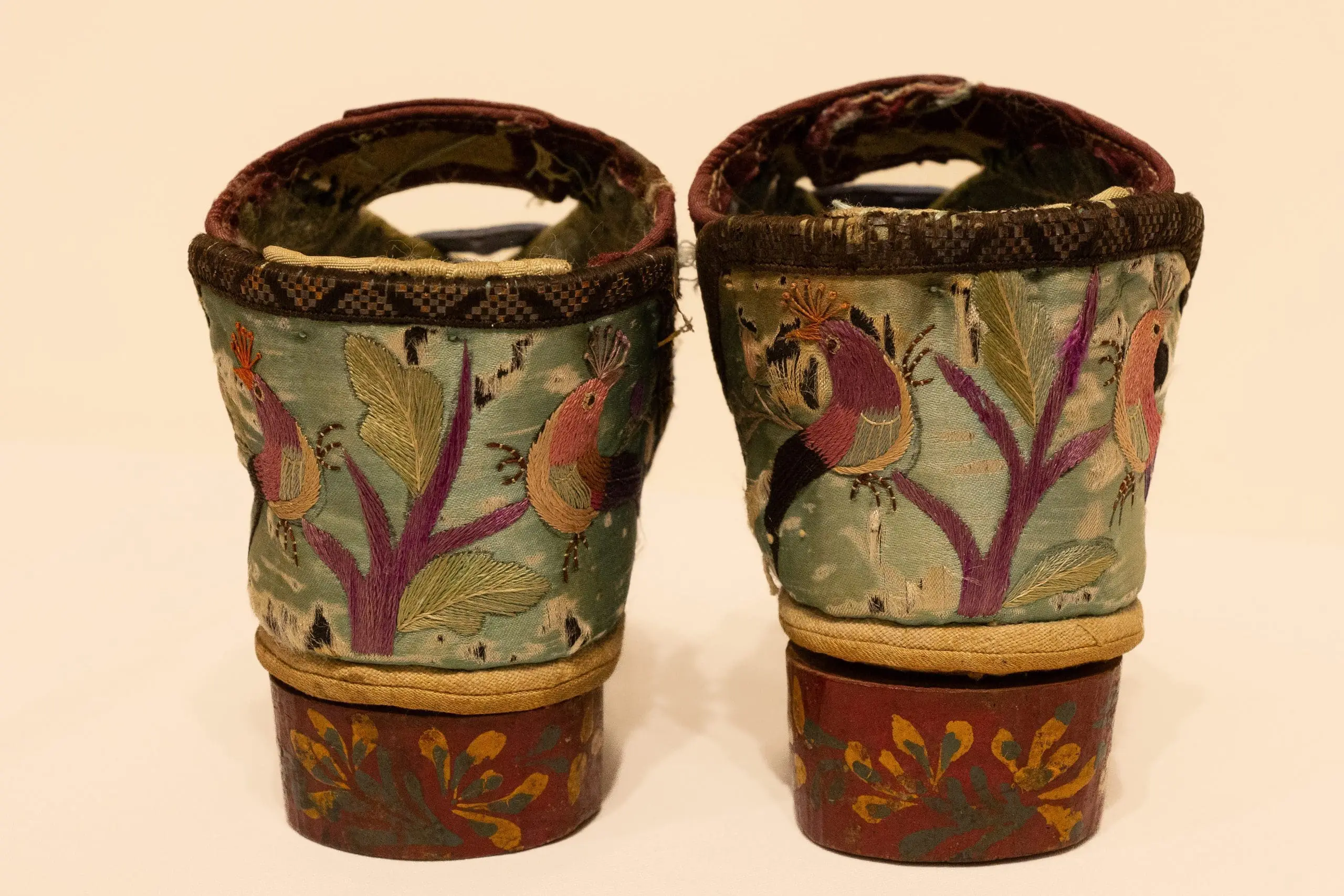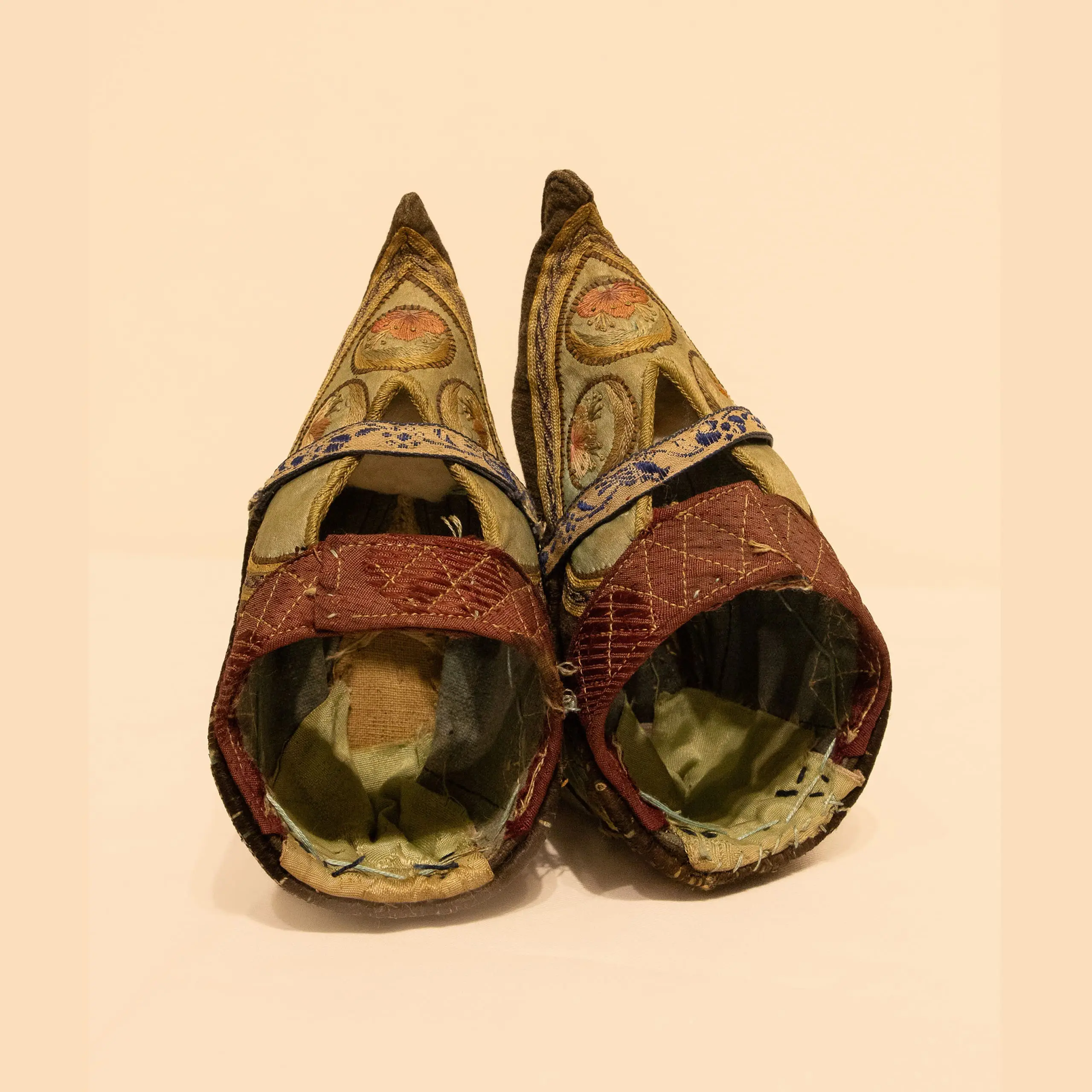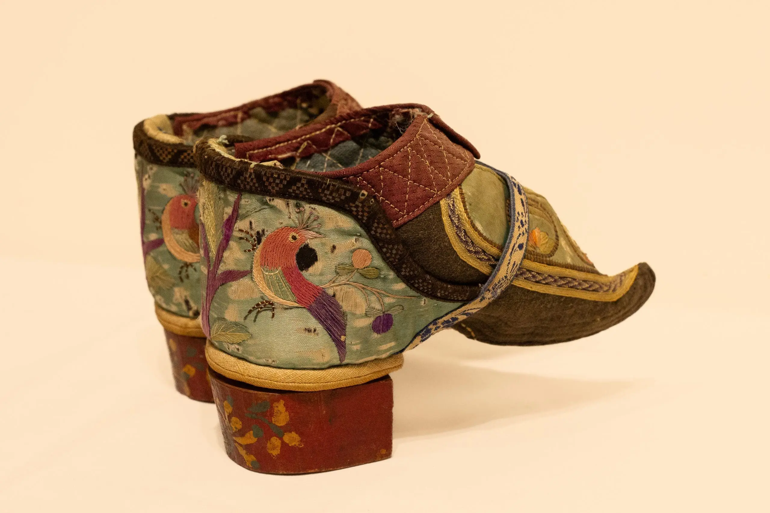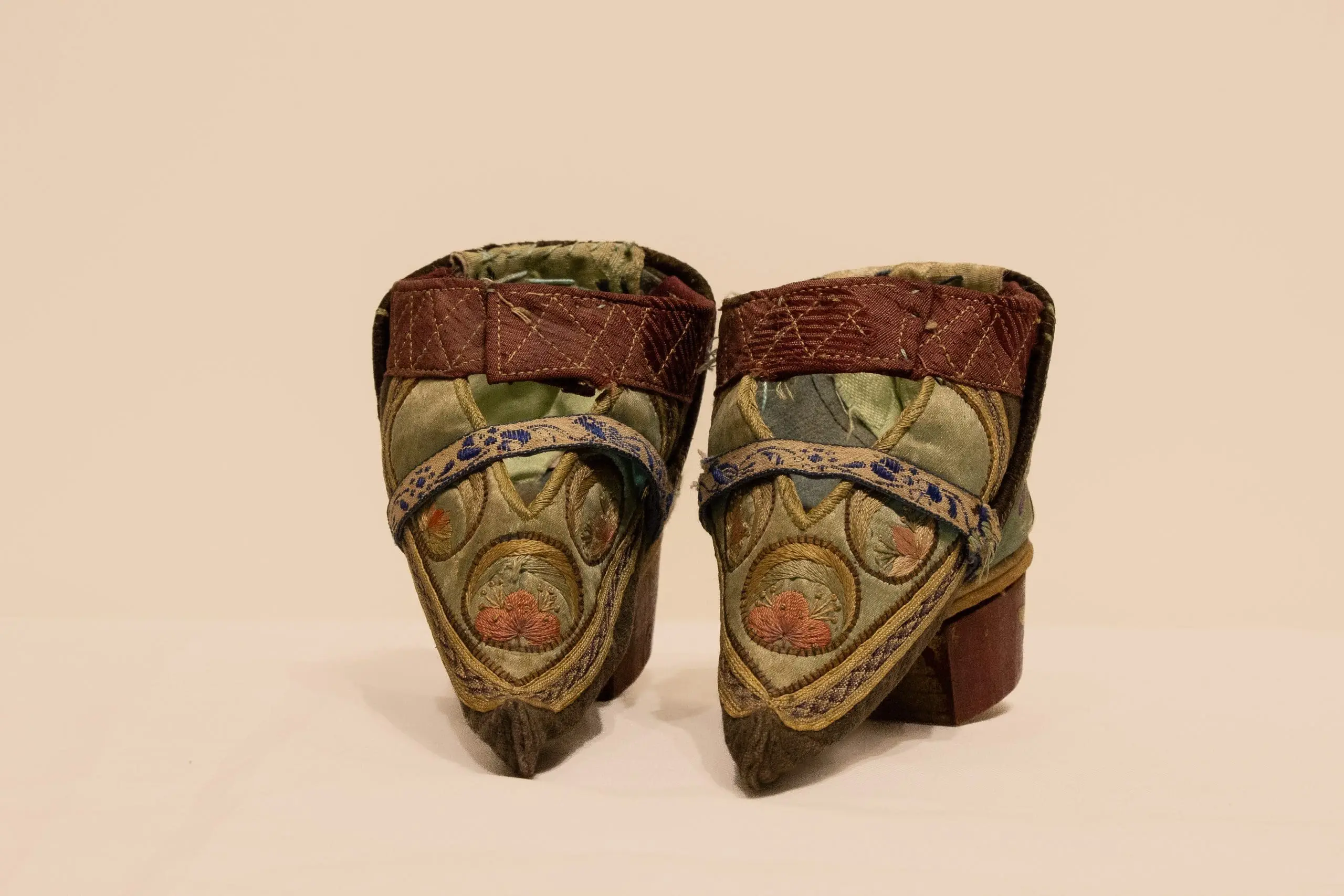 | Description | A pair of late 19th-century Taiwanese lotus shoes are crafted from wood and cotton with finely embroidered floral motifs and hand-painted heels. Once worn by women with bound feet, they reflect the artistry and cultural significance of foot-binding practices in Taiwan during the Qing period. |