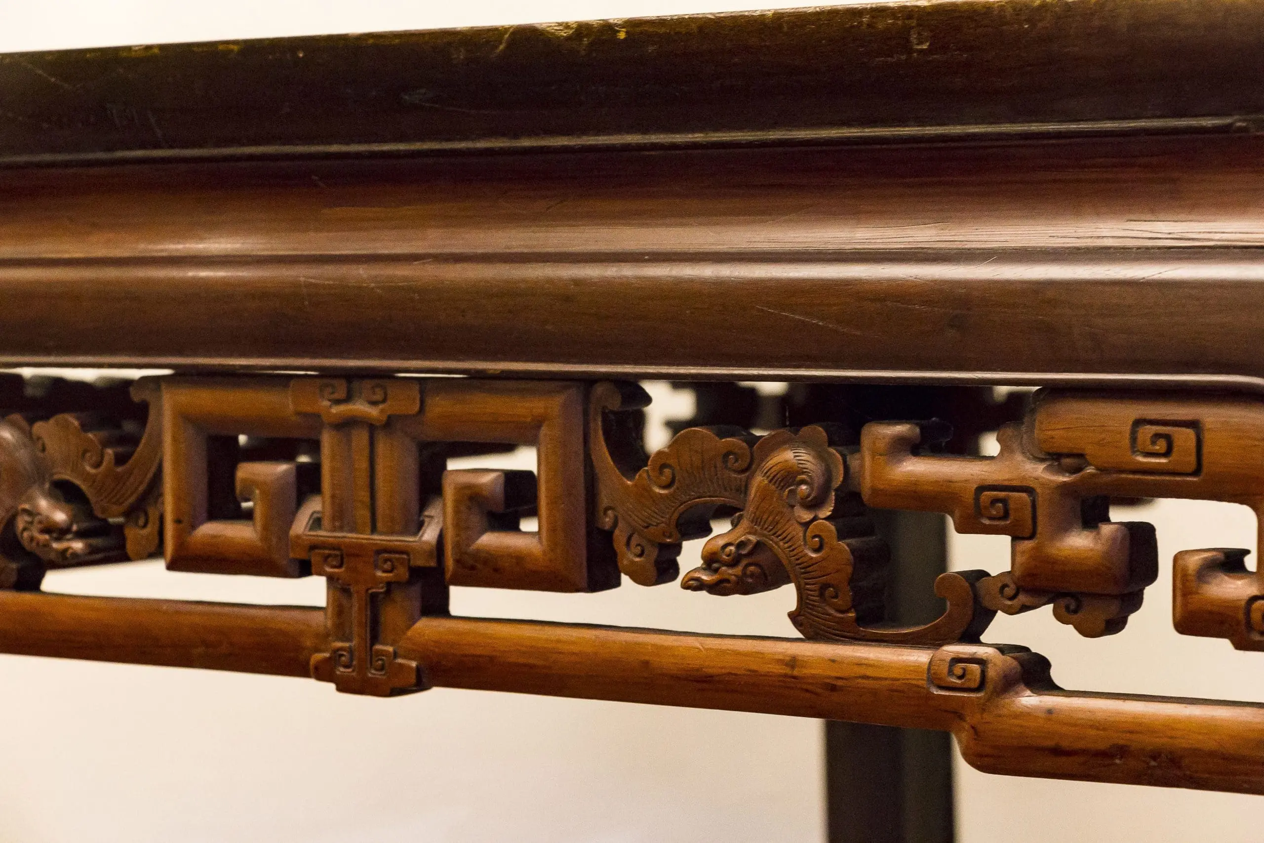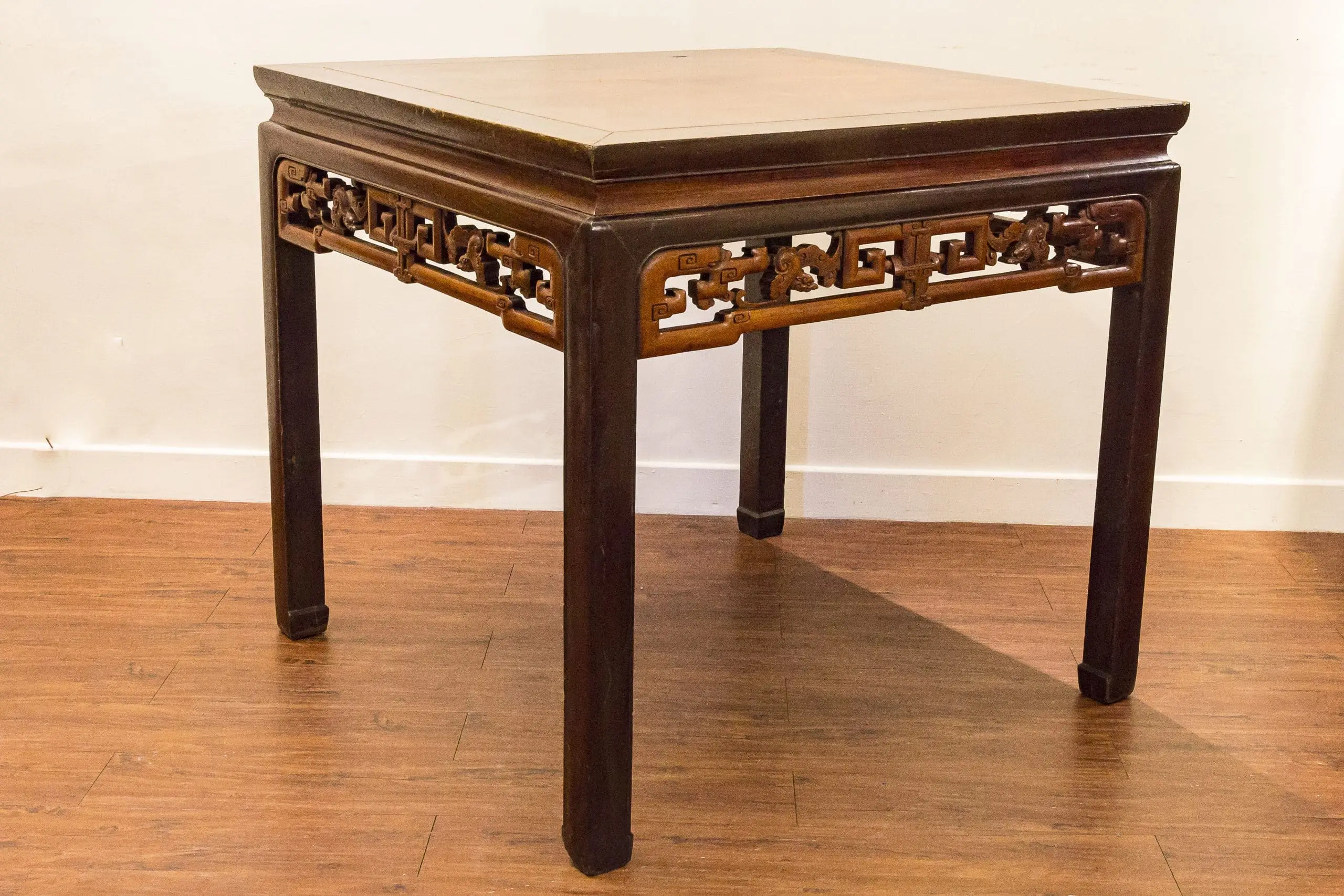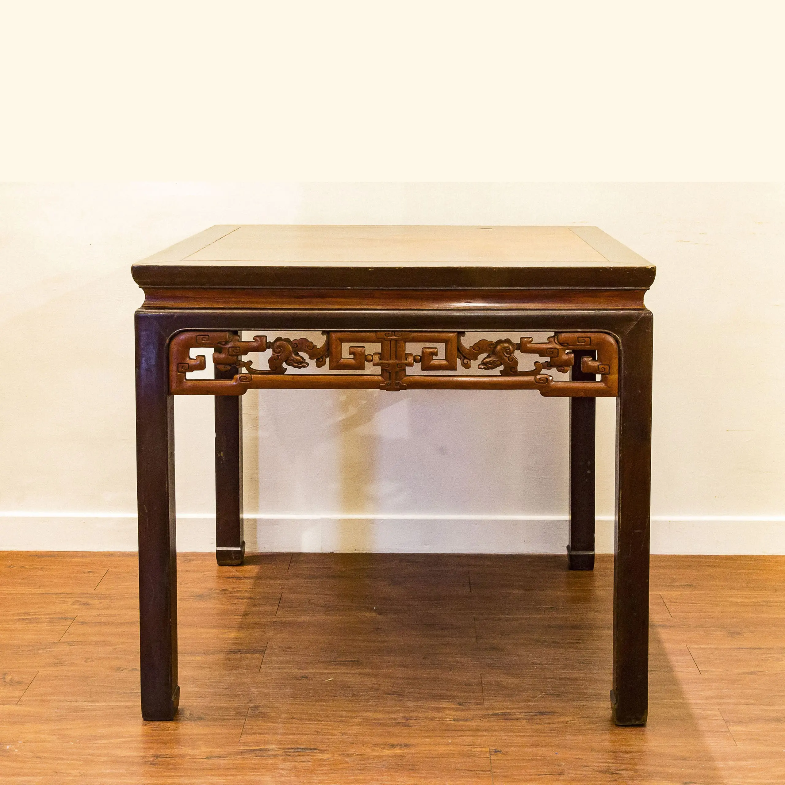 | Description | A rare and unique square offering table of wu shing hsr (inset panel) and jya dung wood , both indigenous woods to taiwan, with perforated dragon heads and fungi inset around 4 sides modified horse hoof legs. |
