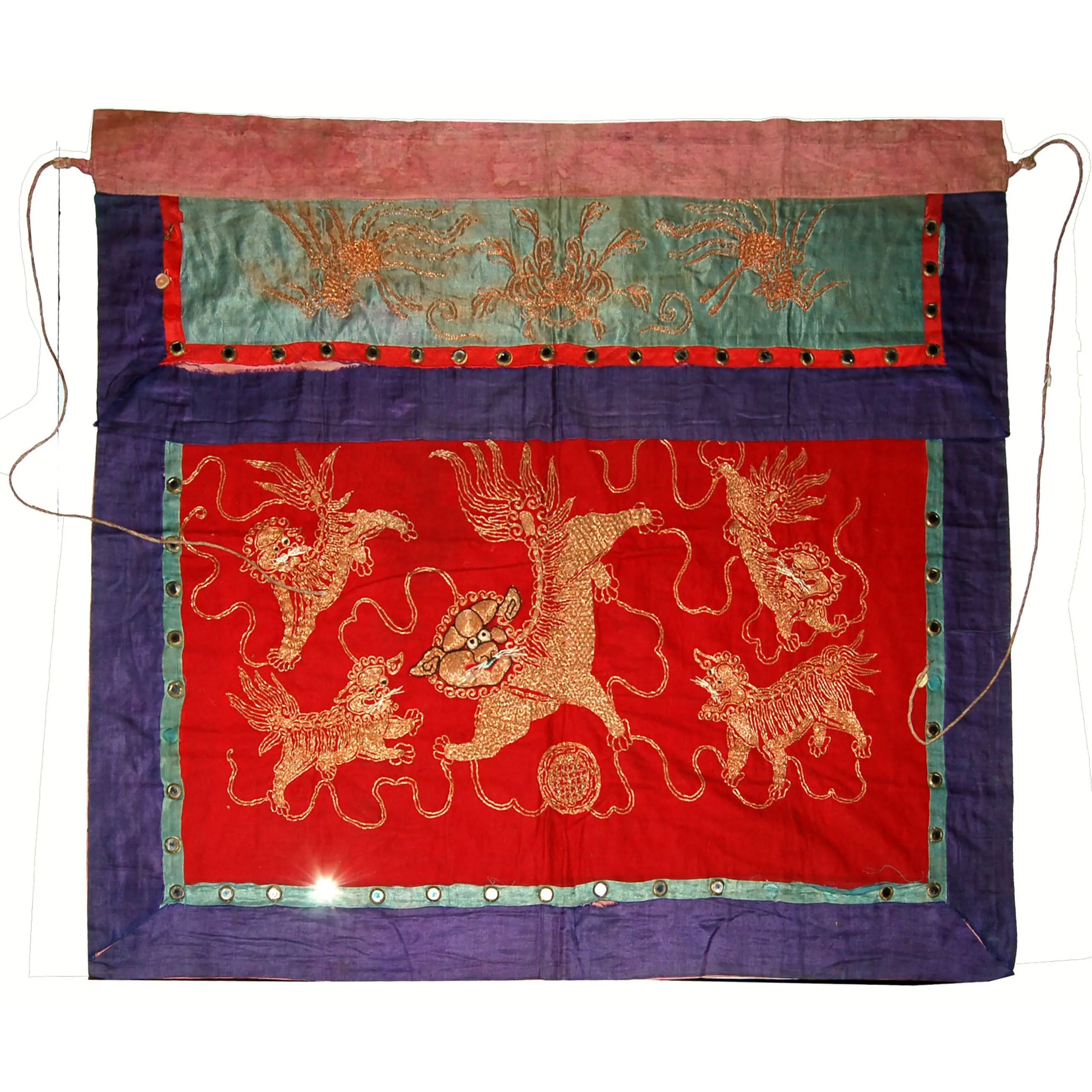 | Description | Late 19th-century Taiwanese temple hanging features five guardian Foo Dogs embroidered in couching stitch on a vibrant red felt ground, symbolizing protection and auspicious energy. Surrounded by a silk border in purple and turquoise. |