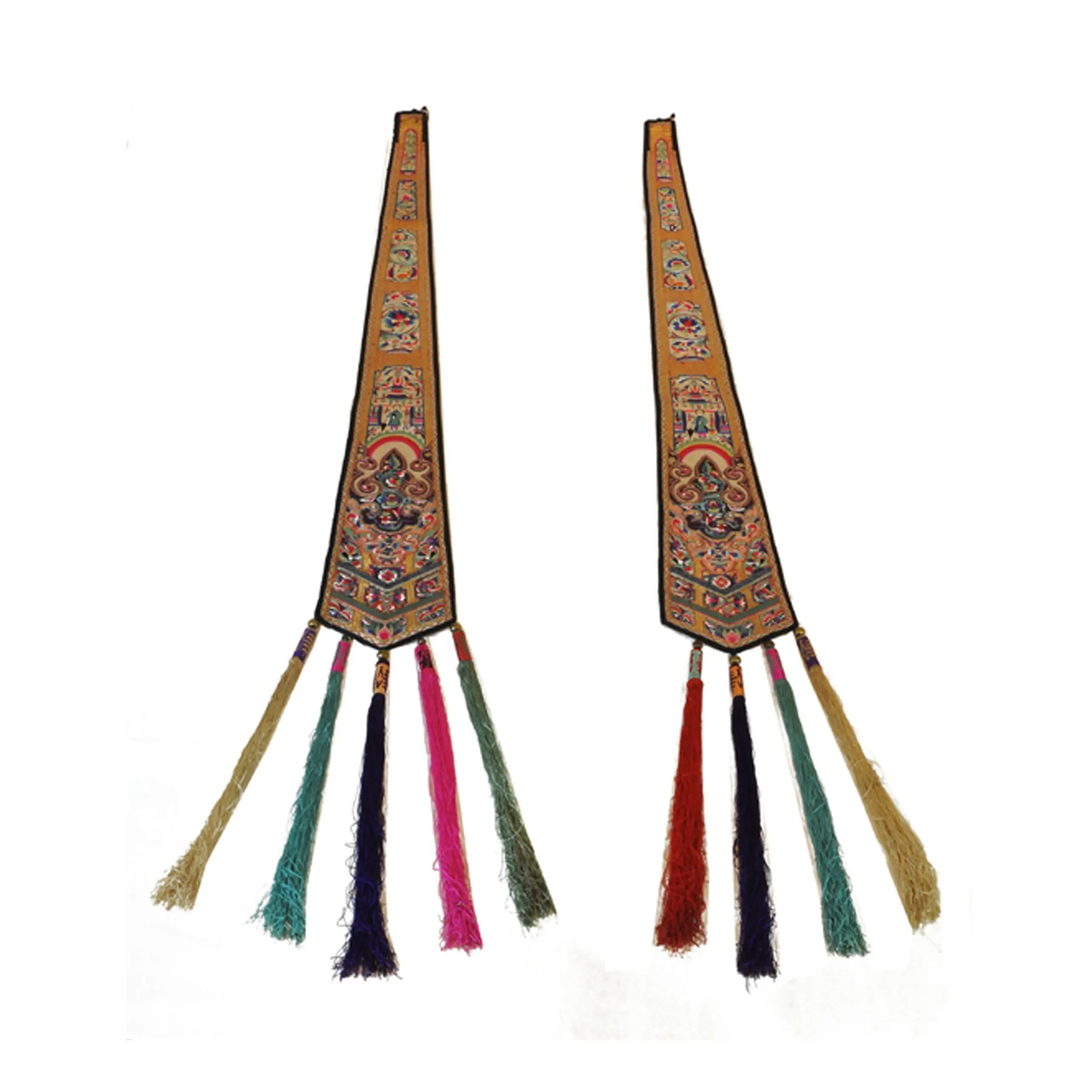 | Description | A pair of late Qing silk bed curtain hangings, finely embroidered in overlay stitch with women, floral sprays, fruits, and auspicious motifs symbolizing fertility and prosperity. The elongated panels taper downward, ending with multicolored silk tassels. |