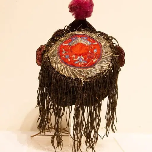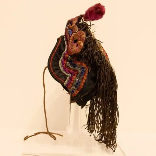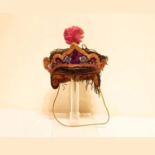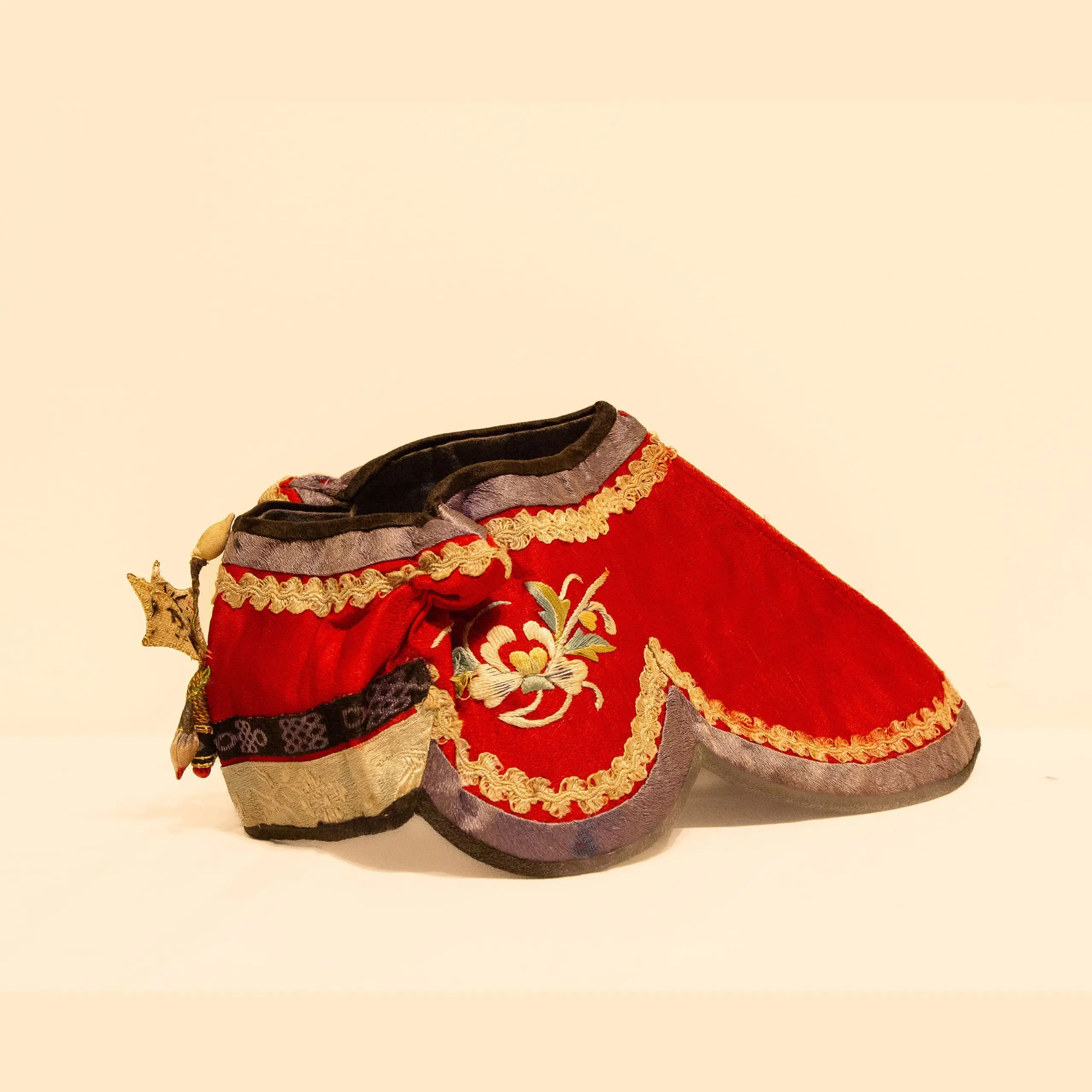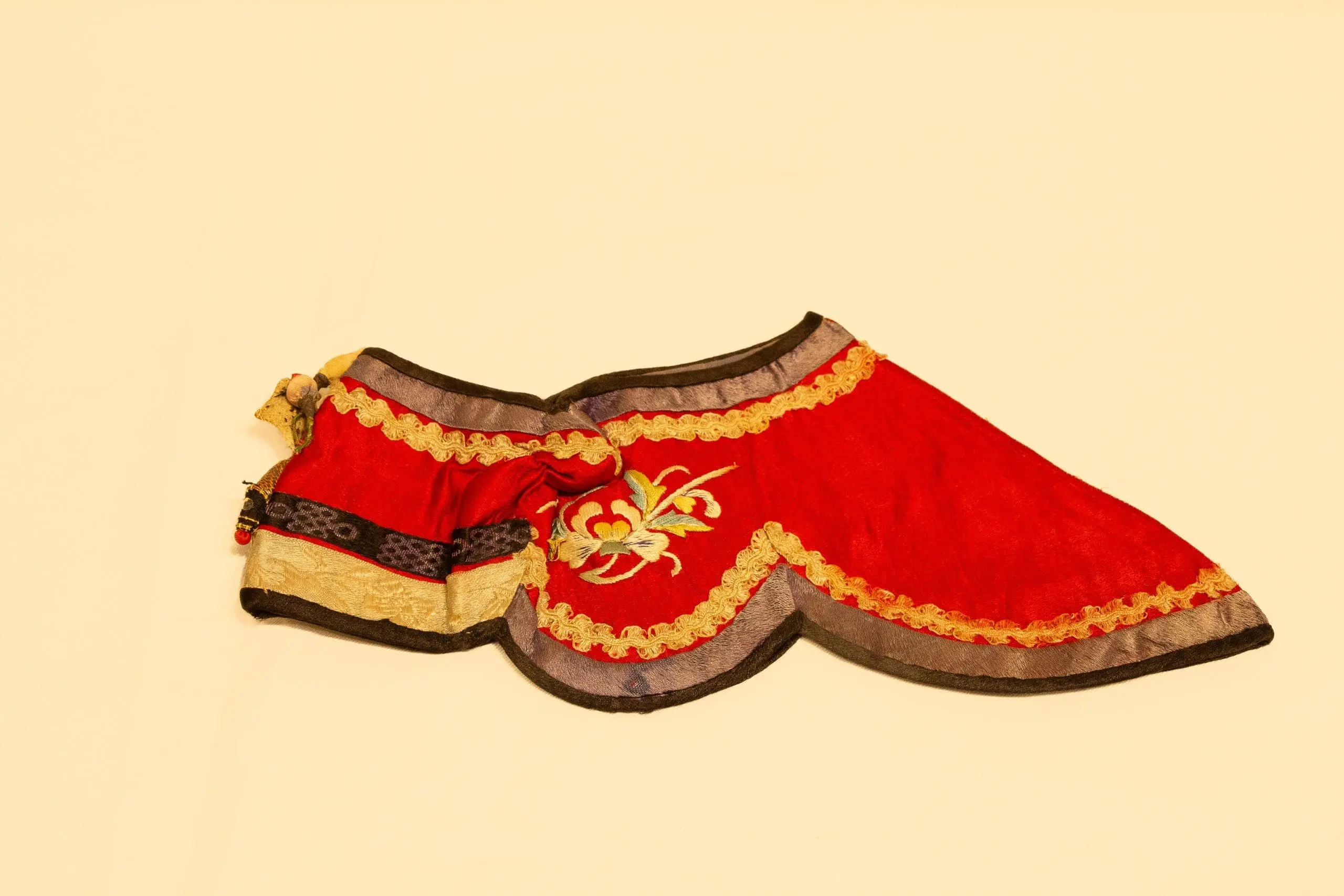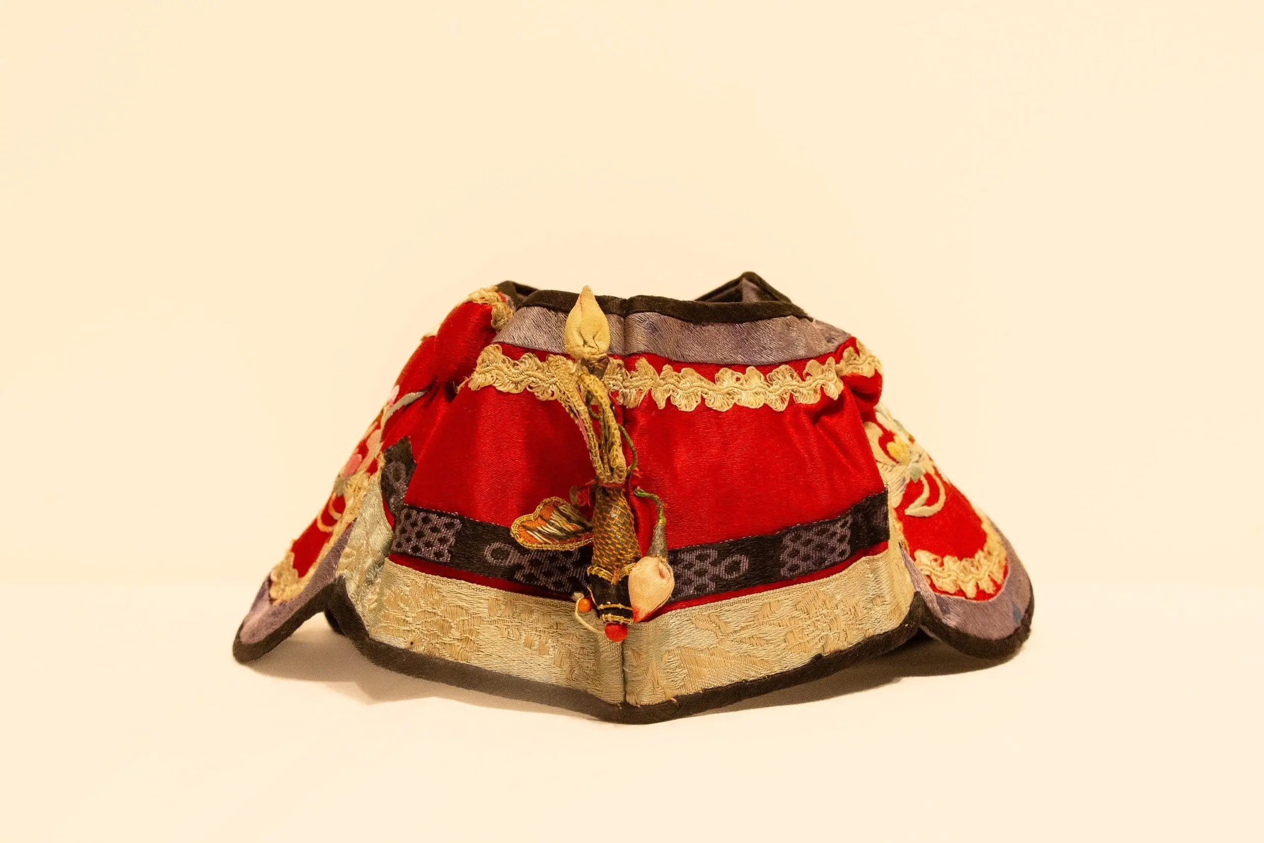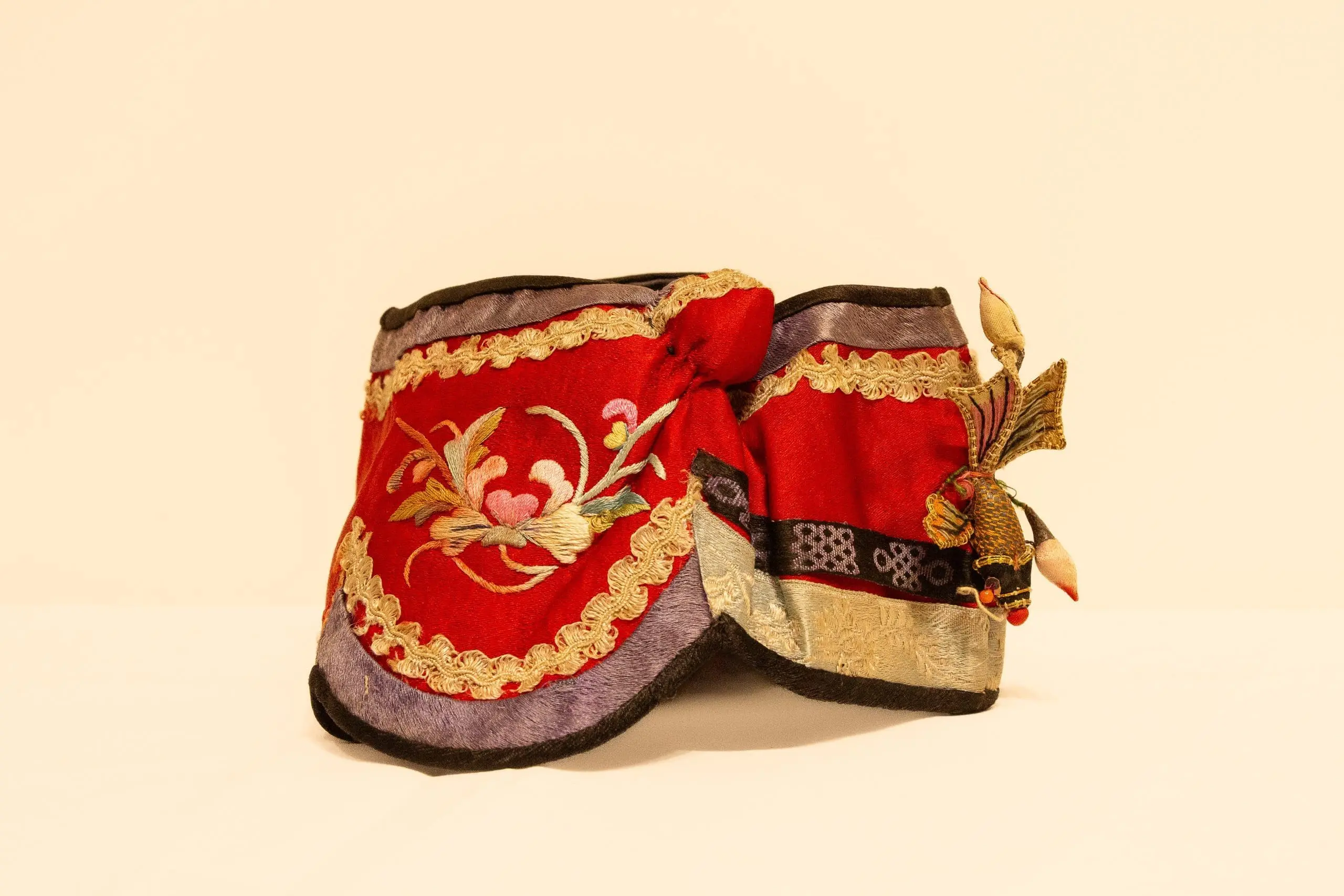 | Description | A late 19th-century Taiwanese embroidered wind hat band, crafted in red silk with multicolored floral embroidery, accented with gold-thread trim and purple edging. The small, curved form was designed for attachment to ceremonial or festive headwear. |