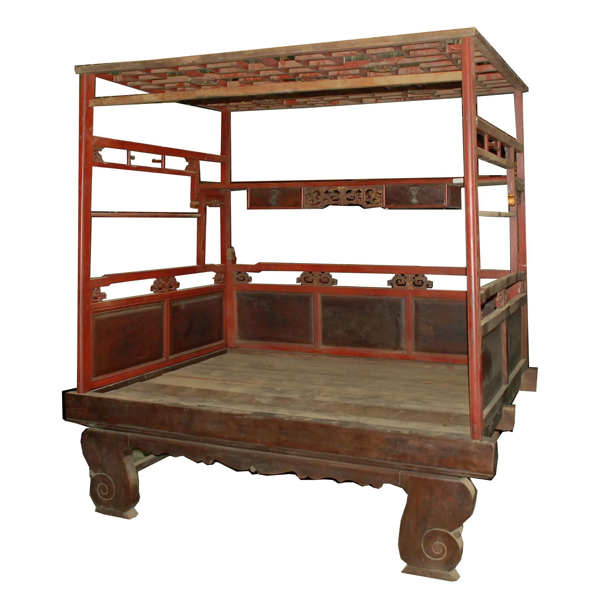 | Description | A fine wedding bed with inset key carvings , ink paintings on the side and back panels, carved base, and its original red/ brown black lacquer. |