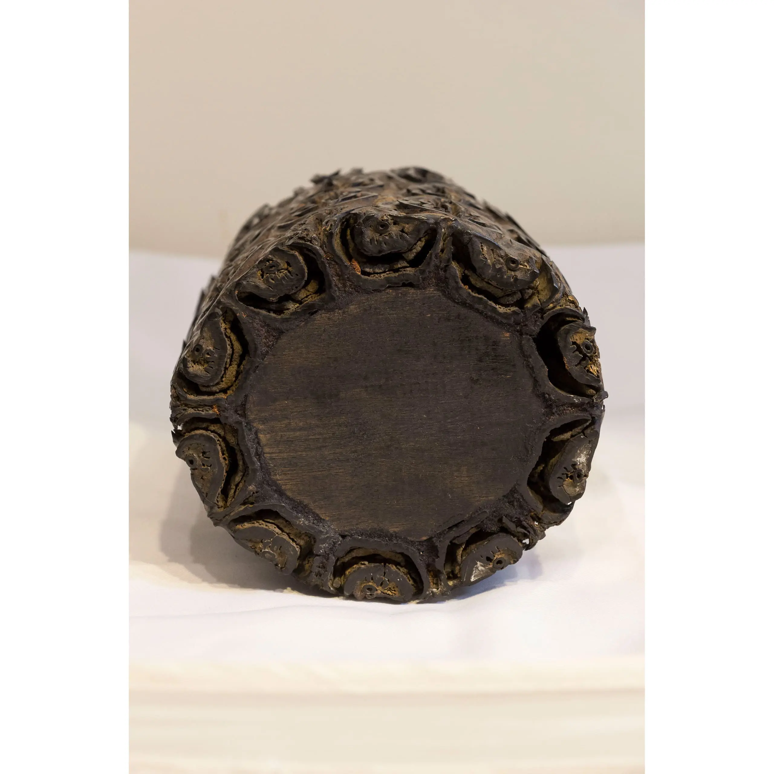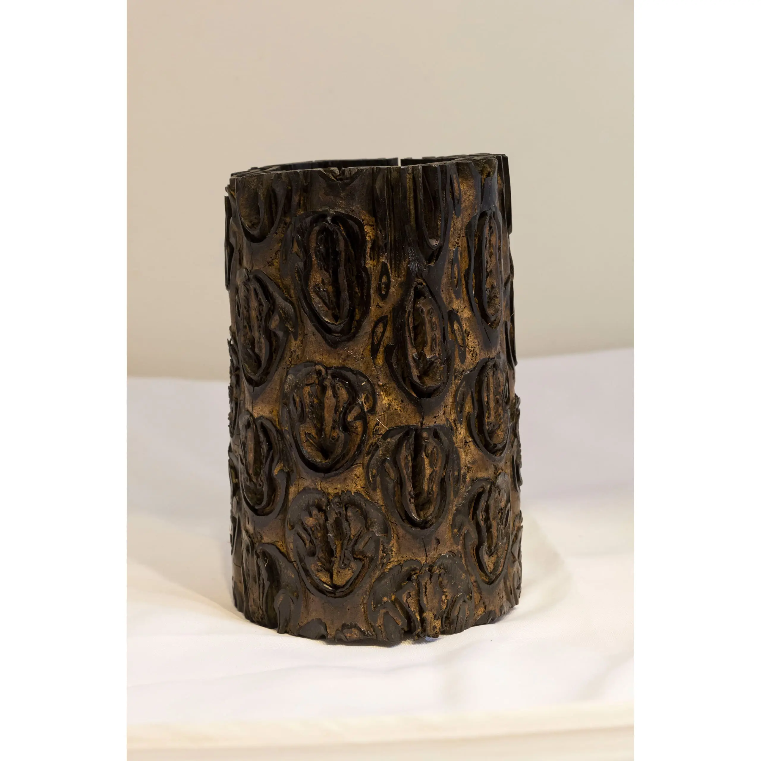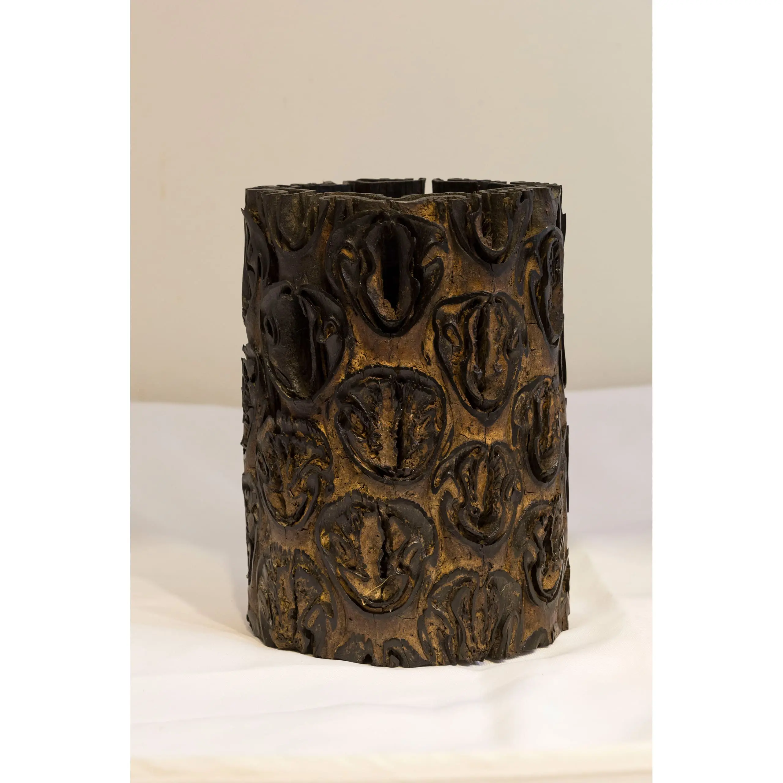 | Description | A cylindrical brush holder intricately carved from a Banksia seed pod, its natural perforated texture forming an organic decorative pattern. The rich brown surface shows a warm patina from age and use. |