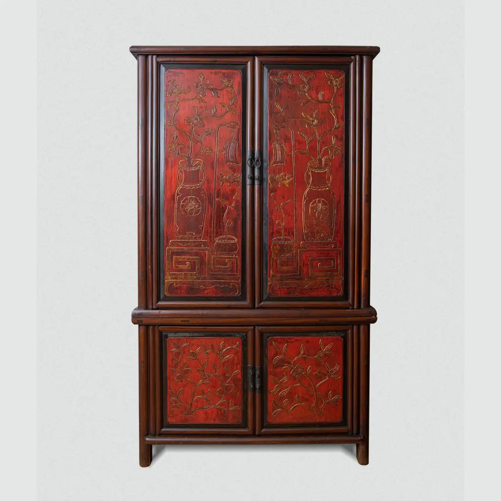 | Description | A large, slightly splayed cabinet and chest set with carved floral designs on the wide opening doors, original gild and red lacquer finish. |