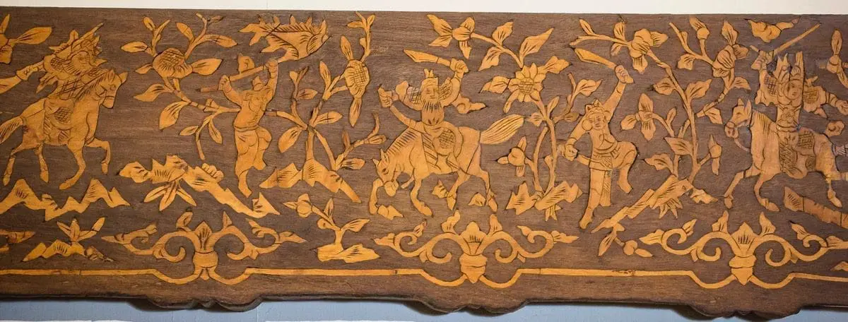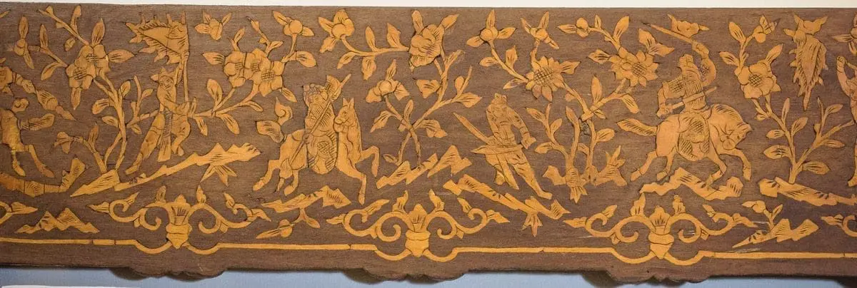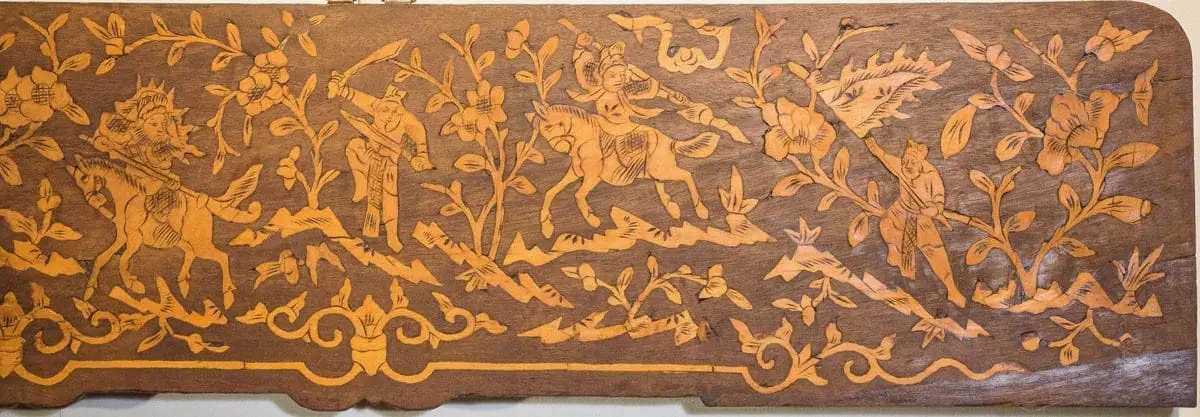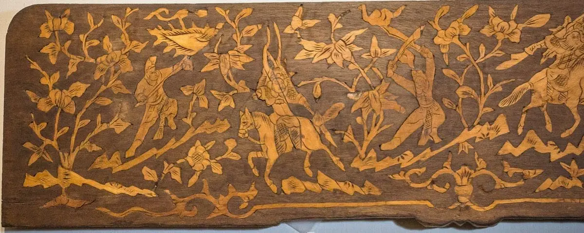 | Description | A rare bed panel with inlaid carvings of a battle scene in a forest of blooming flowers. |