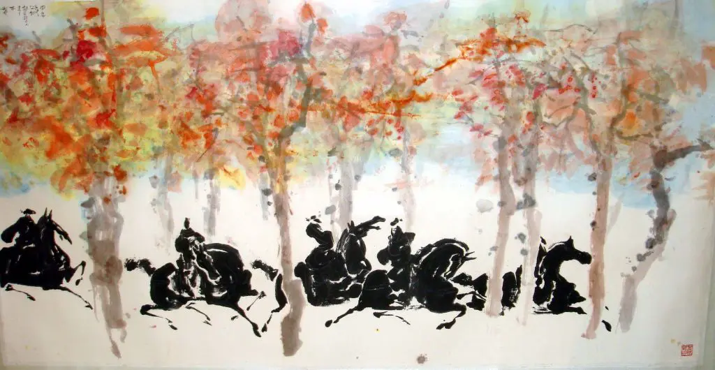 | Description | Chen Chao-pao’s "Riding Horses in the Autumn" is a sweeping ink and color painting blending bold horse silhouettes with impressionistic autumn foliage. Expressive, poetic, and deeply rooted in Chinese brush traditions, it captures the rhythm of motion, memory, and seasonal change with modern fluidity. |