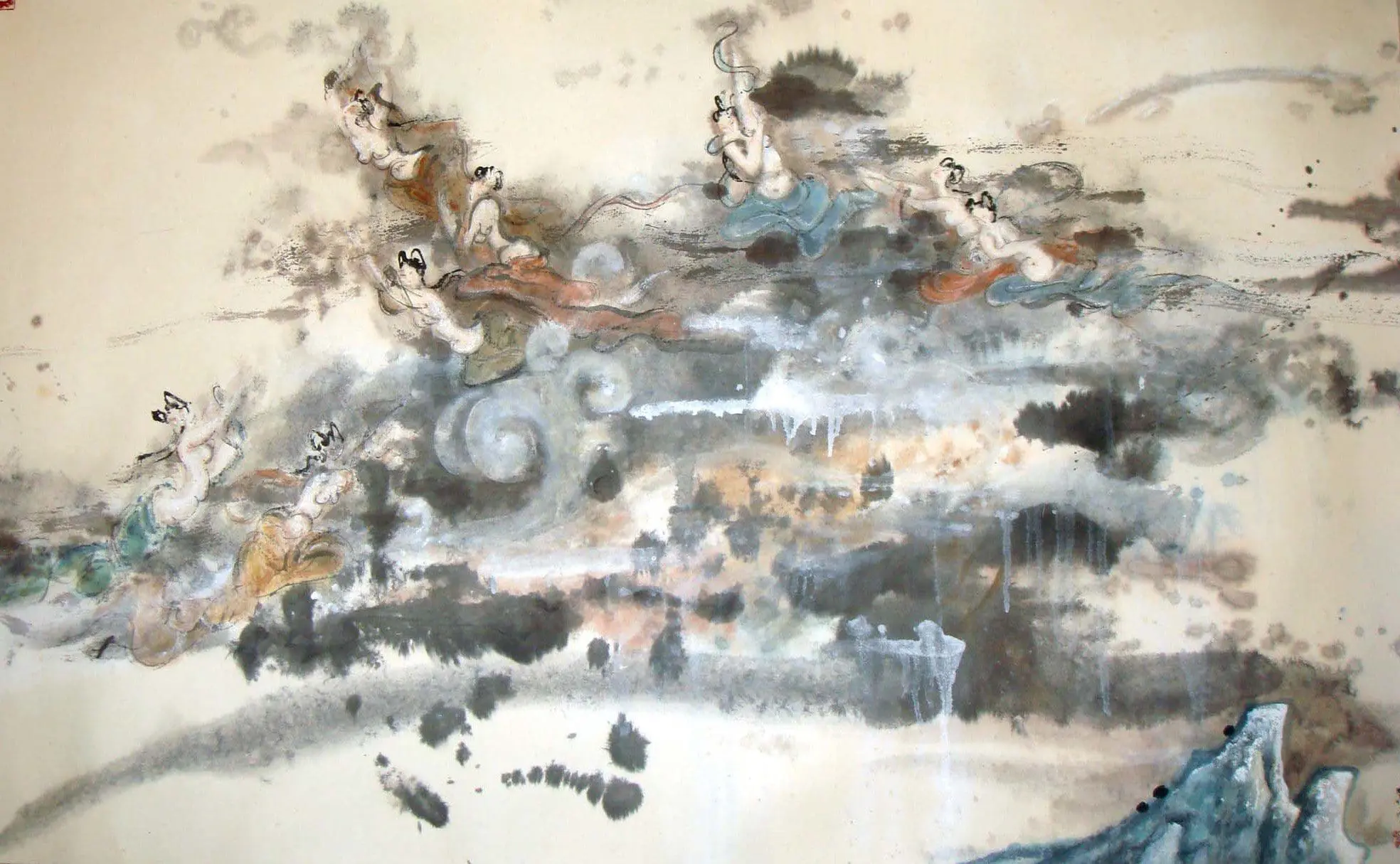 | Description | Chen Chao-pao’s “Dancing for the Heavens Only” portrays celestial maidens floating among swirling clouds and sacred mists. With rhythmic ink washes and graceful figures, it evokes spiritual elevation and mythical elegance, merging Buddhist iconography with expressive brushwork and poetic allusion in a transcendent, dreamlike atmosphere. |