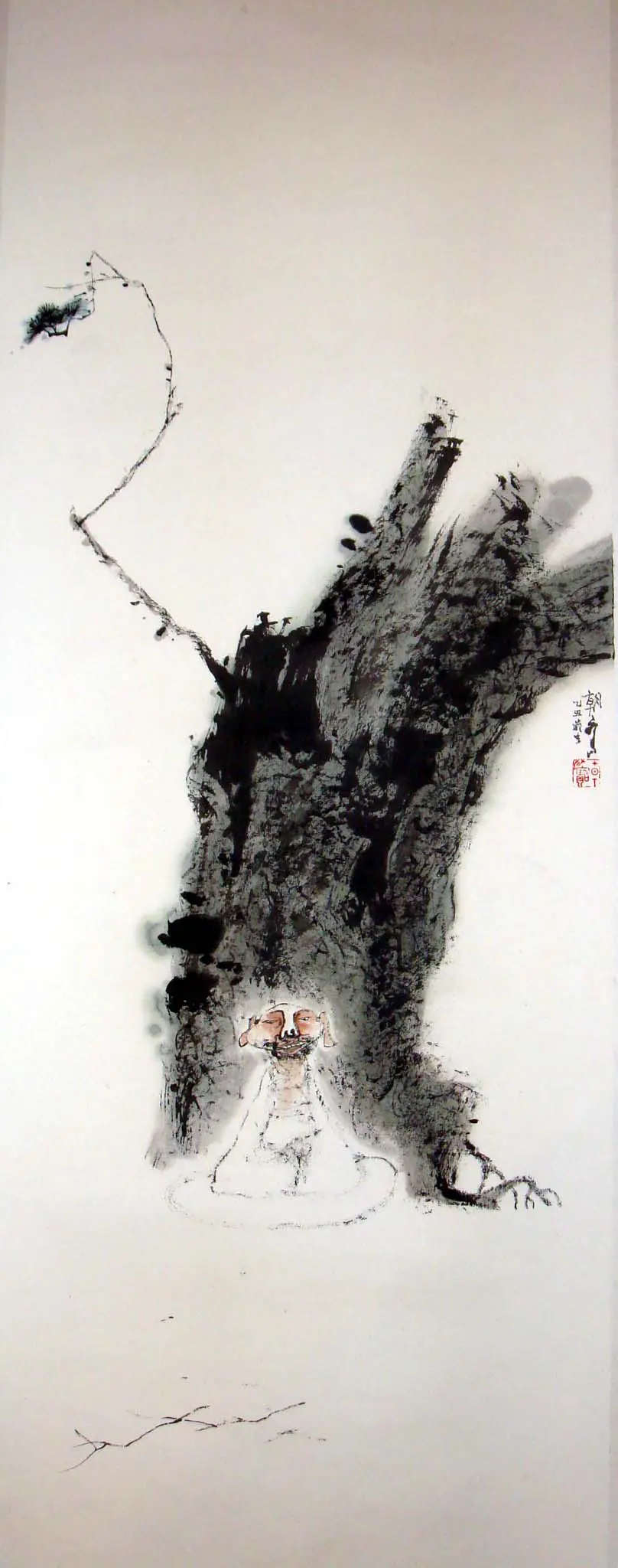 | Description | Chen Chao-pao’s “Lohan Touching Spring” shows a tiny, contented Lohan beneath a towering pine, quietly witnessing spring’s arrival. Minimalist brushwork and bold negative space capture a poetic moment of spiritual joy and seasonal awakening, blending Chan Buddhist themes with expressive modern ink technique. |