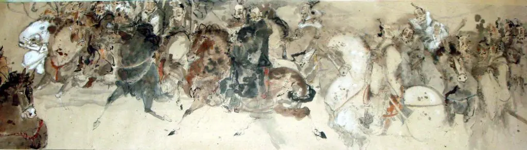 | Description | Chen Chao Pao’s “Cloud of Skirmishers” (59 x 250 cm) captures a cavalry unit in dramatic motion. Dozens of riders and horses surge across the scroll, rendered in expressive brushwork and ink washes. The composition fuses martial choreography with abstraction, conveying energy, tension, and the disciplined chaos of war training. |