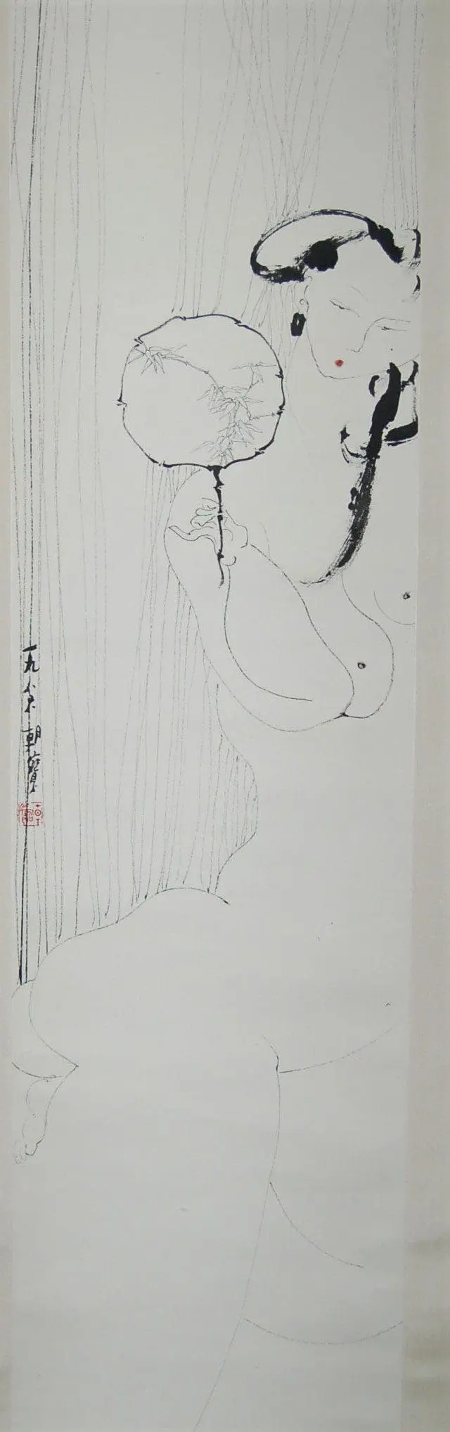 | Description | Chen Chao-pao’s “Cool Breeze” (93 x 26 cm) features a nude woman partially veiled behind cascading lines, holding a silk fan. Minimalist brushwork and subtle red accents evoke elegance, tranquility, and sensual coolness. A masterful interplay of line, form, and negative space, the piece offers poetic stillness and timeless grace. |