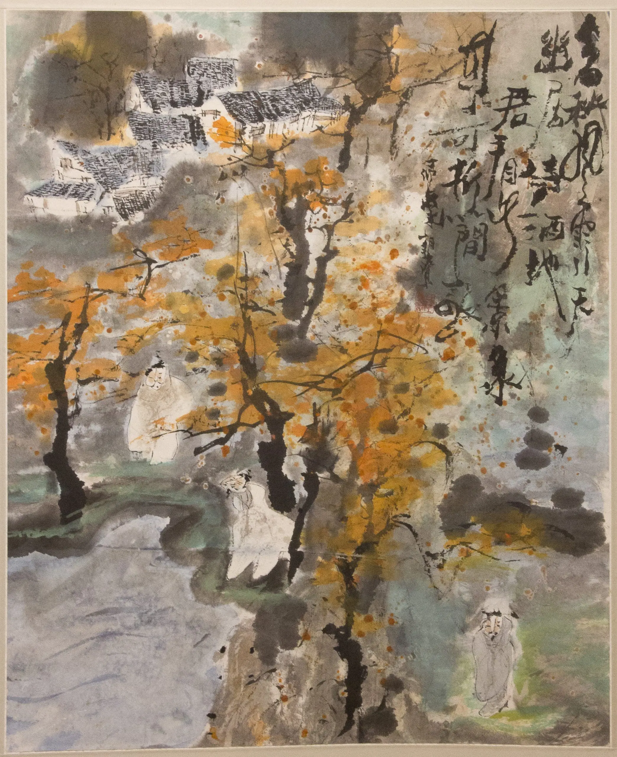 | Description | “Autumn Maples” (紅楓) is an ink and watercolor painting on rice paper. Bold maple foliage in fiery tones frames robed figures wandering through a forested riverbank, while flowing calligraphy enriches the seasonal theme. The work captures the reflective stillness and lyrical motion of autumn in classical style. |