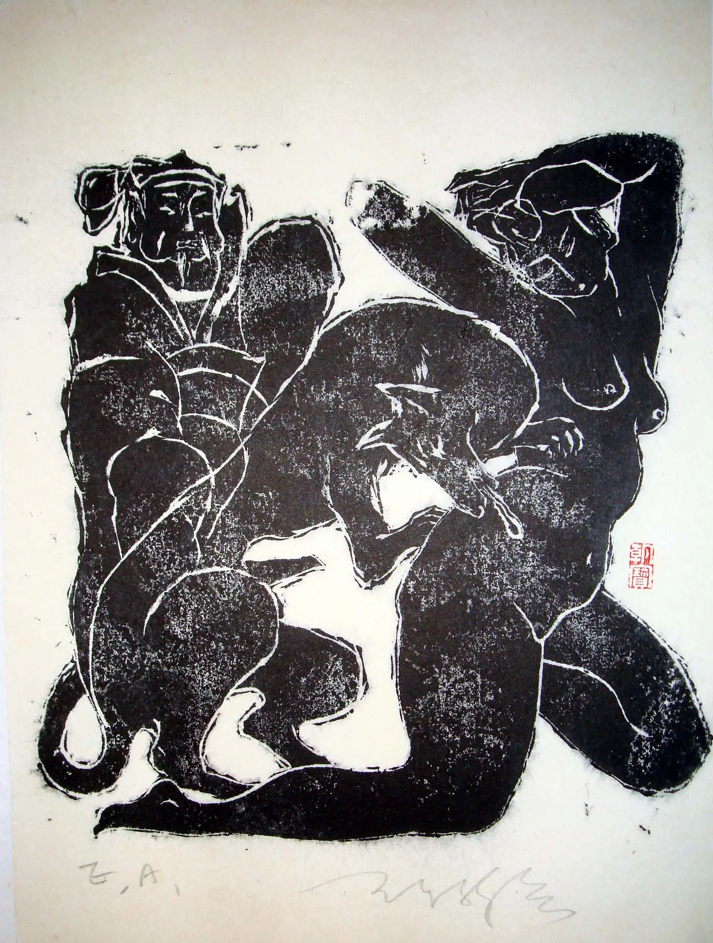 | Description | “In Search of the Gods No. 02” (搜神記之二) is a black ink woodblock print on rice paper. Featuring contorted figures and a fox spirit, the print channels classical Chinese mythology into a raw, symbolic visual language of transformation, duality, and spiritual confrontation. Signed and sealed. |