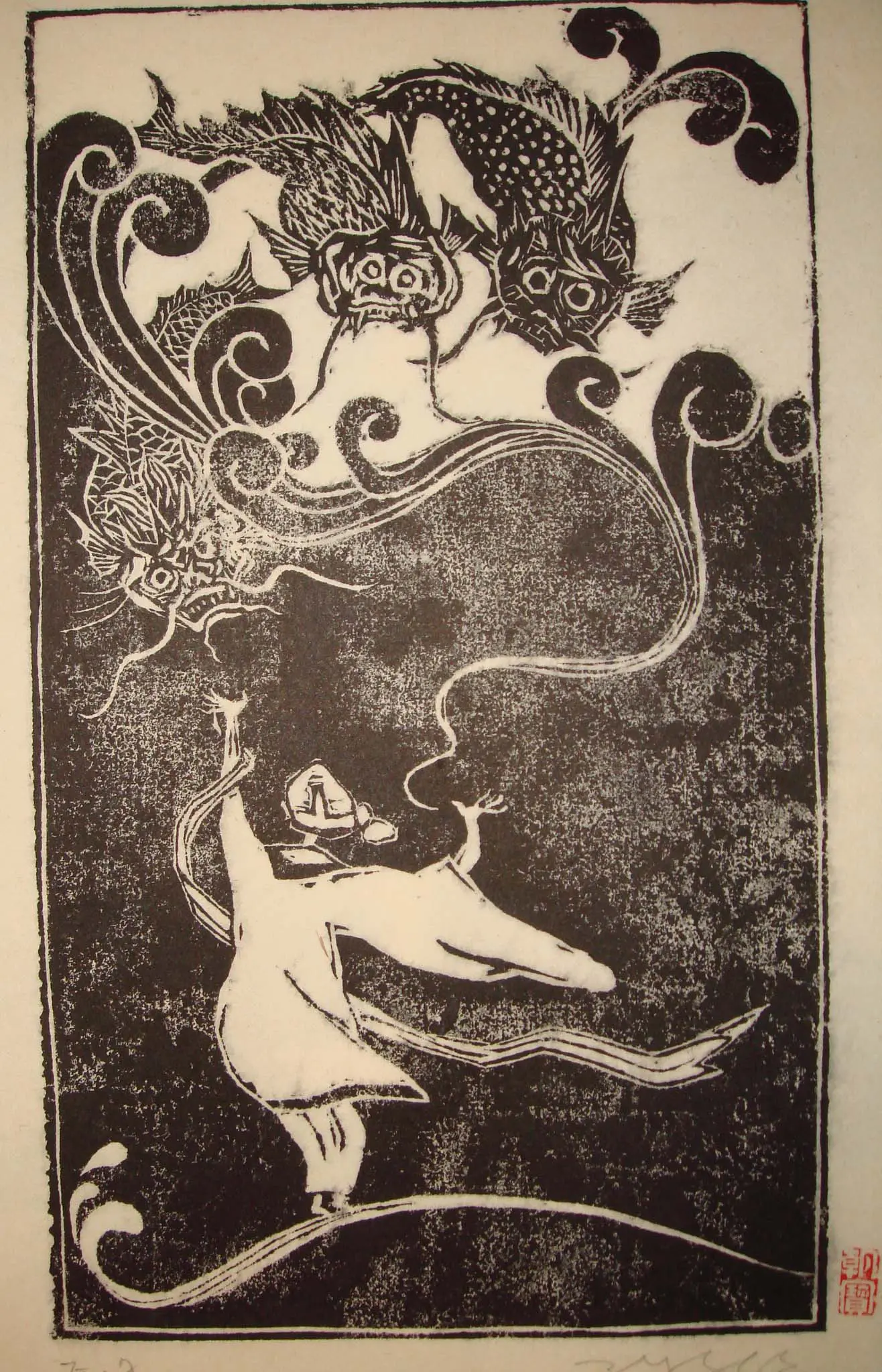 | Description | “In Search of the Gods No. 7” (搜神記之七) is a woodblock print on rice paper. A solitary figure reaches upward toward three swirling dragons, suggesting mystical revelation. Bold curves and strong contrast create a dramatic, dreamlike scene drawn from Chinese folklore and rendered in modern expressionist style. |