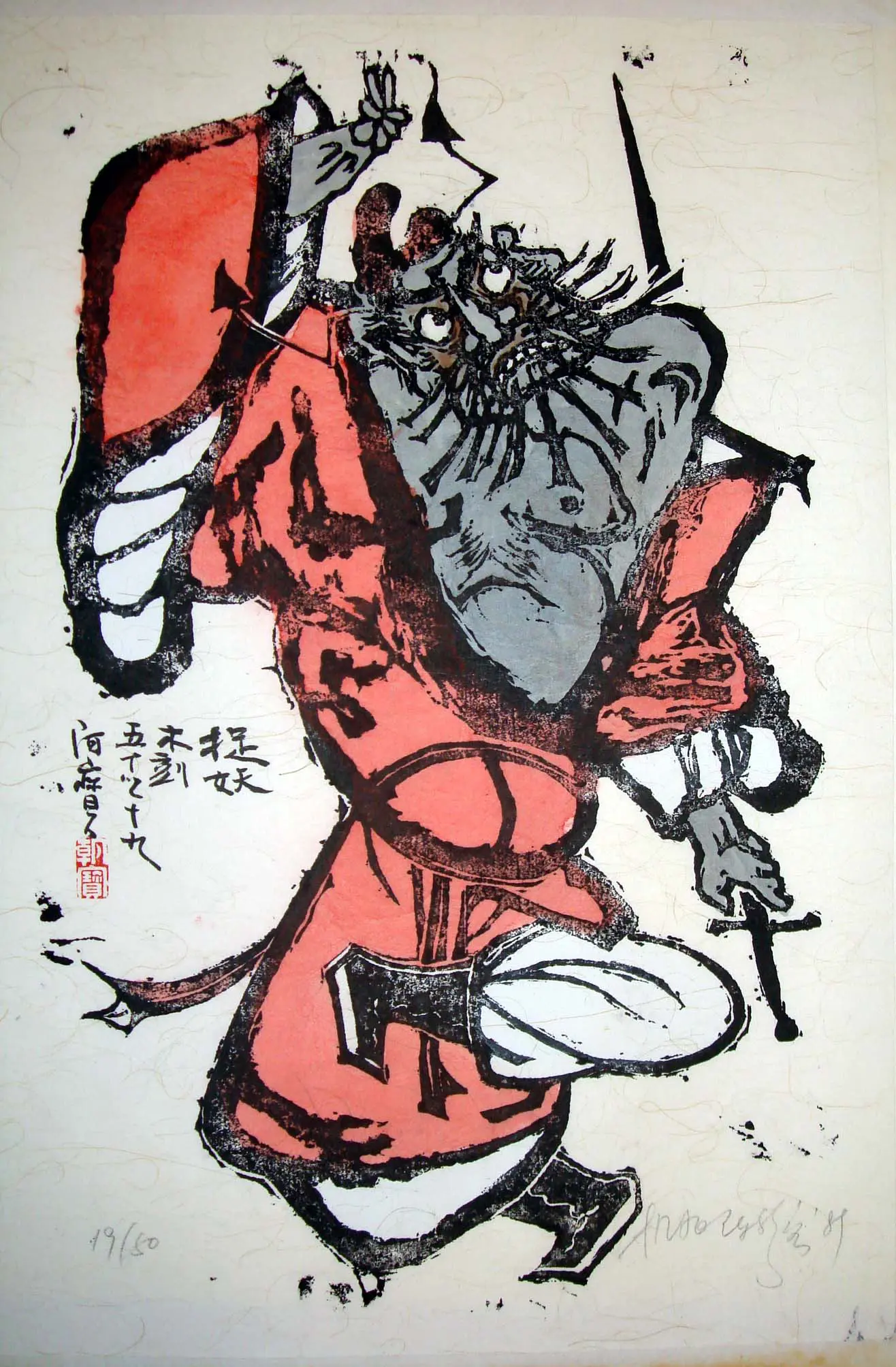 | Description | “Zhong Kwei (Fighting Ghost)” 鍾馗 is a mixed-media lithograph and watercolor on rice paper. The ghost-fighting deity charges forward in fierce red robes, rendered in expressive strokes and stylized power. A vivid, contemporary tribute to a timeless protector, it balances mythic tradition with modern graphic energy. |