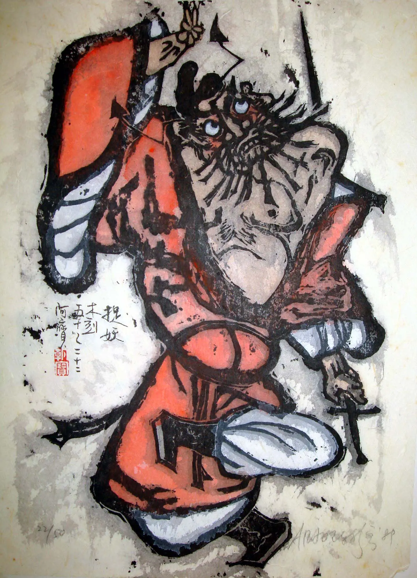 | Description | “Zhong Kwei (Fighting Ghost)” 鍾馗 is a mixed-media lithograph and watercolor on rice paper. The ghost-fighting deity charges forward in fierce red robes, rendered in expressive strokes and stylized power. A vivid, contemporary tribute to a timeless protector, it balances mythic tradition with modern graphic energy. |
