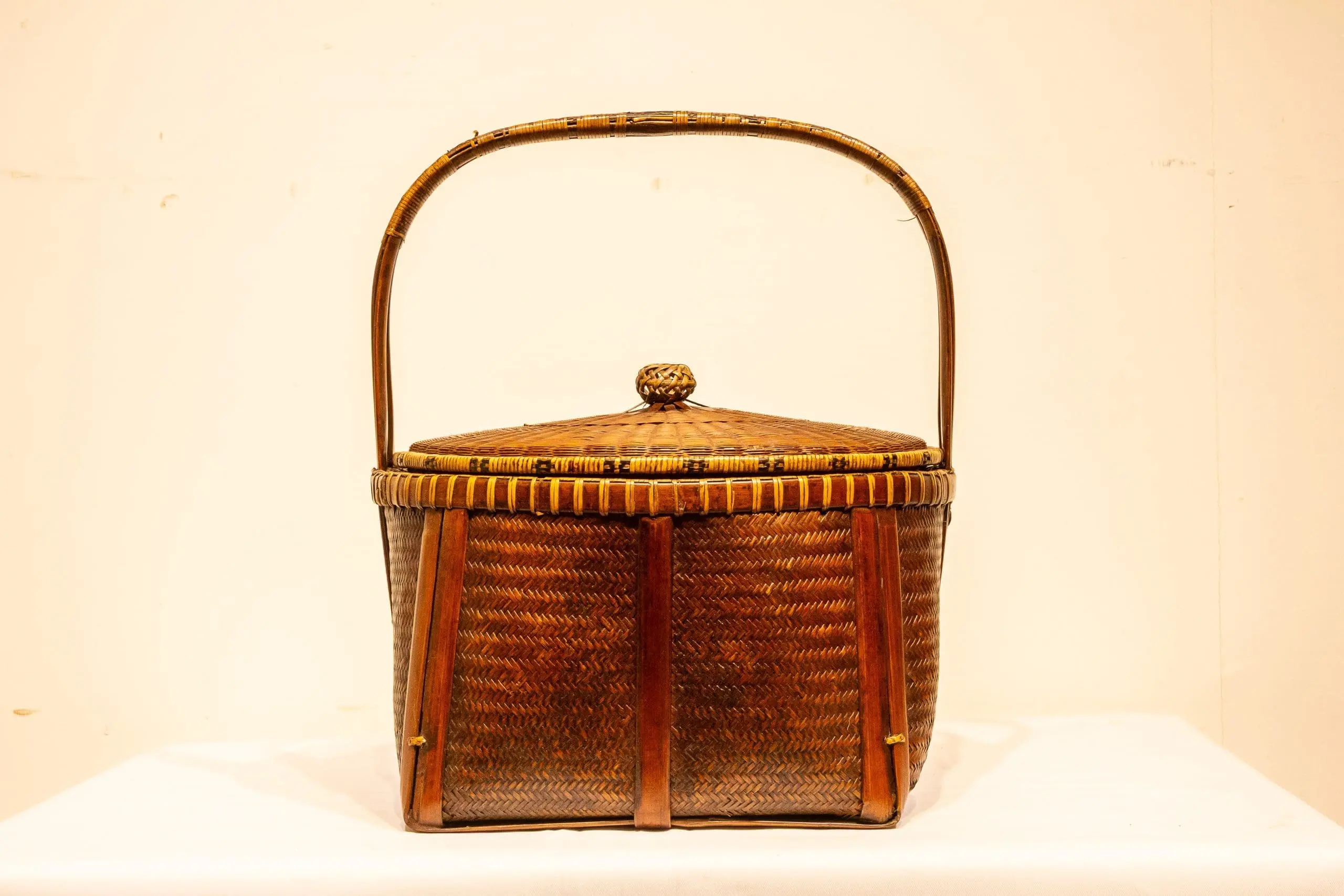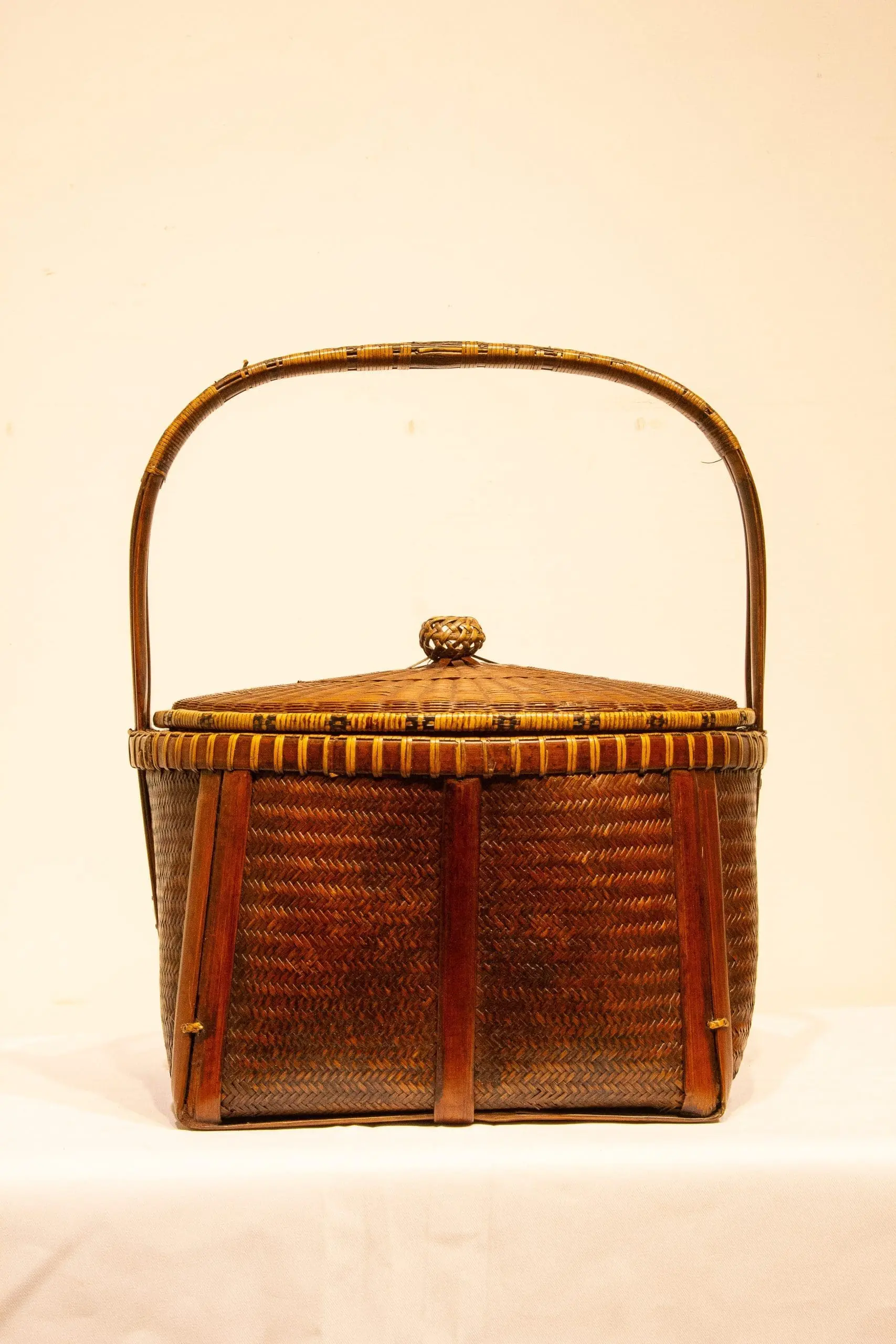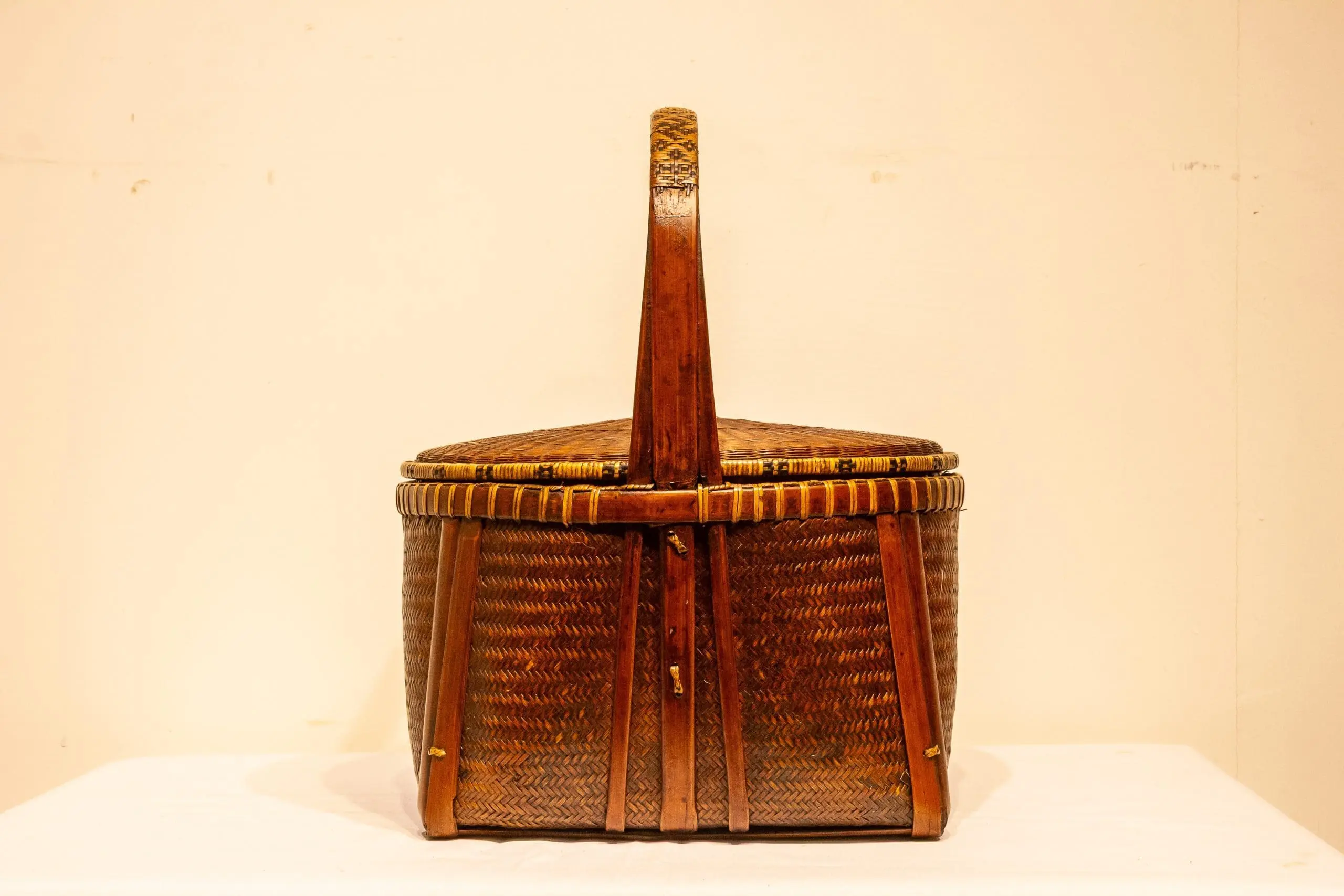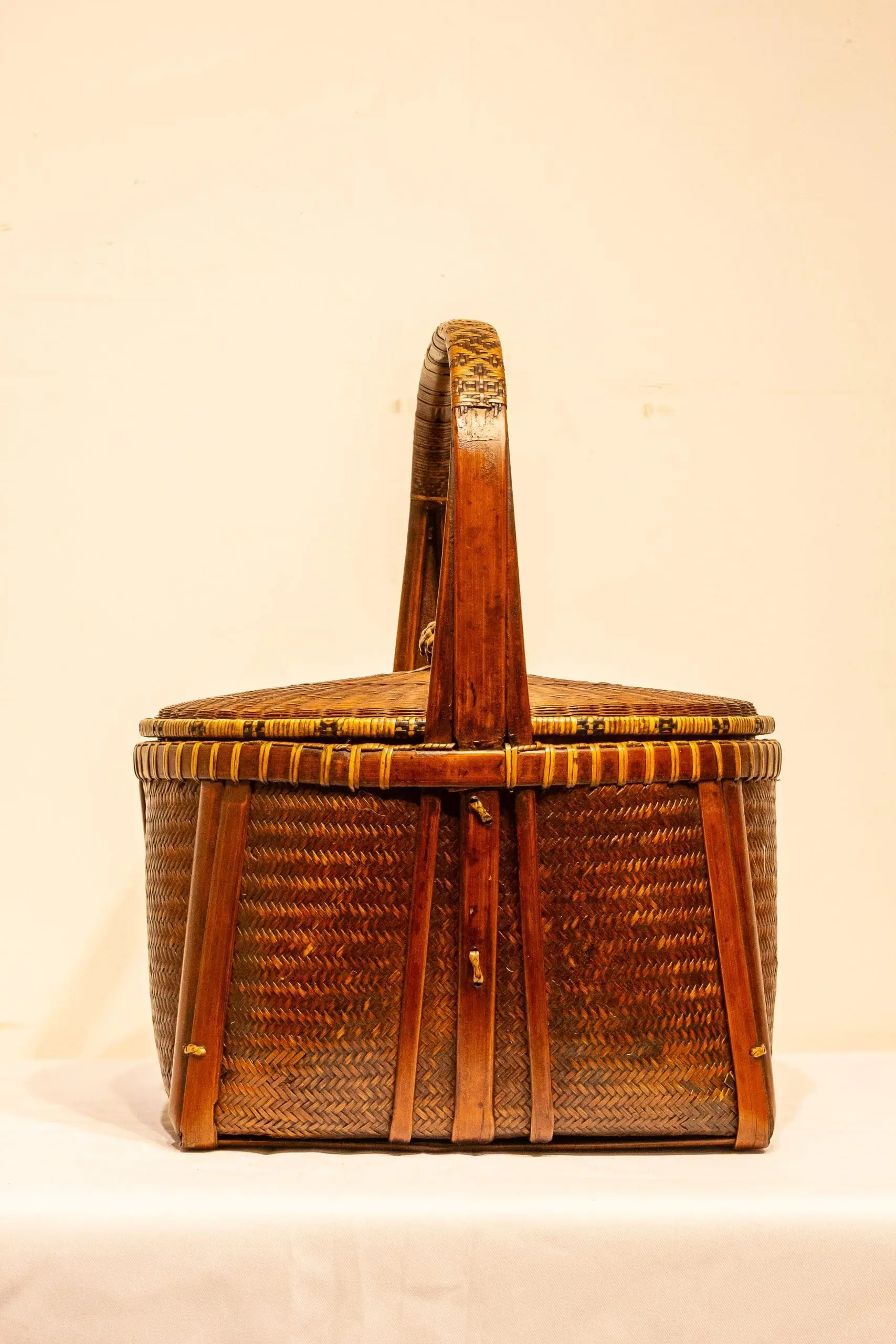 | Description | A refined Chinese lidded carrying basket, early Republic period, of rectangular silhouette with rounded corners and high arched handle. Tight split-bamboo plait with chevron panels, stepped rim binding, and domed cover topped by a woven knop. Warm honey-brown patina from use; wooden vertical struts reinforce the sides and base stability. |