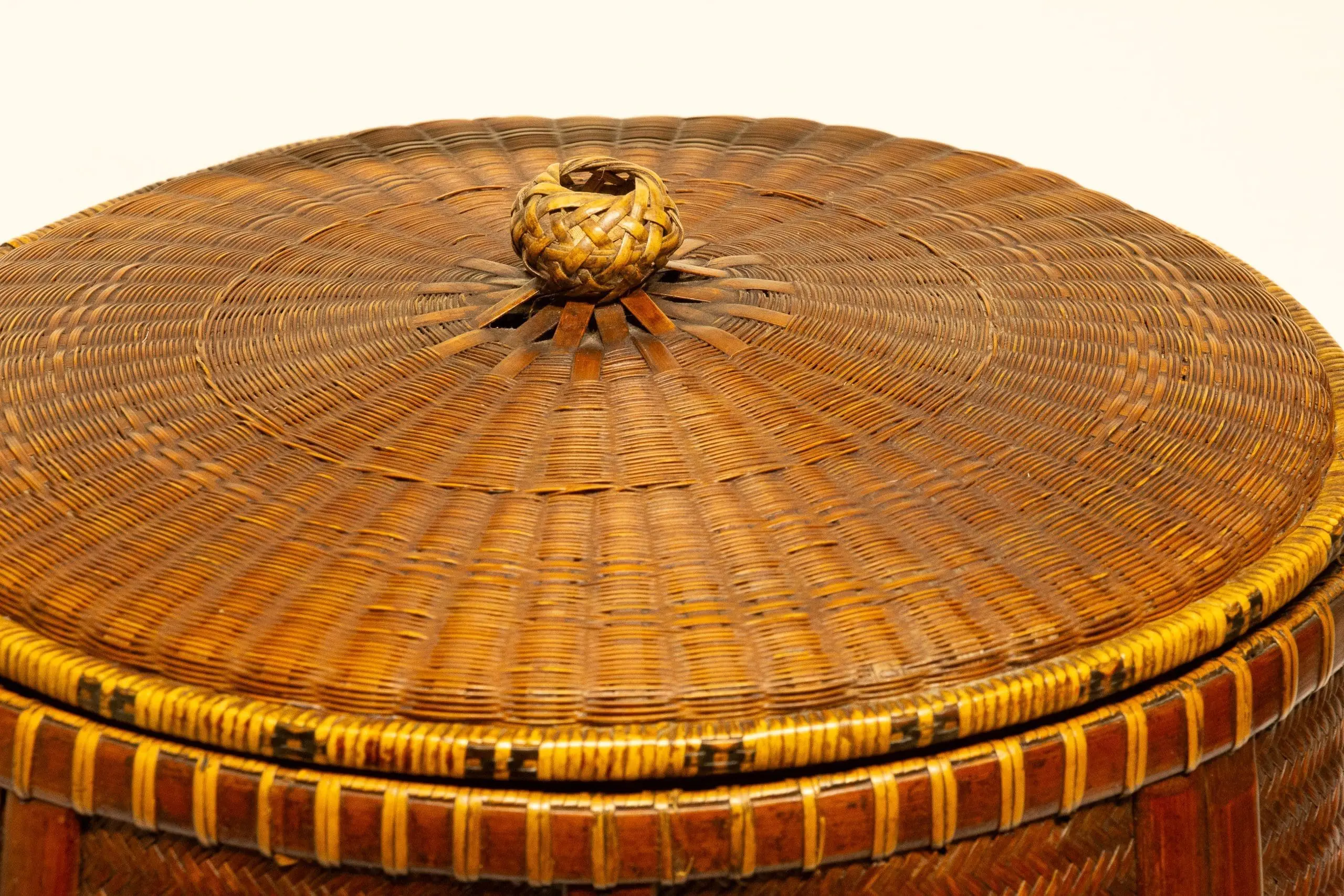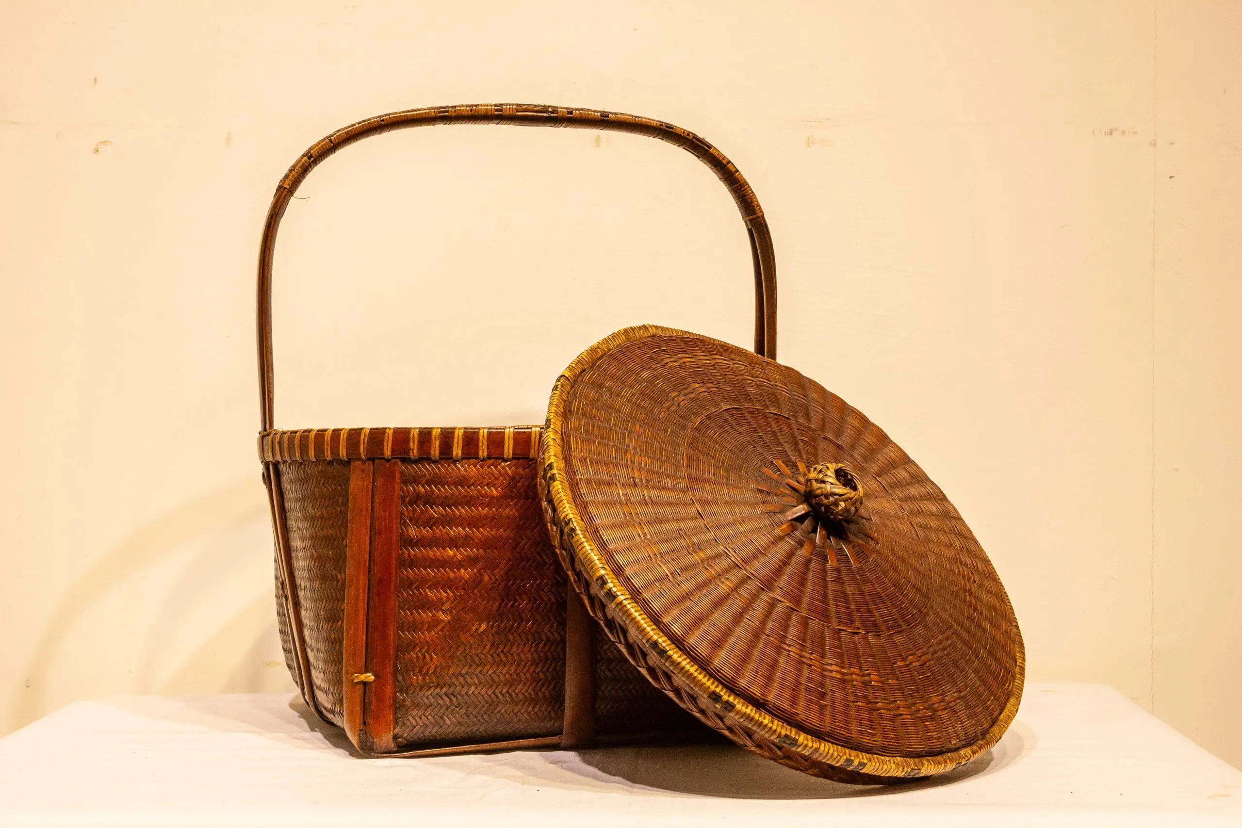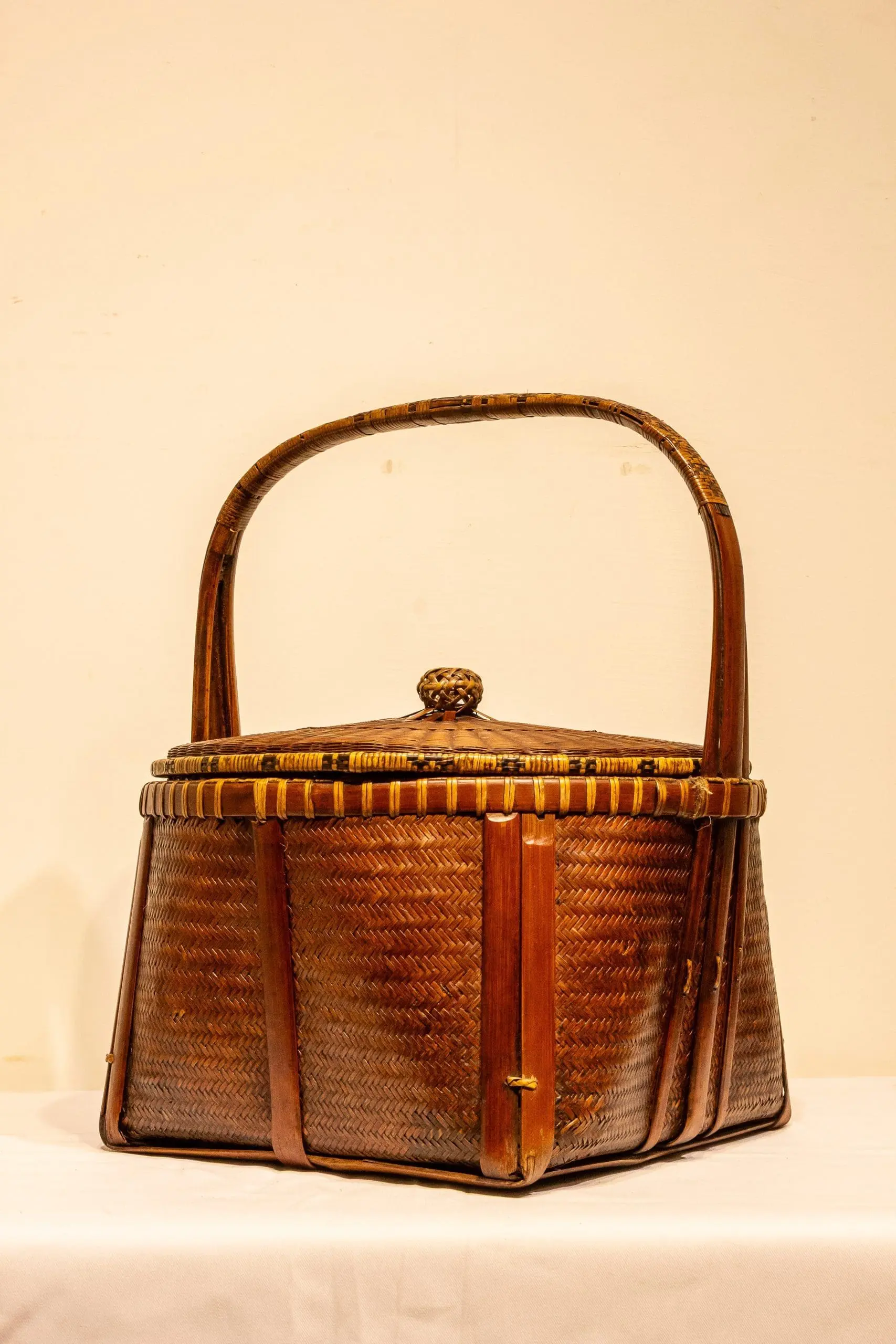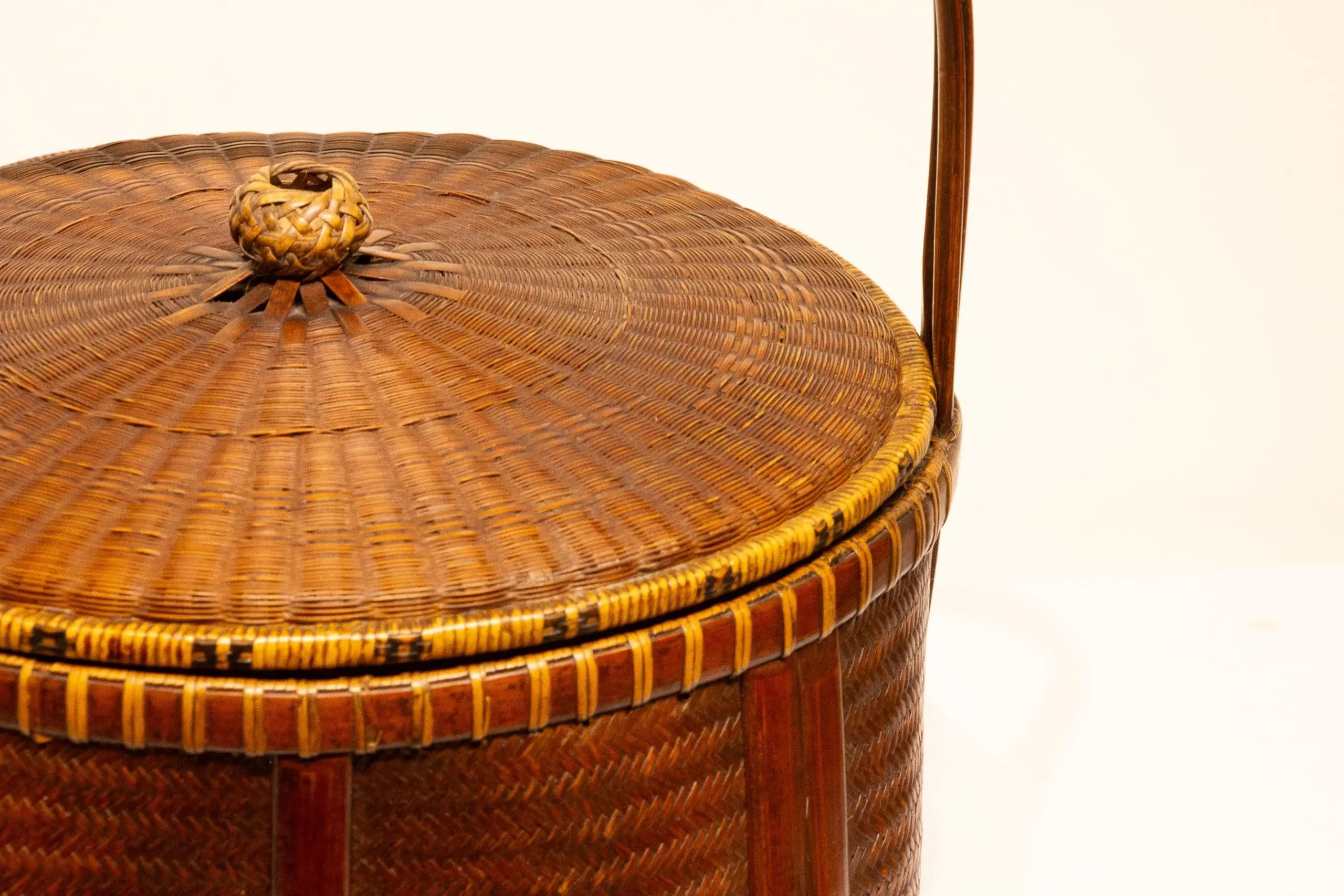 | Description | A refined Chinese lidded carrying basket, early Republic period, of rectangular silhouette with rounded corners and high arched handle. Tight split-bamboo plait with chevron panels, stepped rim binding, and domed cover topped by a woven knop. Warm honey-brown patina from use; wooden vertical struts reinforce the sides and base stability. |