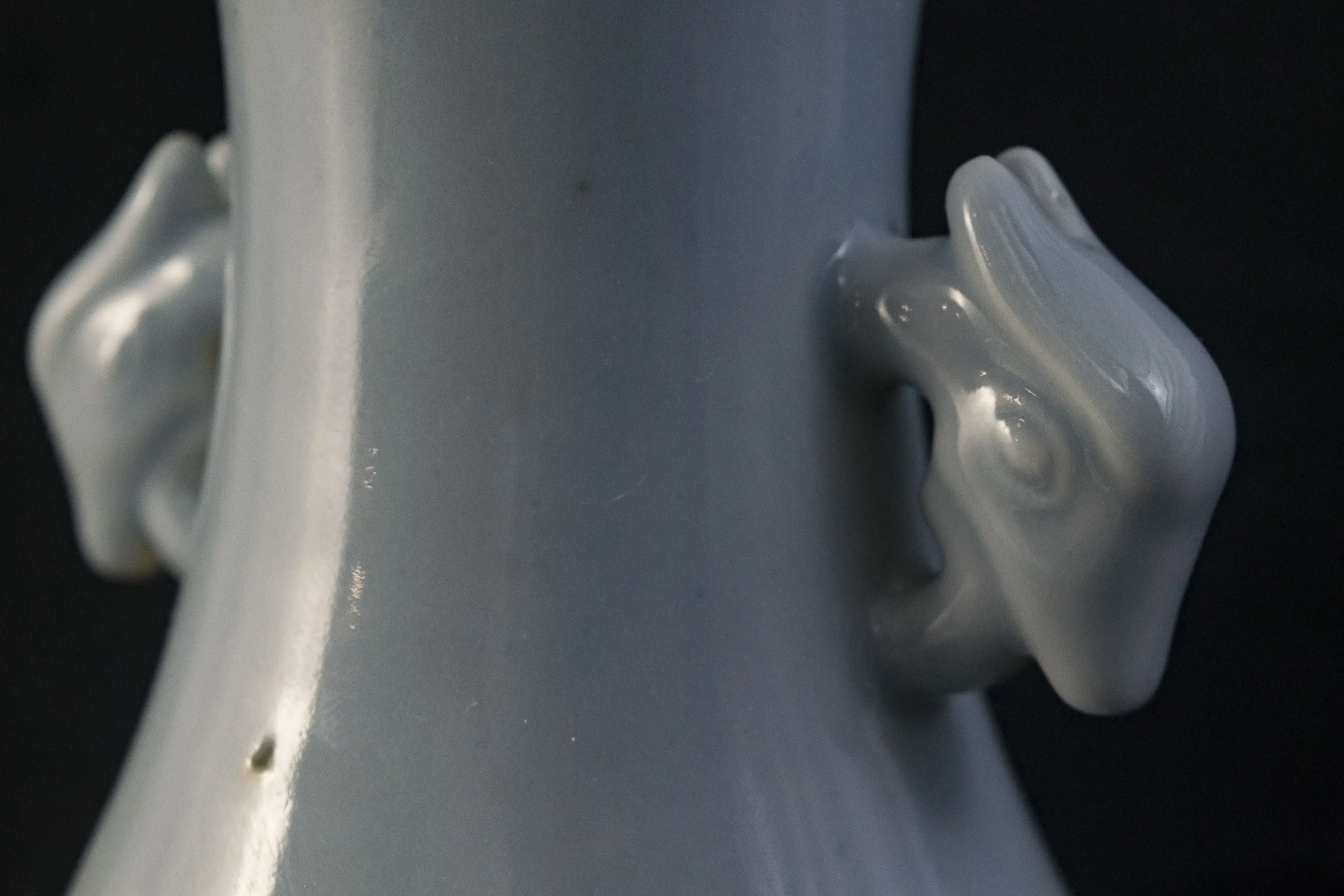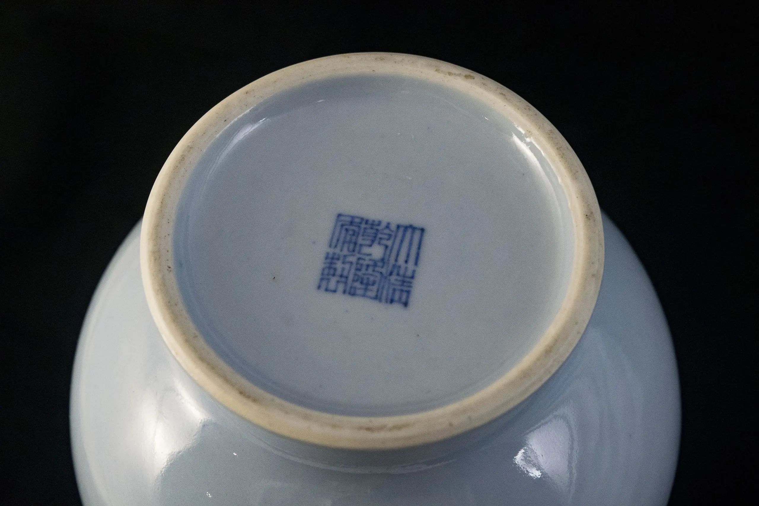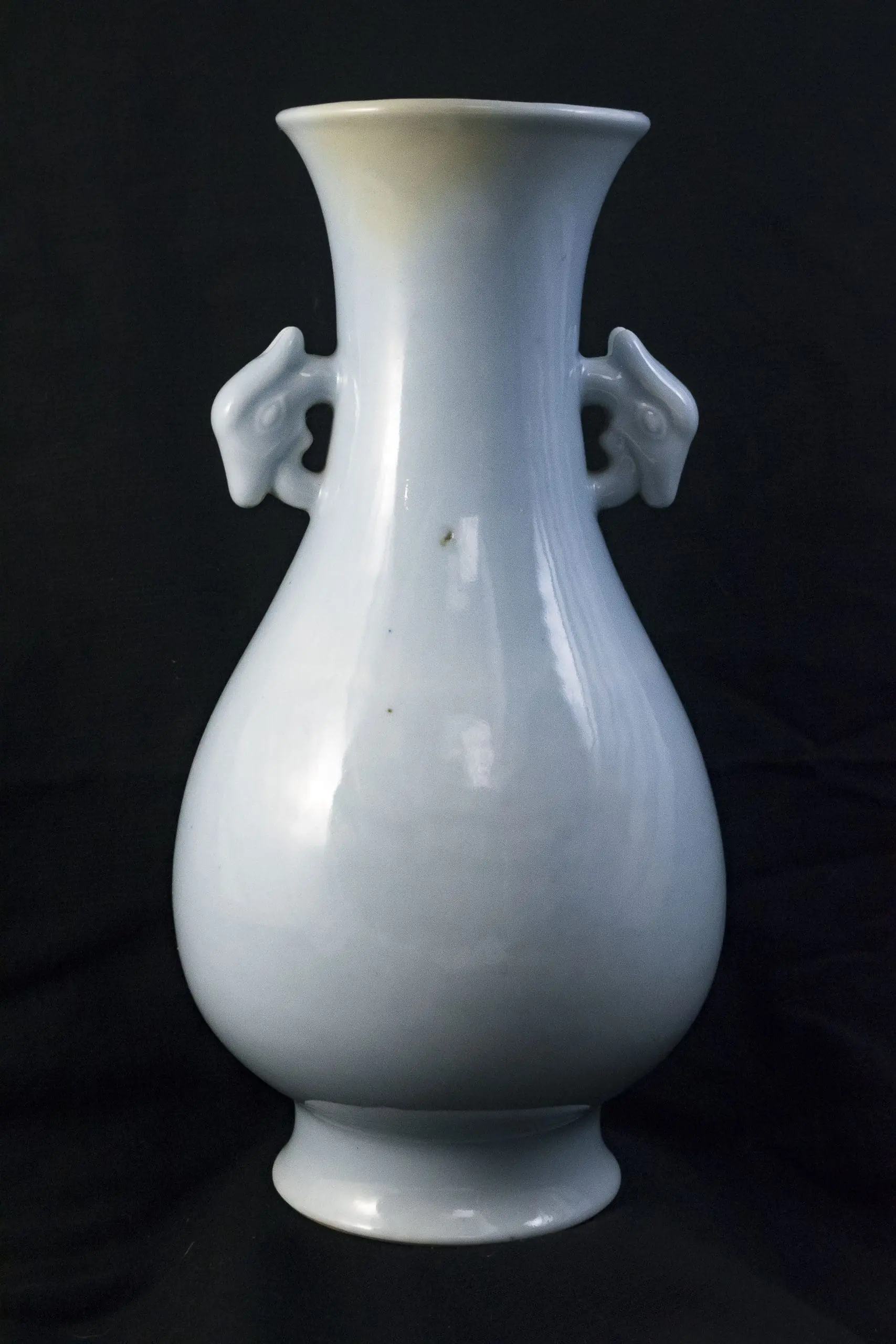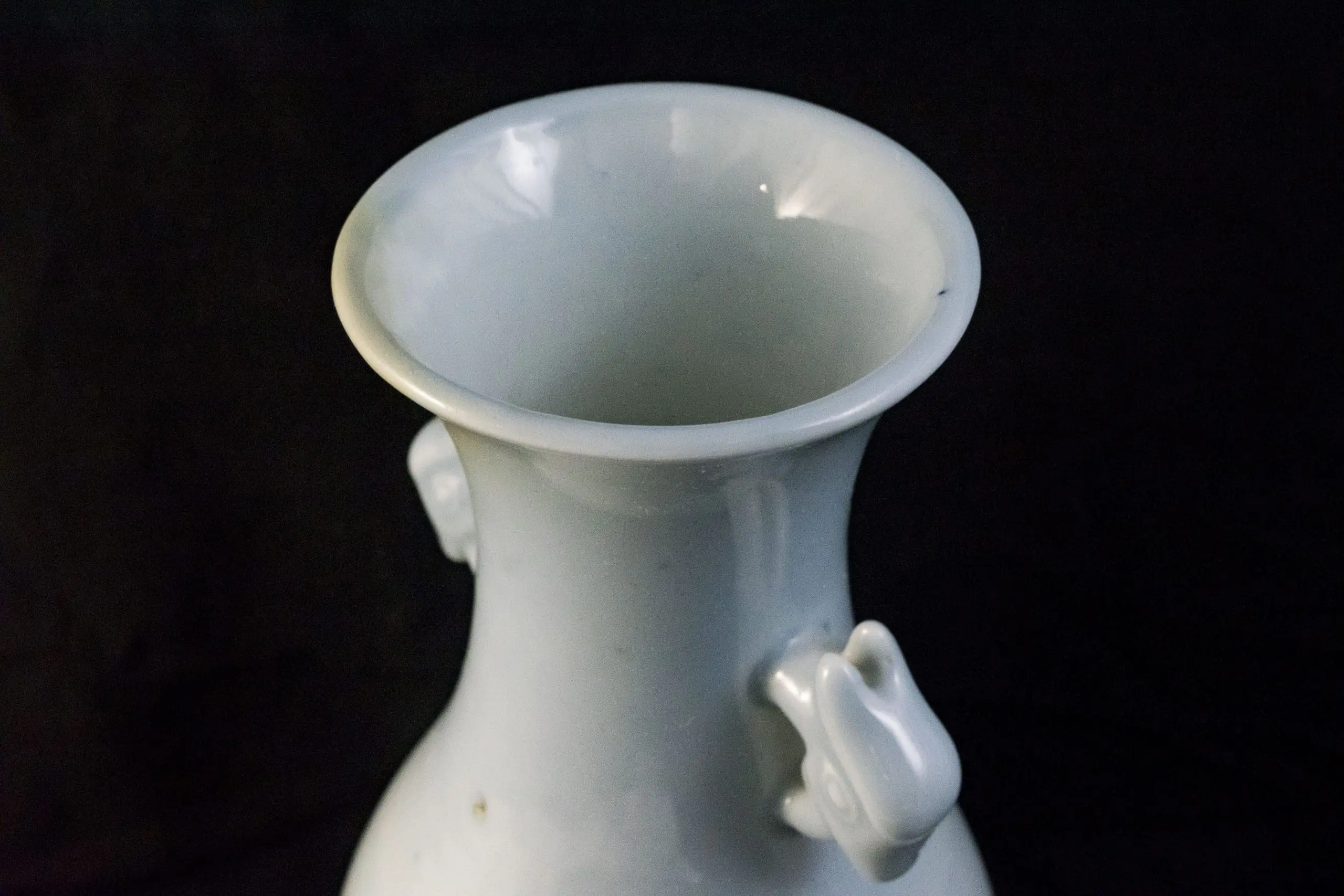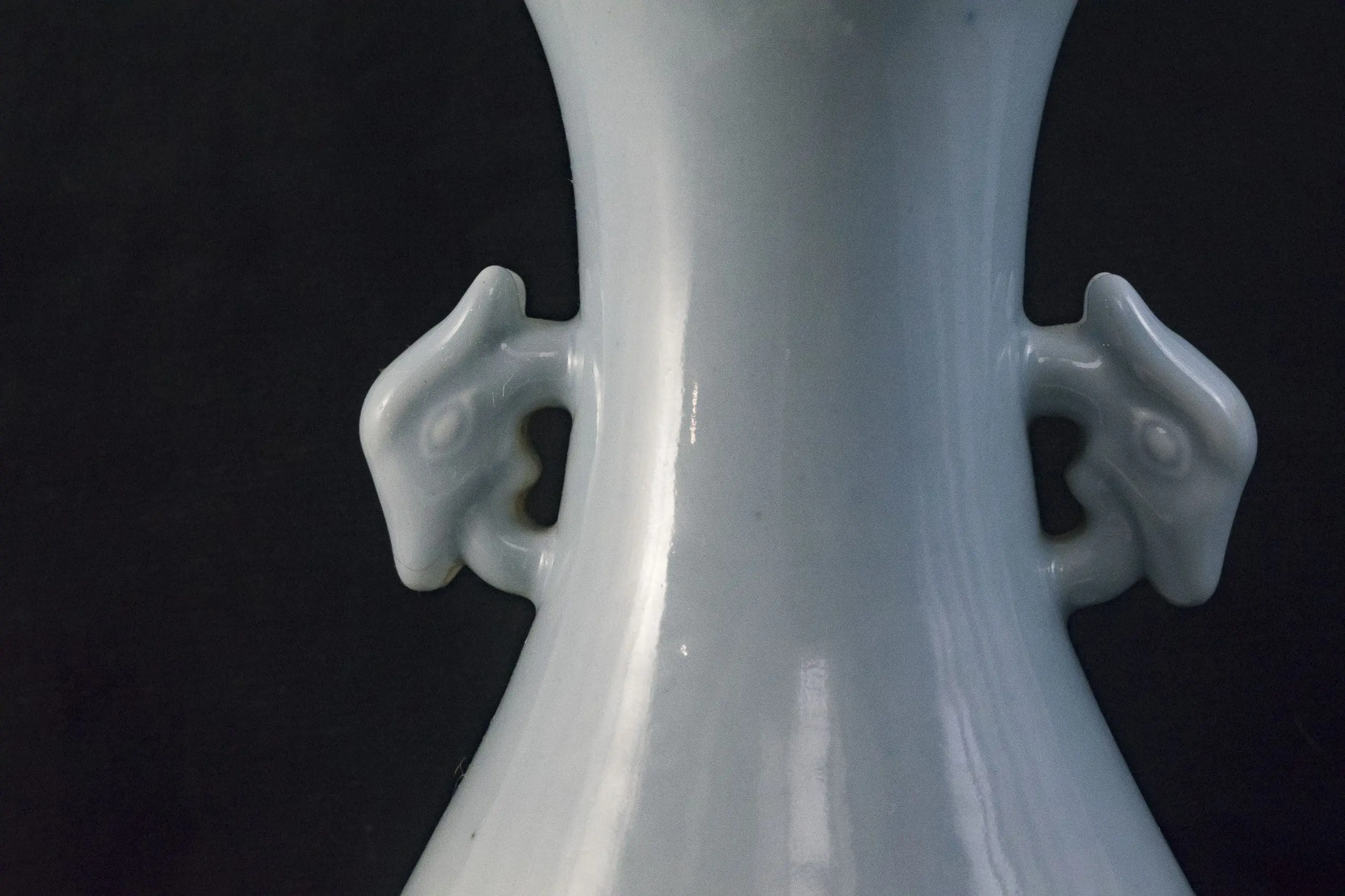 | Description | Late Qing baluster vase with elegant proportions, glazed in a soft sky-blue tone. The rounded body rises to a slender neck with flared rim, flanked by stylized dragon handles. The base bears an underglaze blue six-character Qianlong reign seal, applied in the late Qing as an honorific reference to imperial taste. |