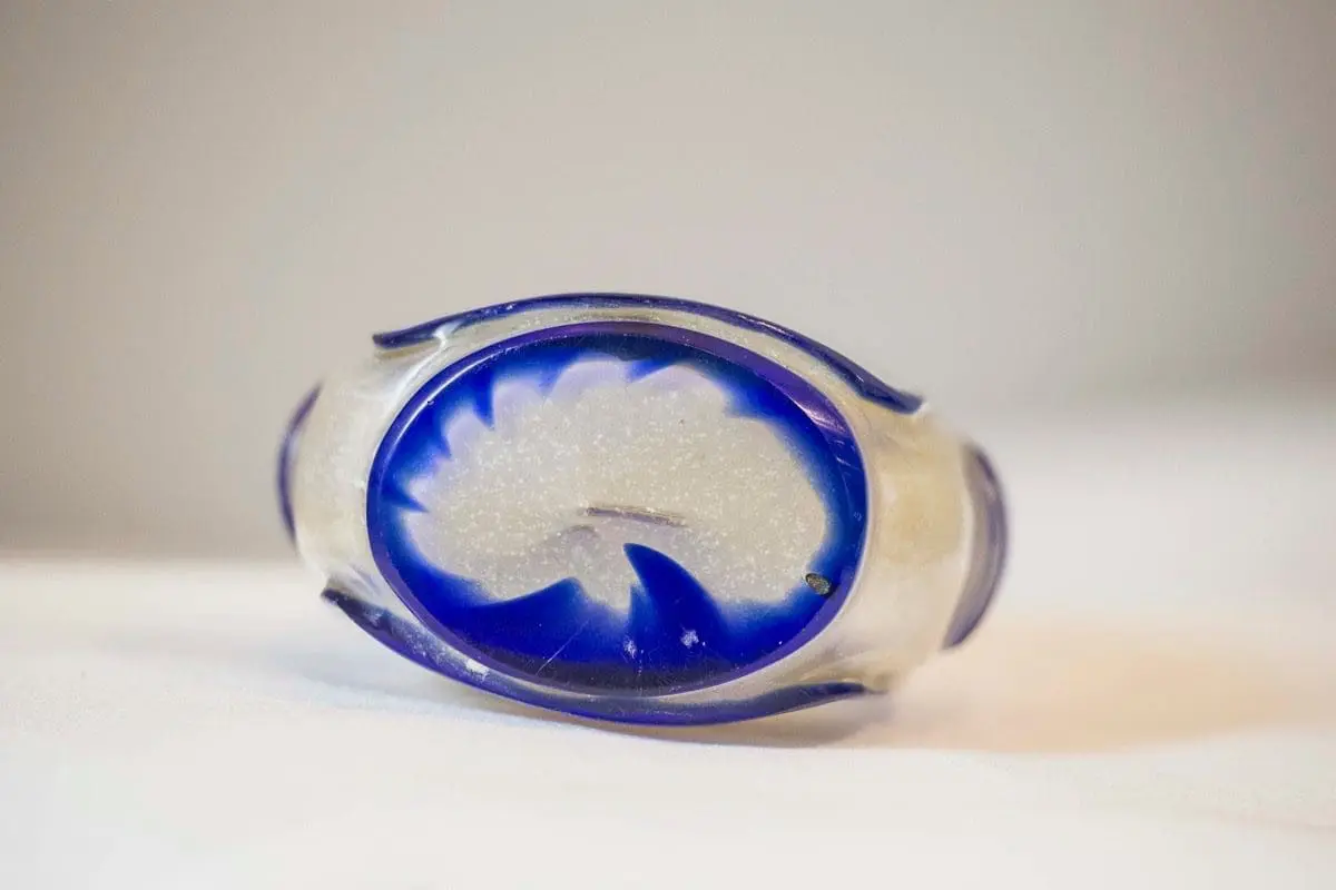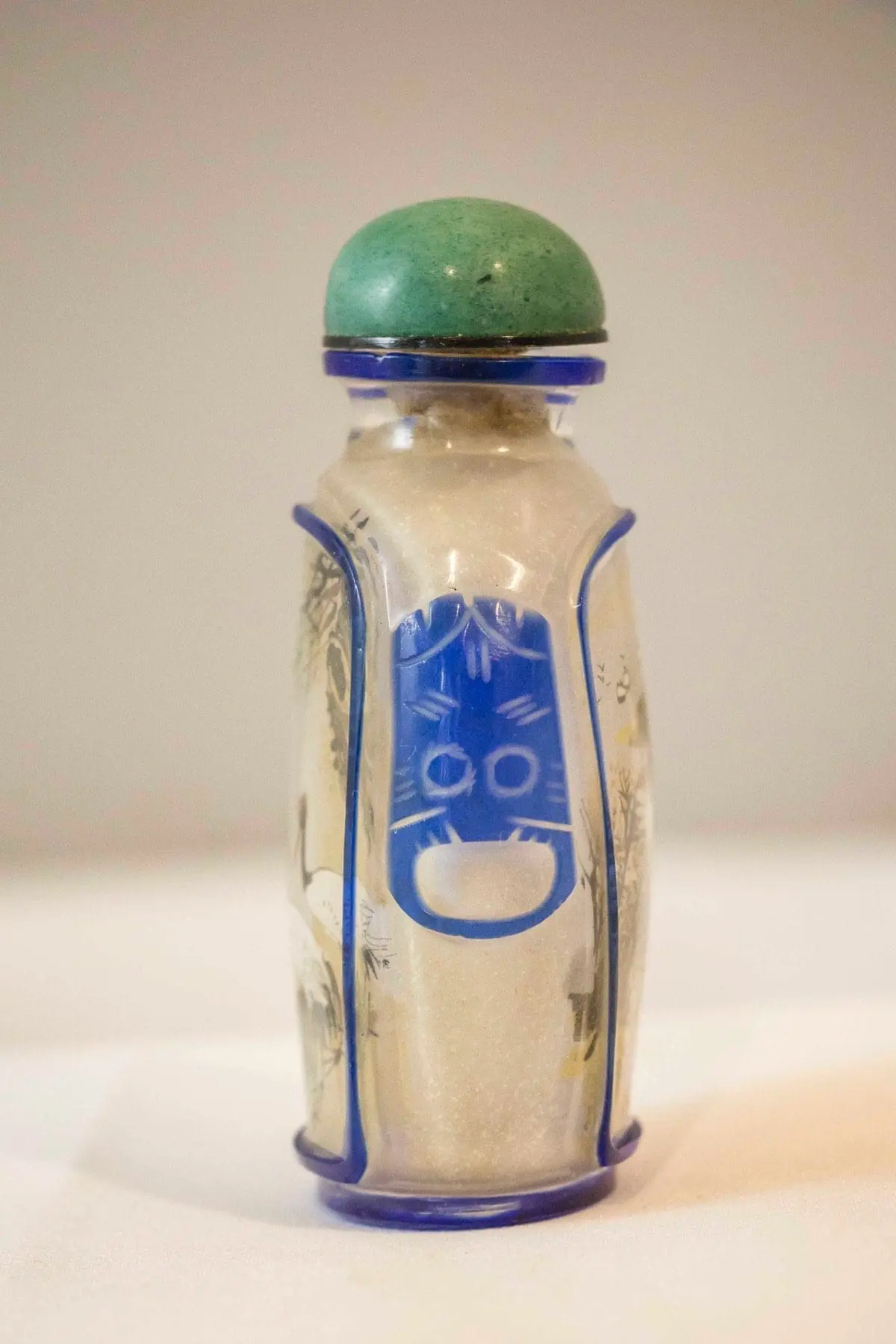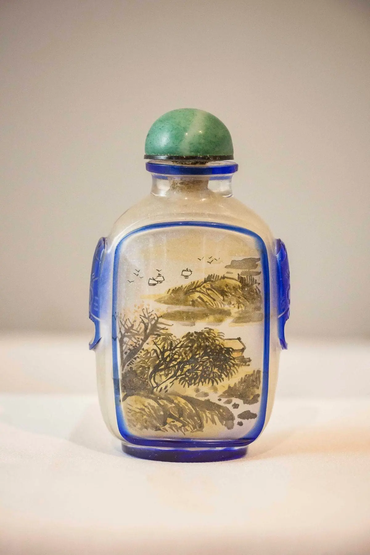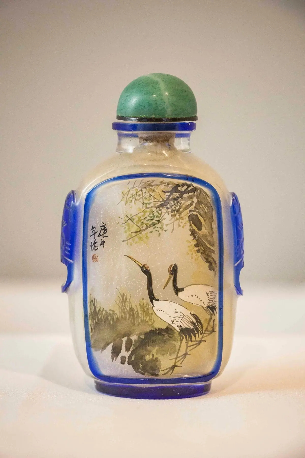 | Description | A Peking glass snuff bottle with interior polychrome paintings of two egrets on one side, a landscape on the other, decorative blue animal masks on the sides, jade stopper. |