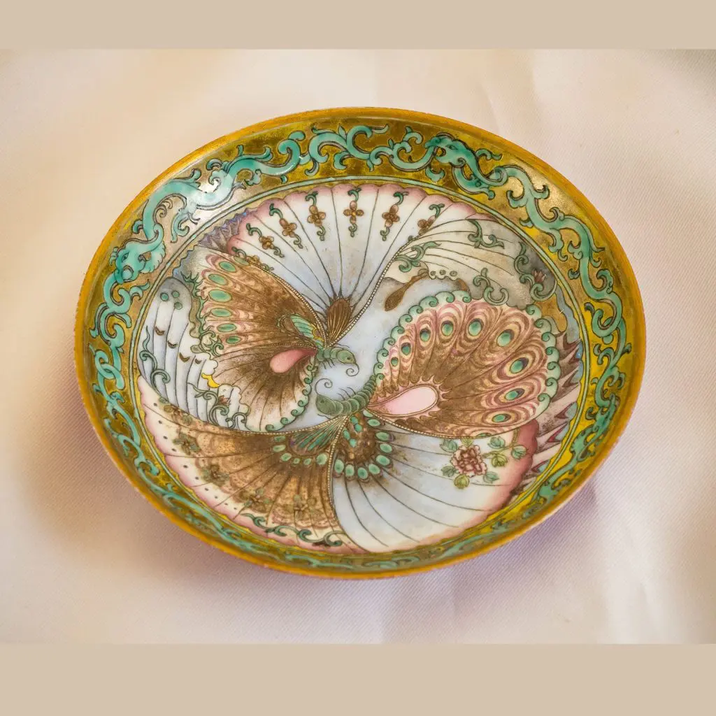 | Description | A refined late Qing fencai porcelain plate, featuring three finely painted medallions of floral motifs interspersed with gilded abstract scrollwork and a scalloped rim. Rendered in a soft over-glaze palette of rose, turquoises and gilt. |