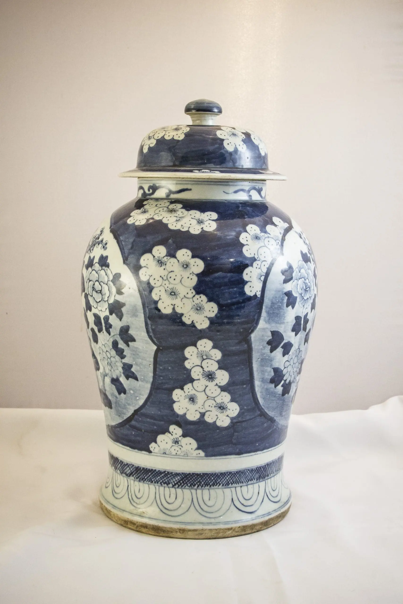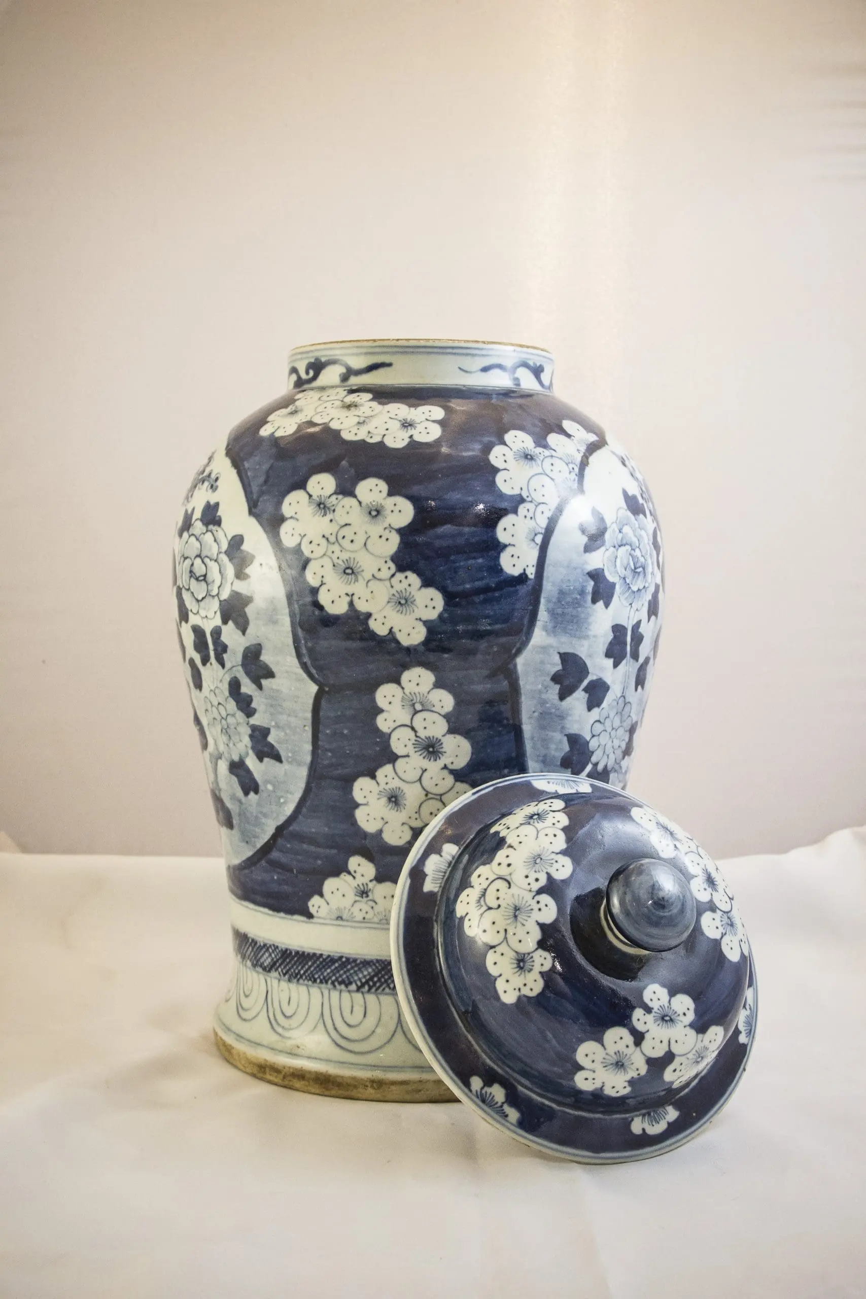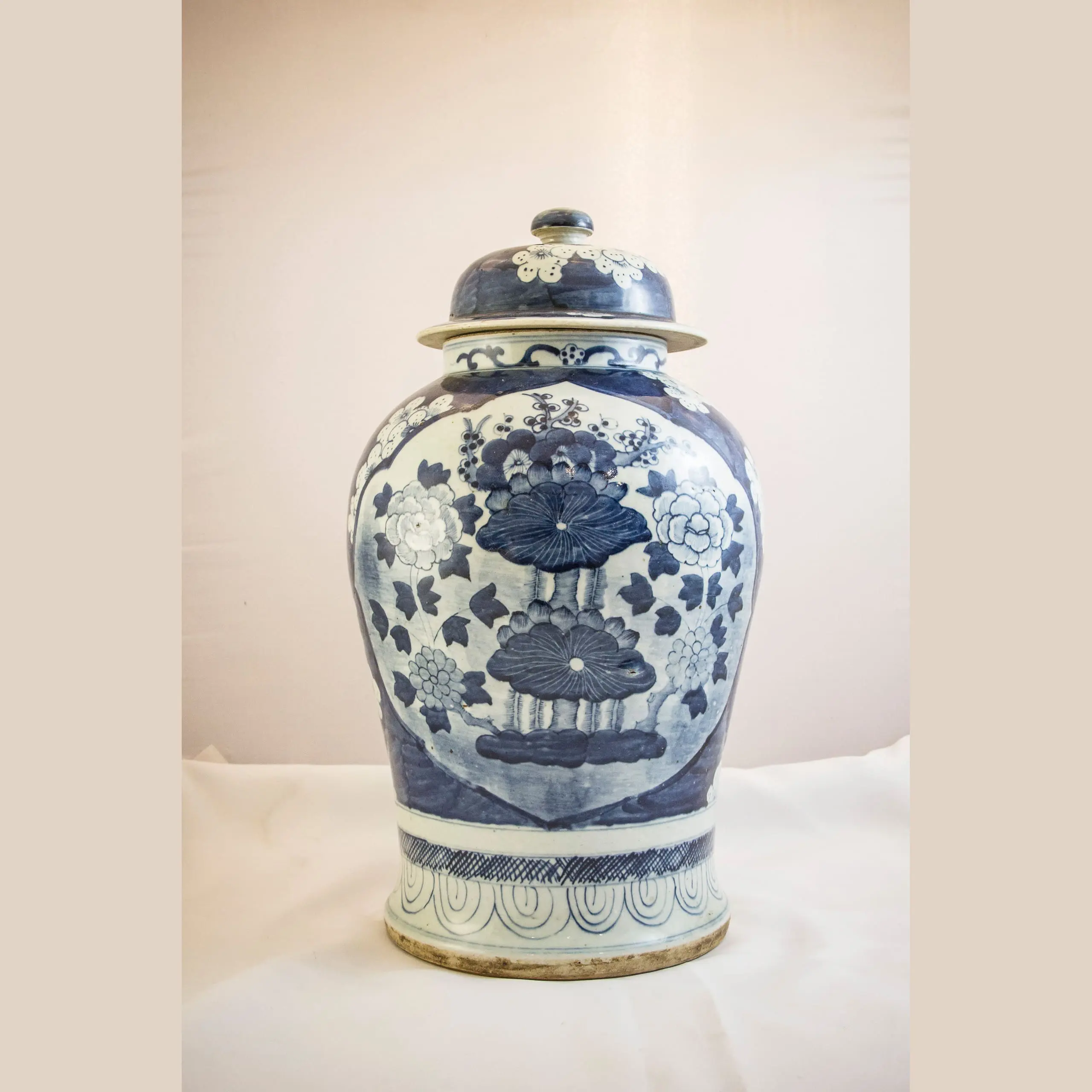 | Description | A covered Jyang Jun jar decorated with underglaze cobalt blue plum blossoms, lotus flowers and peonies. |