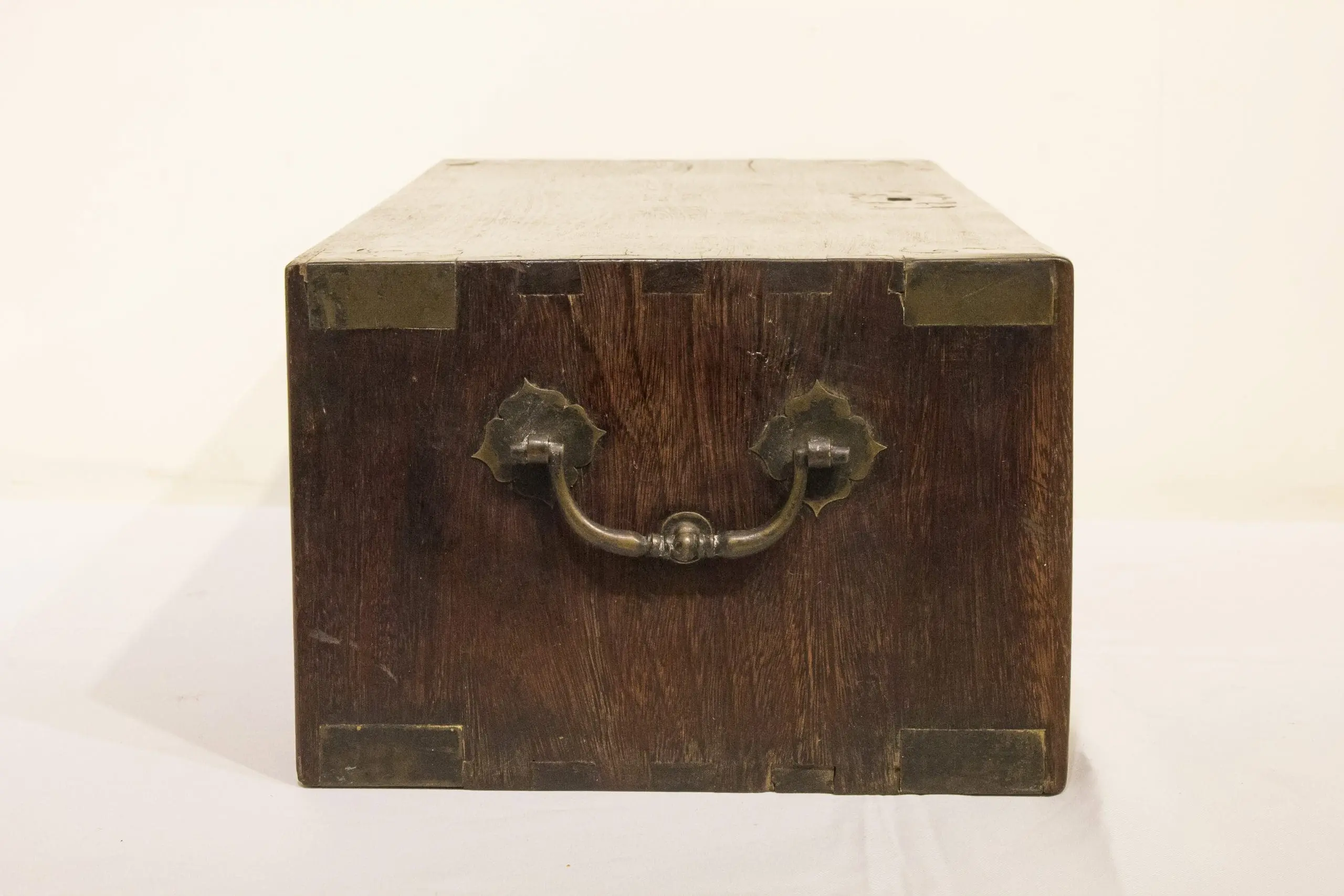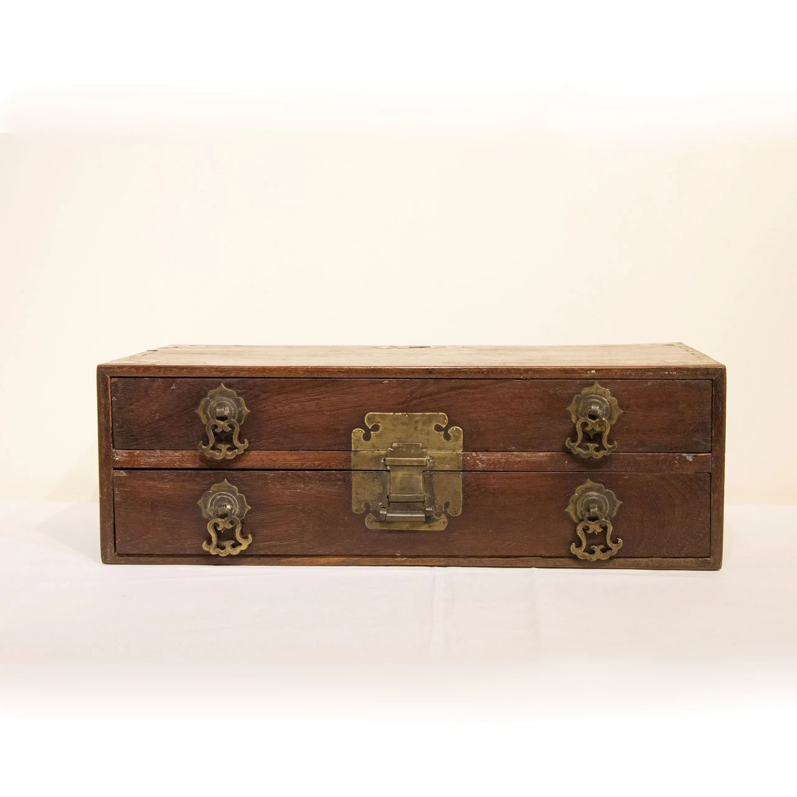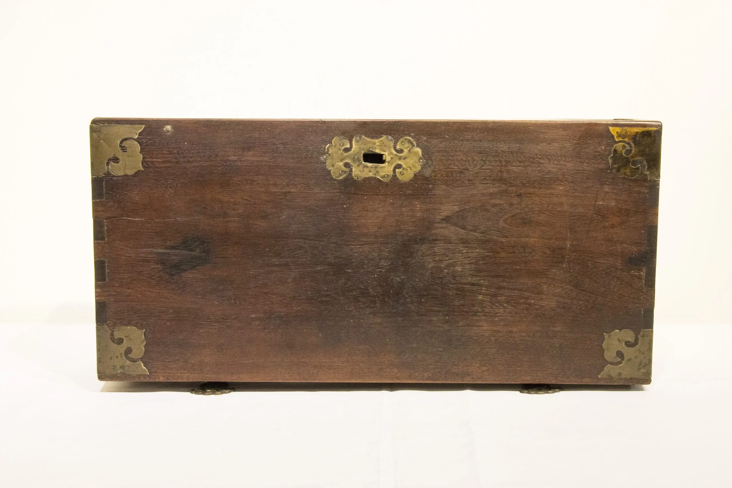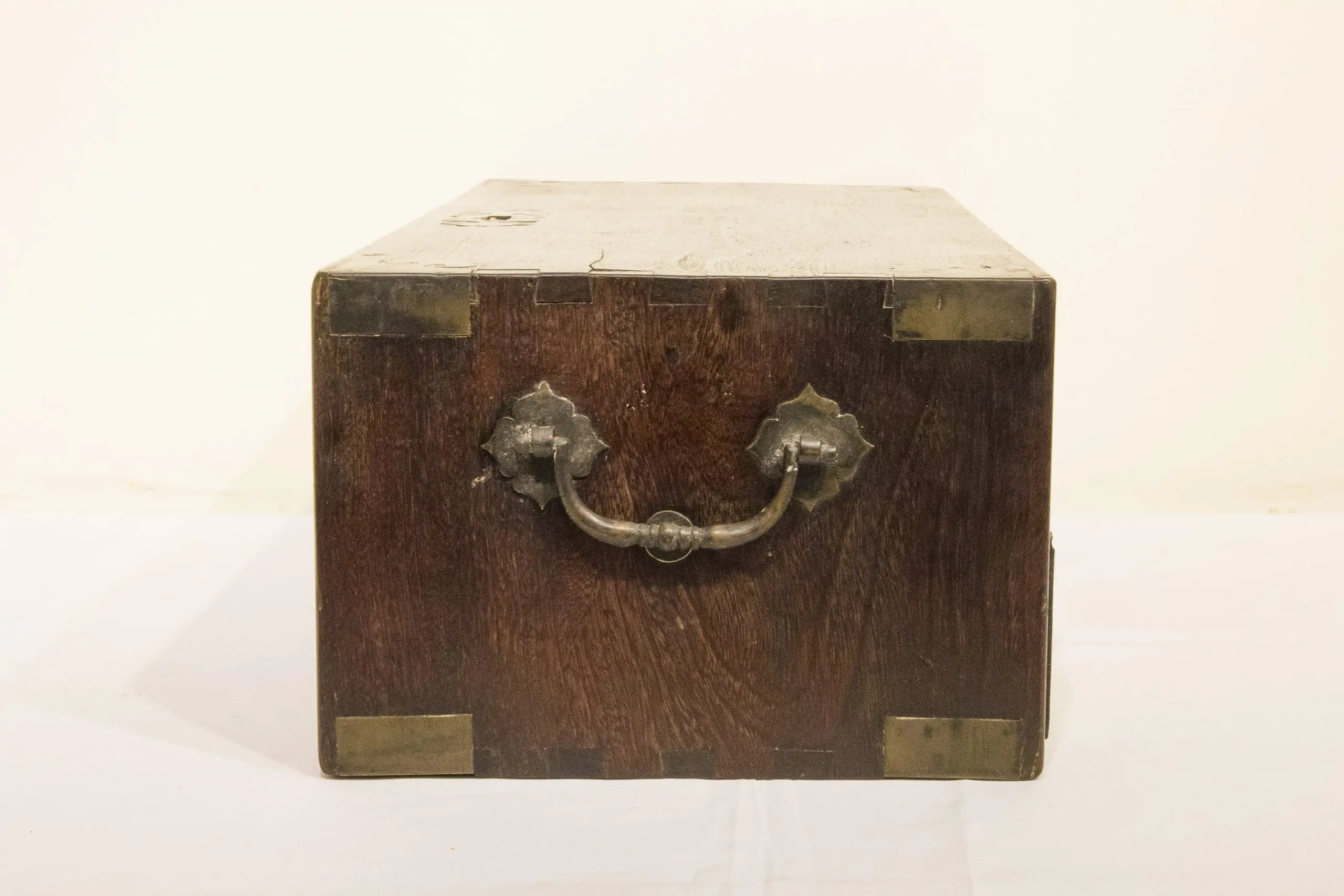 | Description | 19th-century Chinese ironwood opium scale box, two drawers with brass drop handles and a sturdy hasp lock. A brass-lined hole on the lid once secured a weighing scale. Durable, elegant design, aged patina suggests it stored measuring instruments for opium and medicinal trade. |