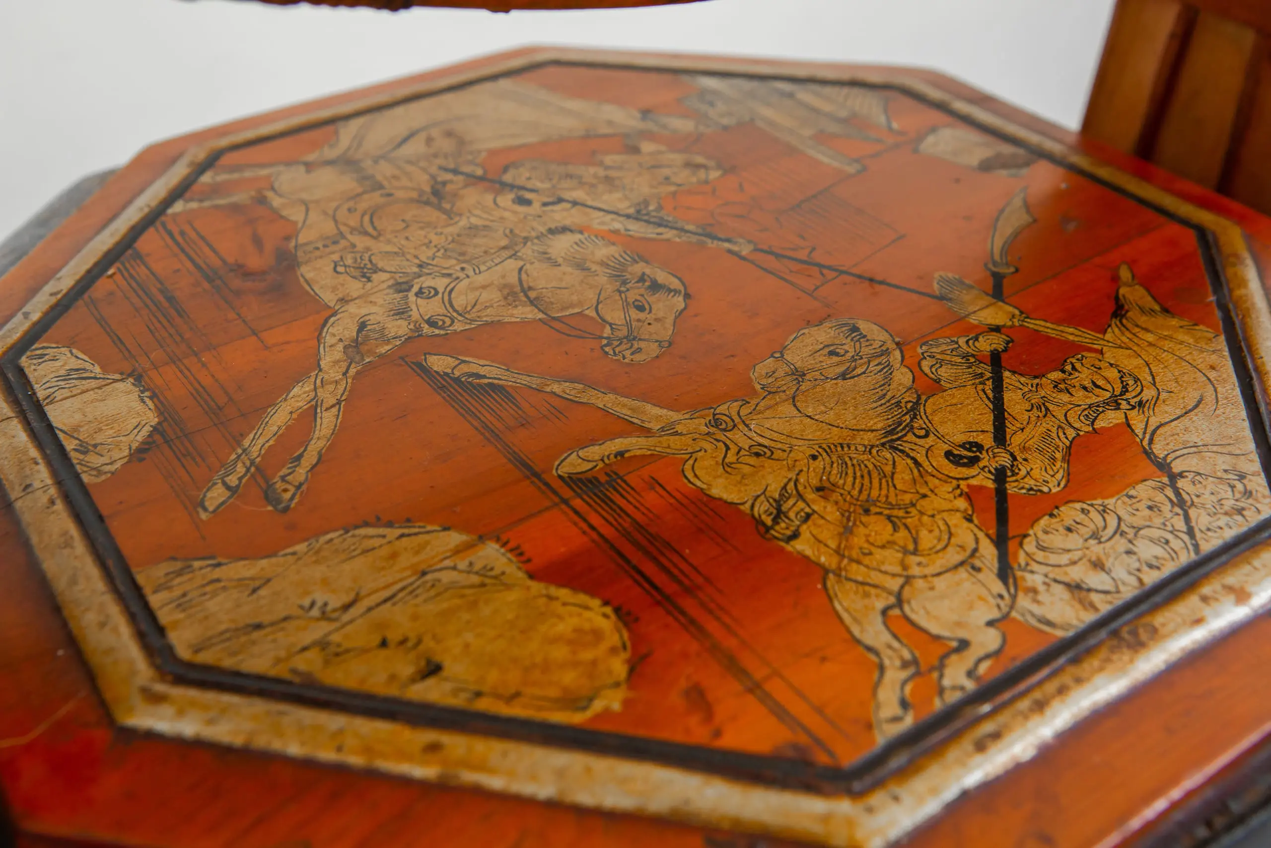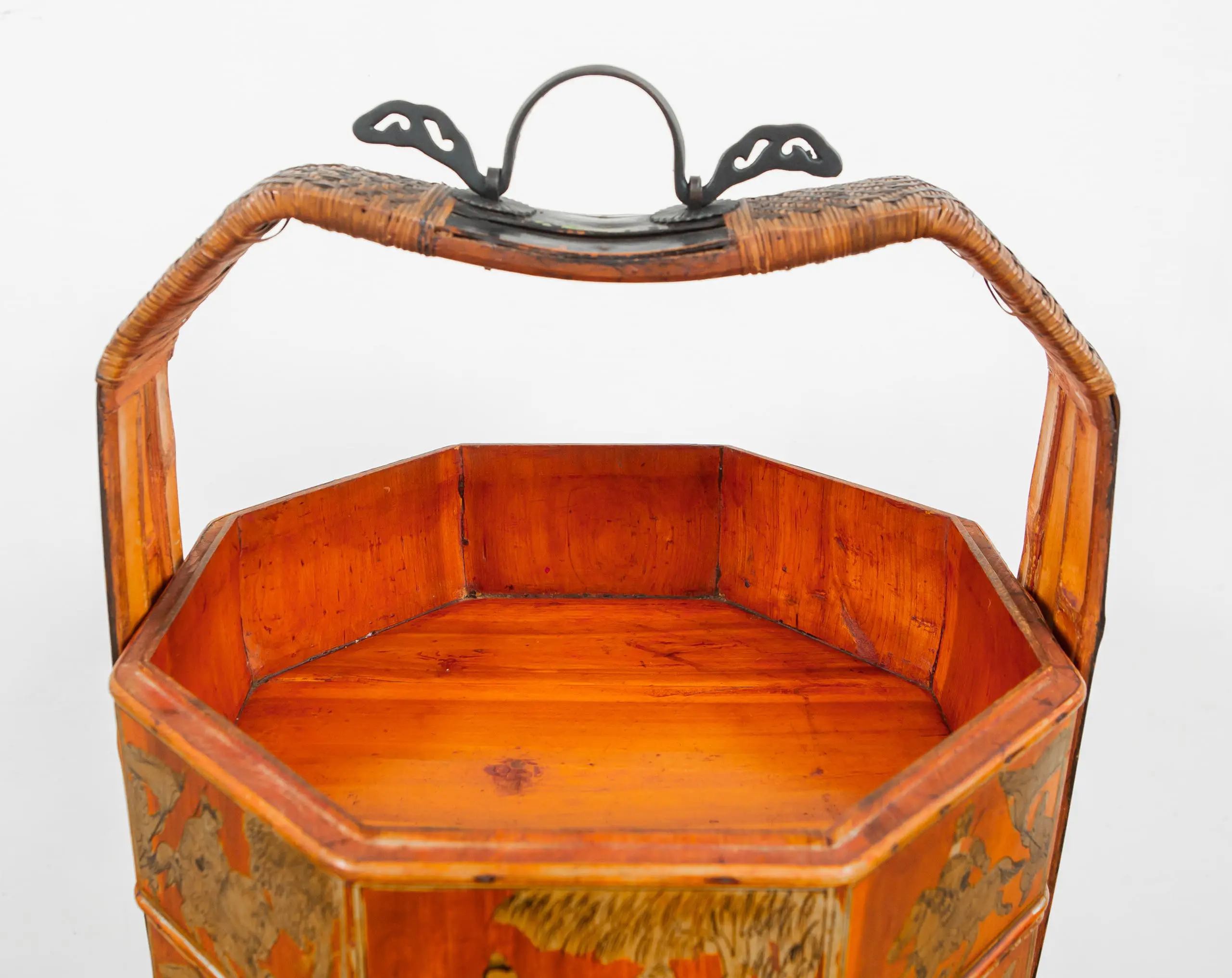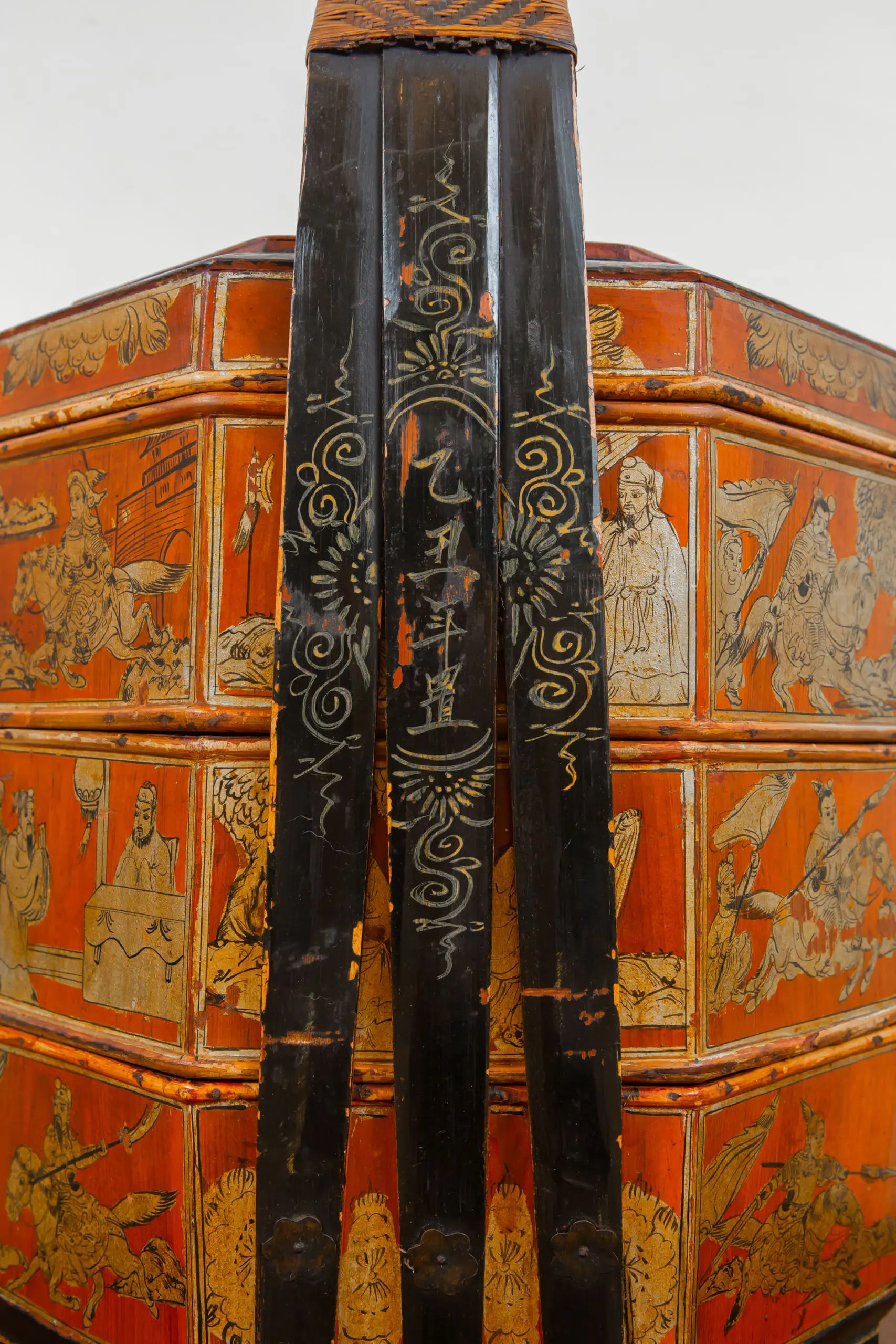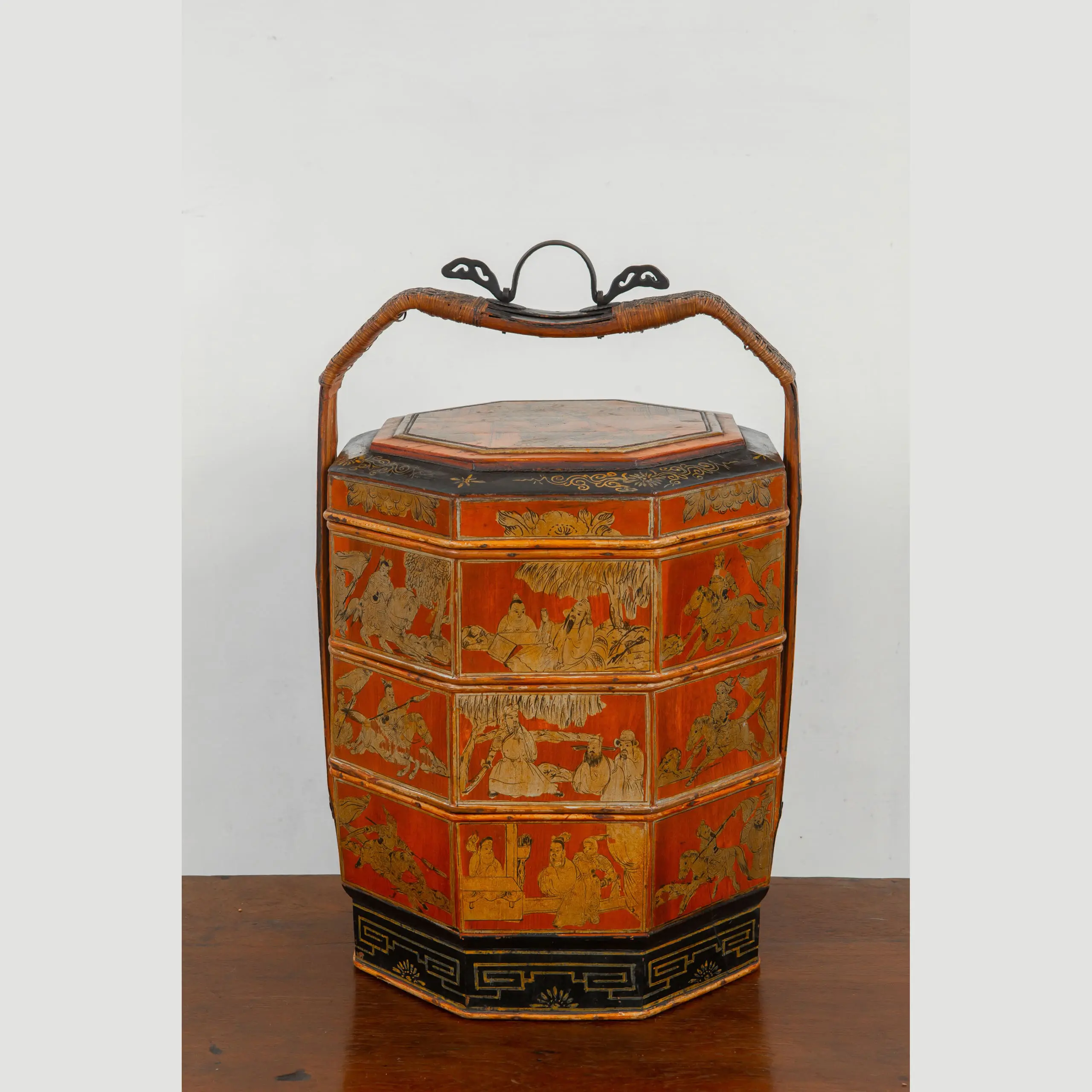| Description | An elegant, large hexagonal three tiered offering basket with gilded paintings of two warriors on the lid, bordered with gilded floral paintings on a black ground, various scenes of court ladies, high officials, and warriors on the sides, fine rattan weaving on the bamboo handles followed by gilded floral paintings on a black ground, brass handle at the top. |