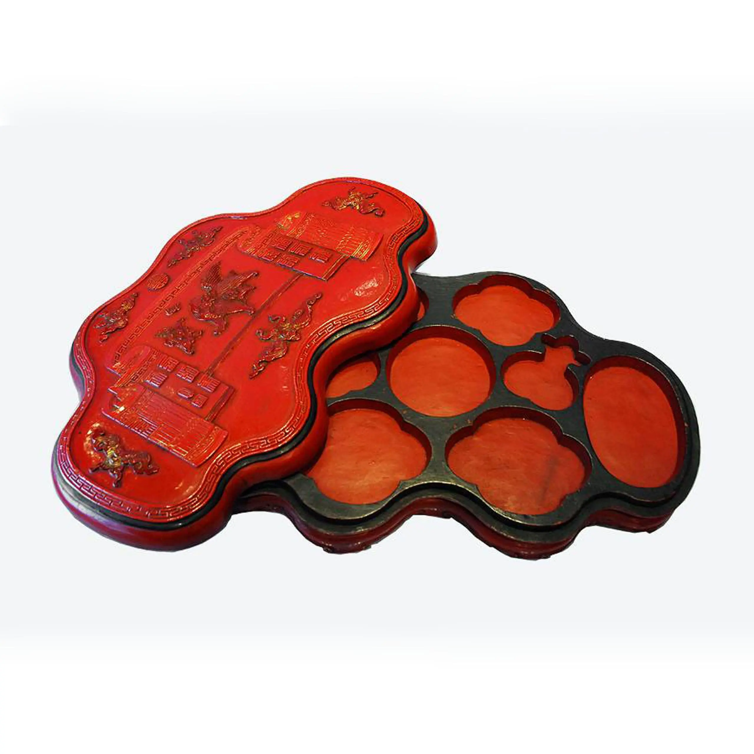 | Description | An unusual cinnabar lacquer candy or treat box in the shape of a bat with relief landscape carvings on the lid, finely carved key designs around edges |
