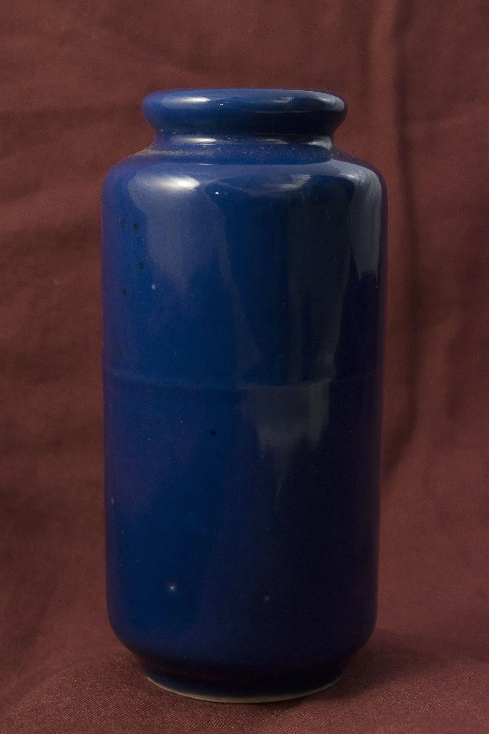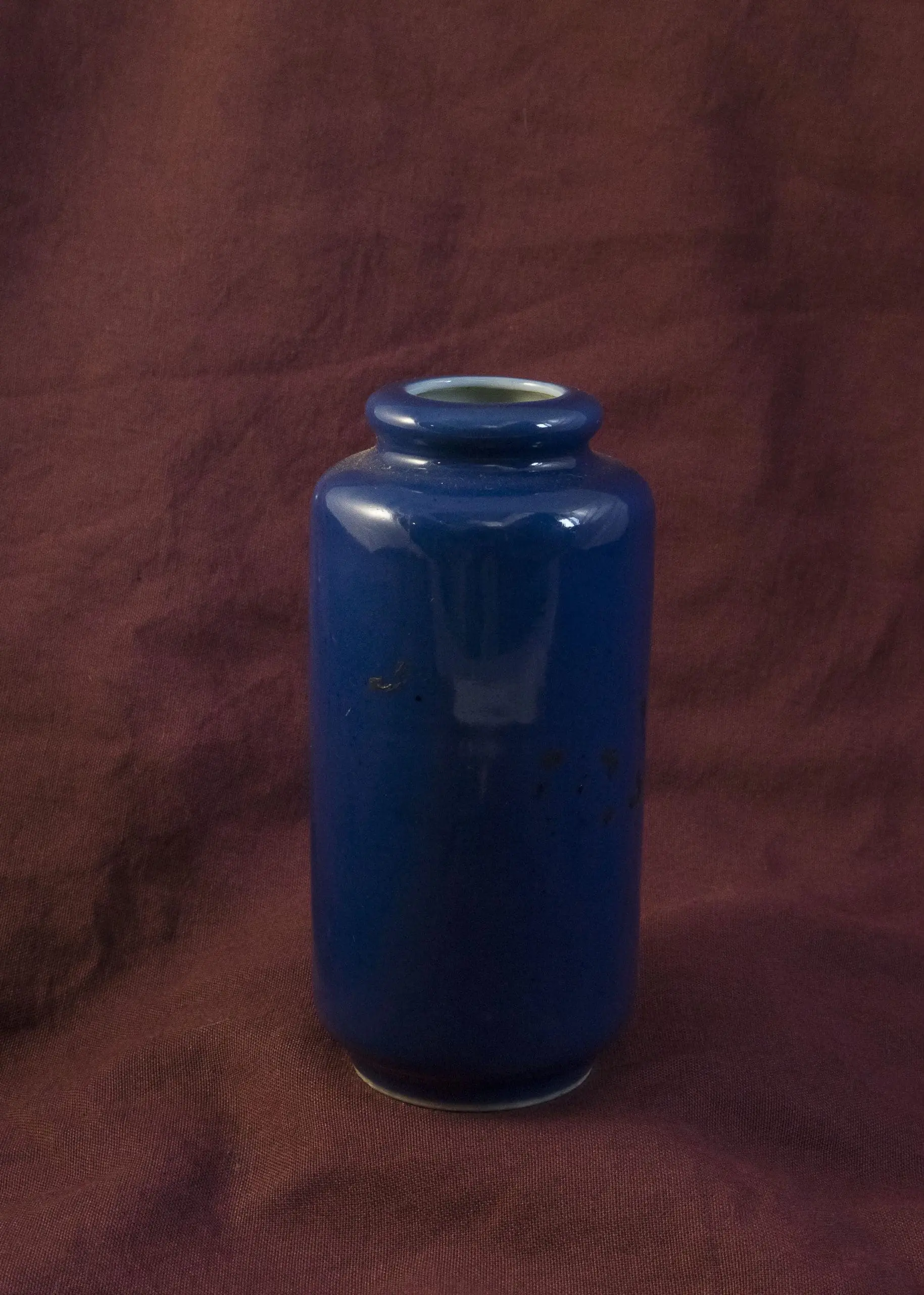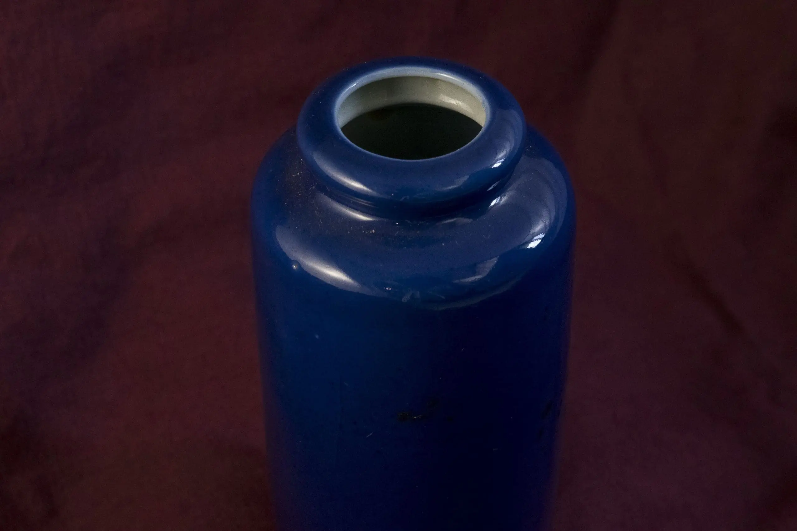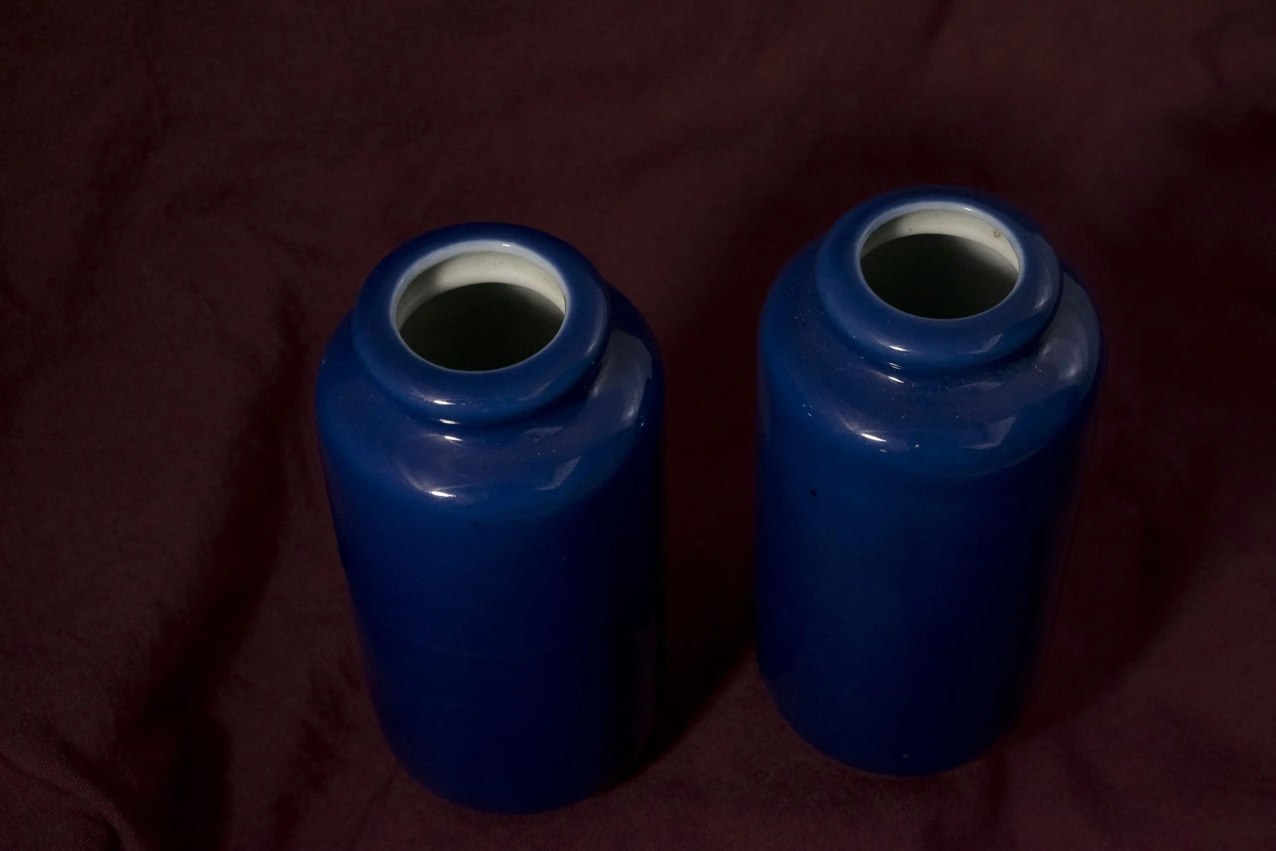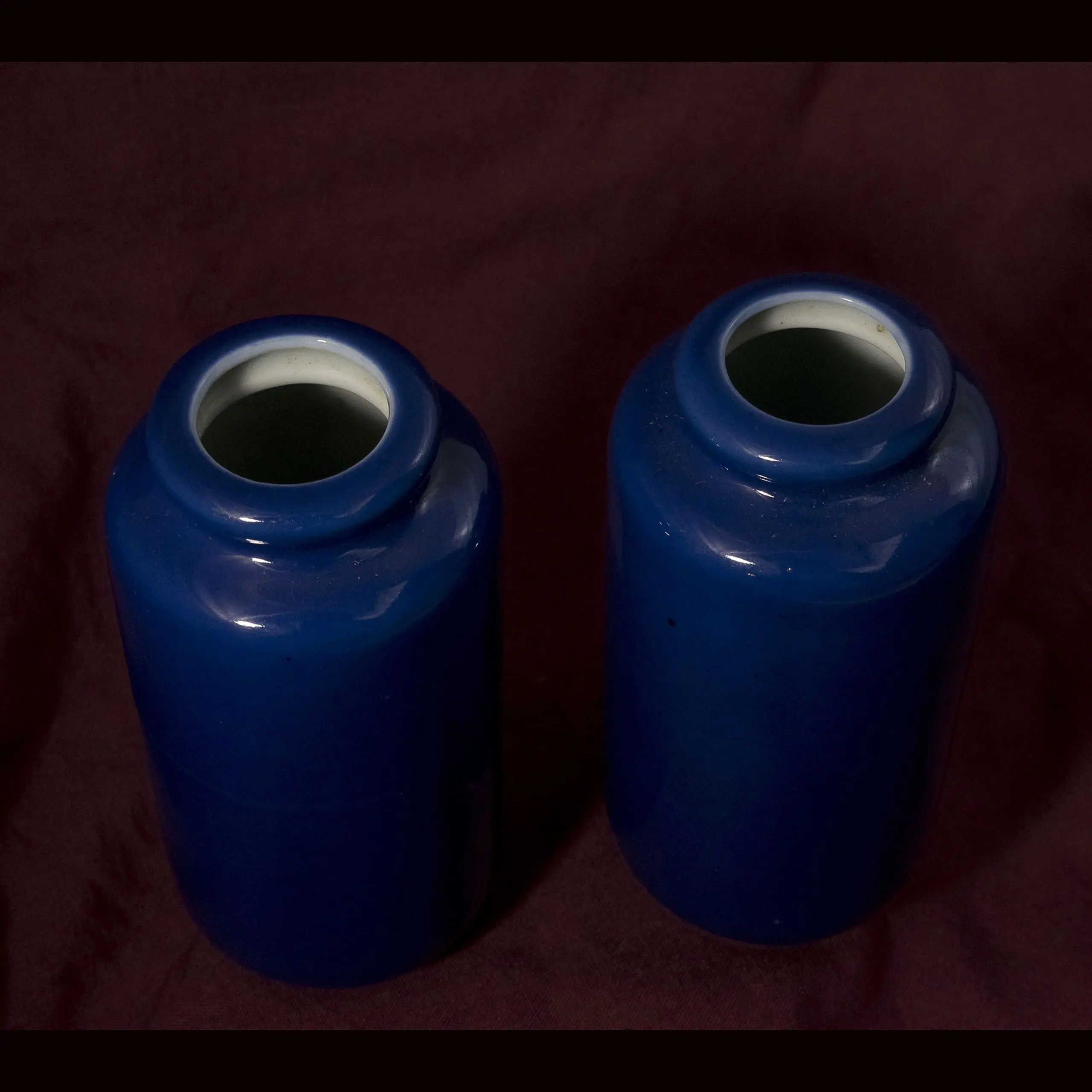 | Description | Pair of small Daoguang period paujya vases with cylindrical bodies and slightly flared balustrade lips. Finished in a rich monochrome blue glaze that reflects refined Qing craftsmanship. |