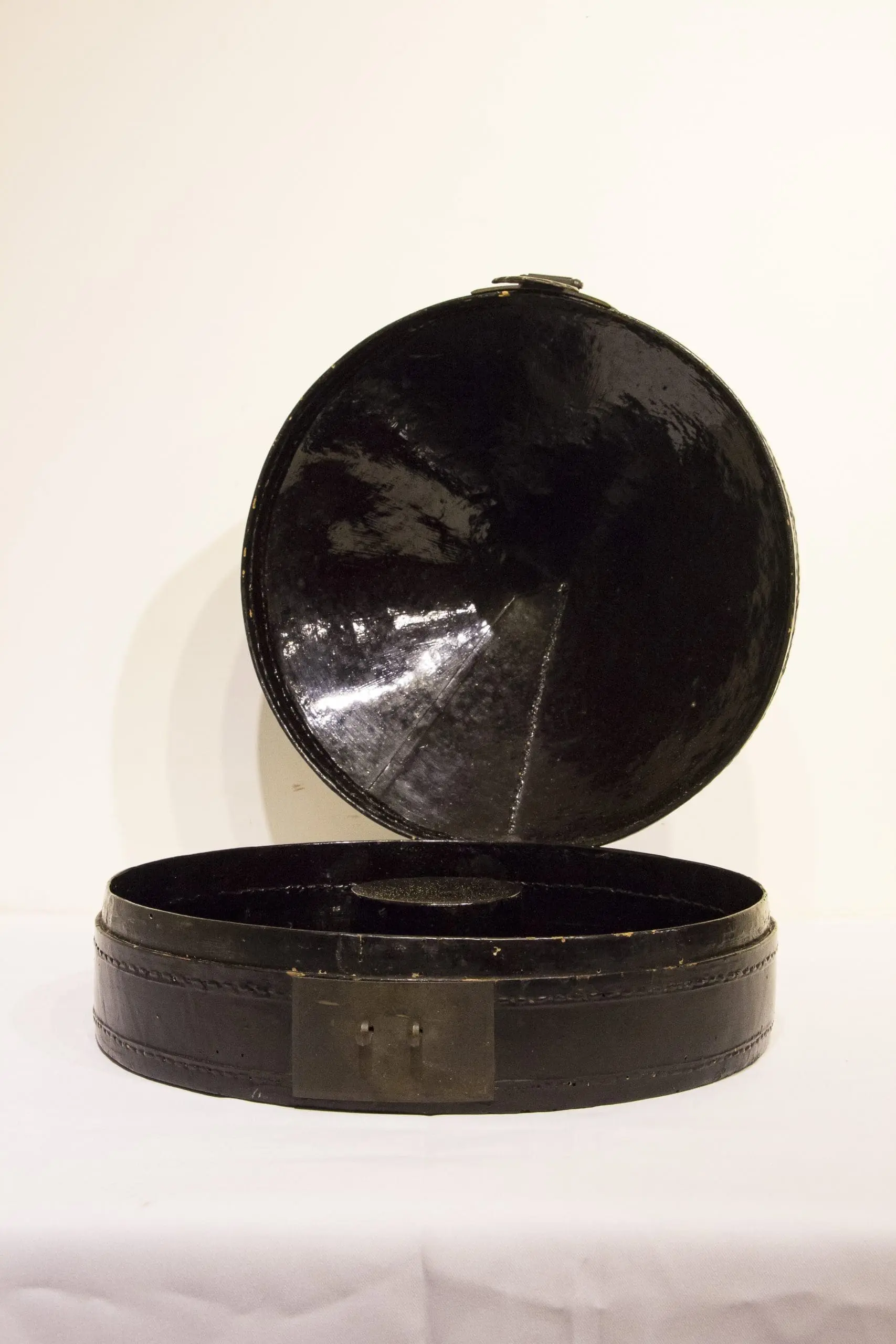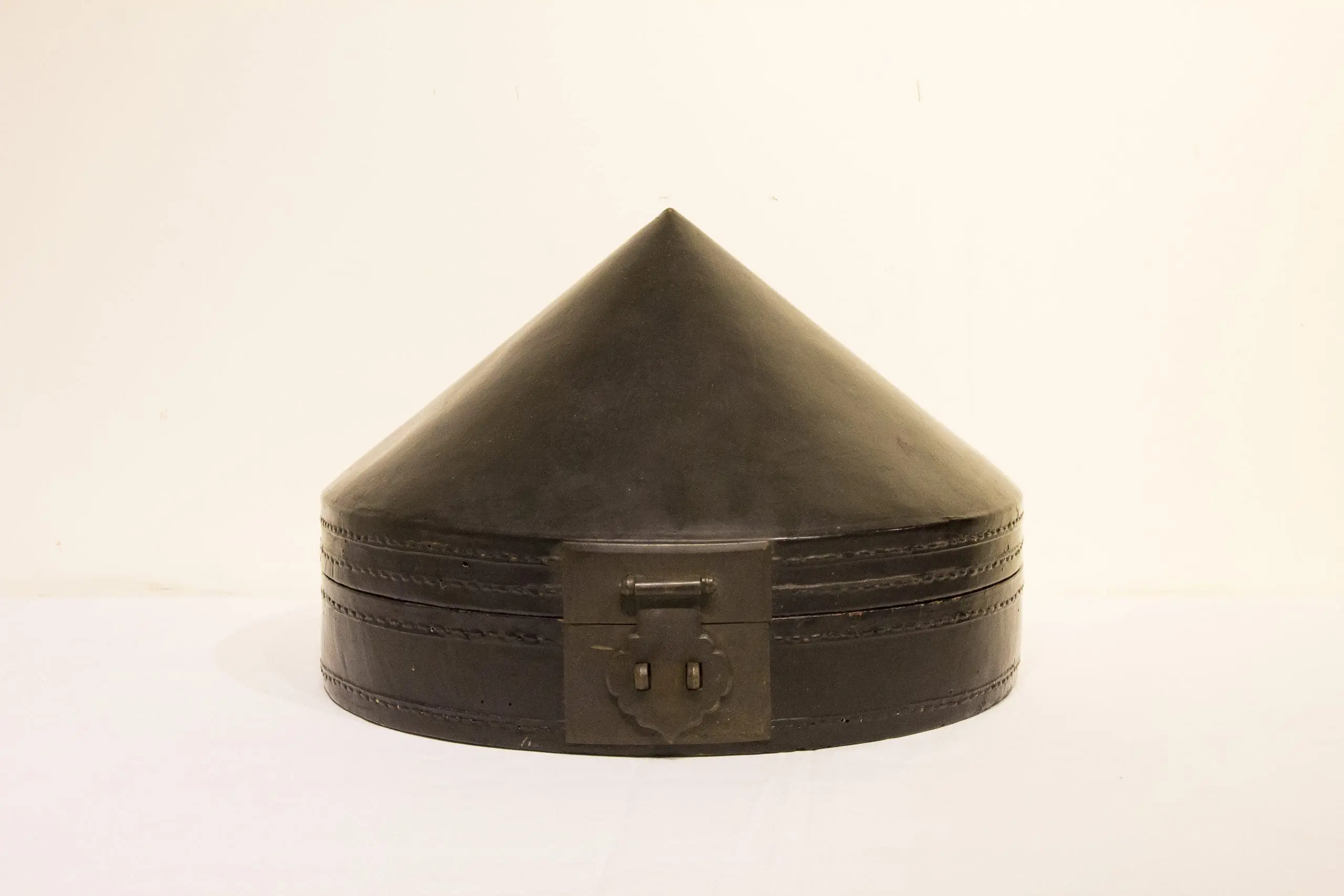This elegant conical hat box, made of lacquered leather with a brass clasp, once held a Qing dynasty officials ceremonial hat. Its distinctive form, echoing imperial China's strict dress codes, makes it a rare and sculptural piece of history, perfect for display or as a unique antique accent.