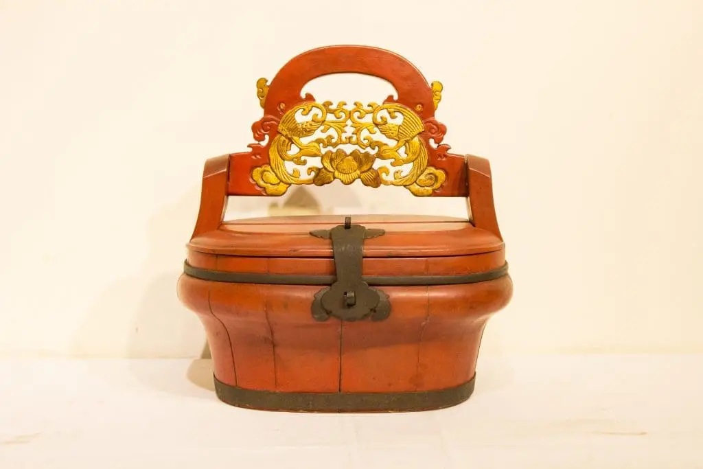 | Description | This charming cosmetic box, crafted from rich camphor and cypress woods, features a domed lid and an ornate, gilded carved handle. Dark metal bands provide a handsome contrast to the red finish. Traditionally used for grooming tools, it's a decorative and historic piece. |