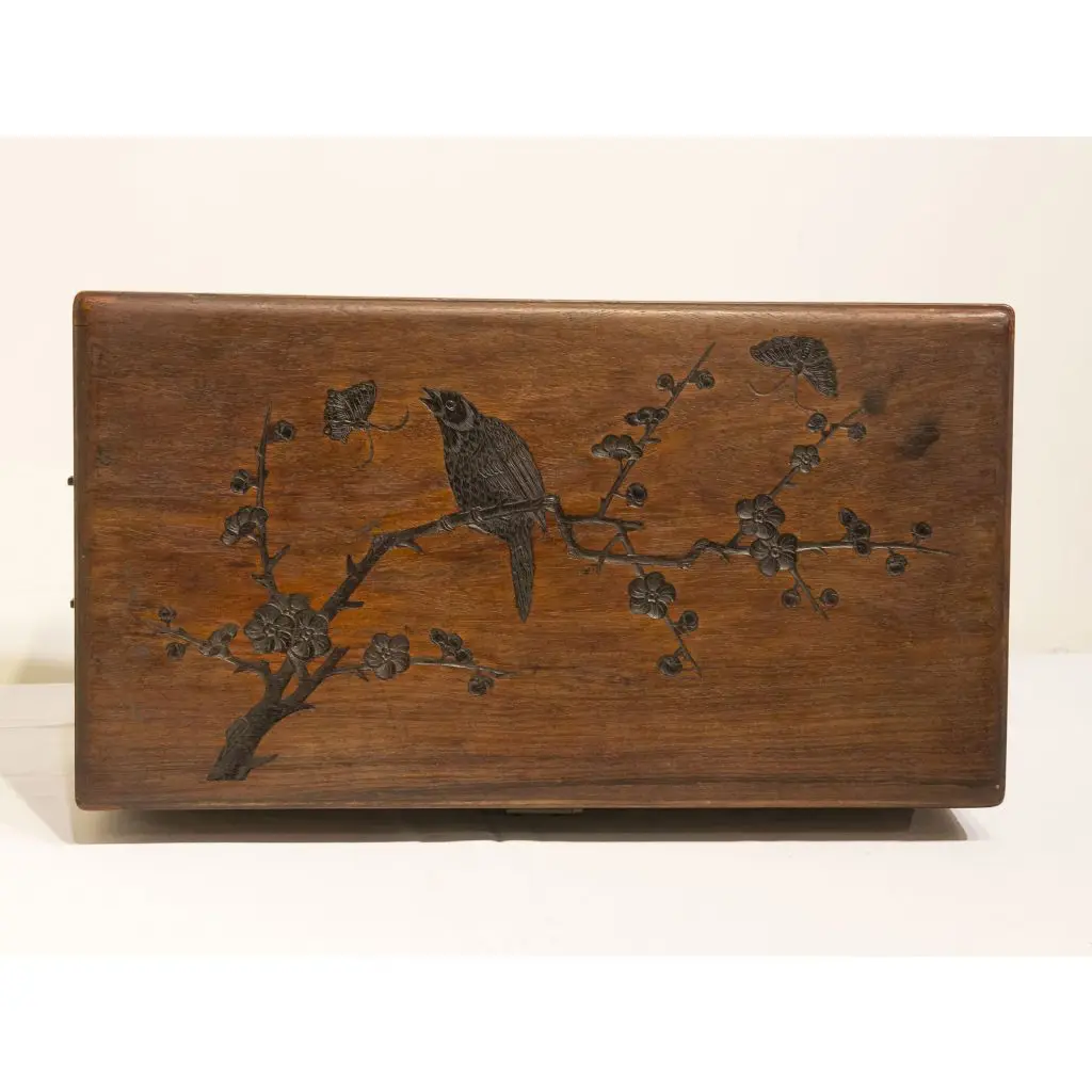 | Description | Rare document box with incised carving of a bird and tree on the lid. |