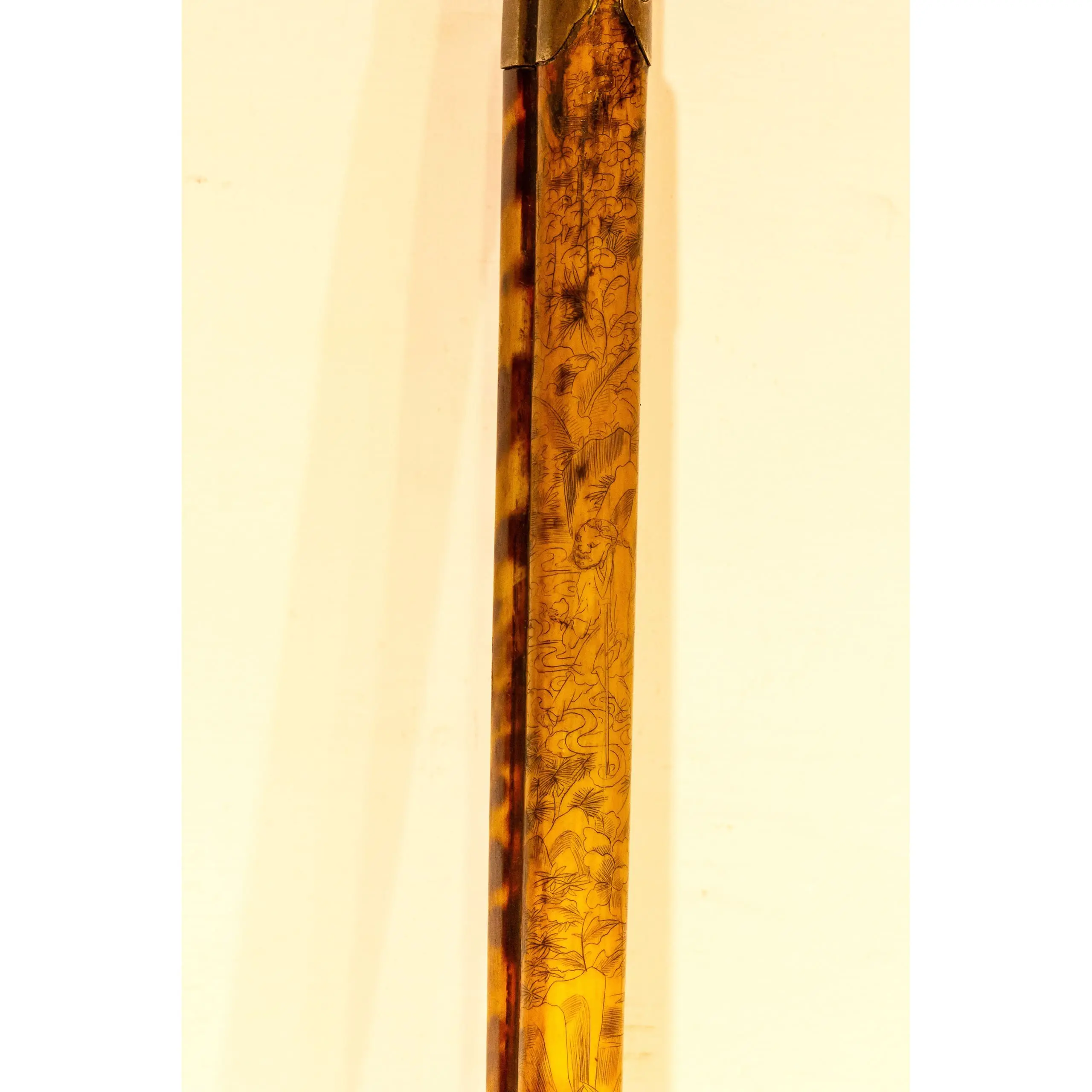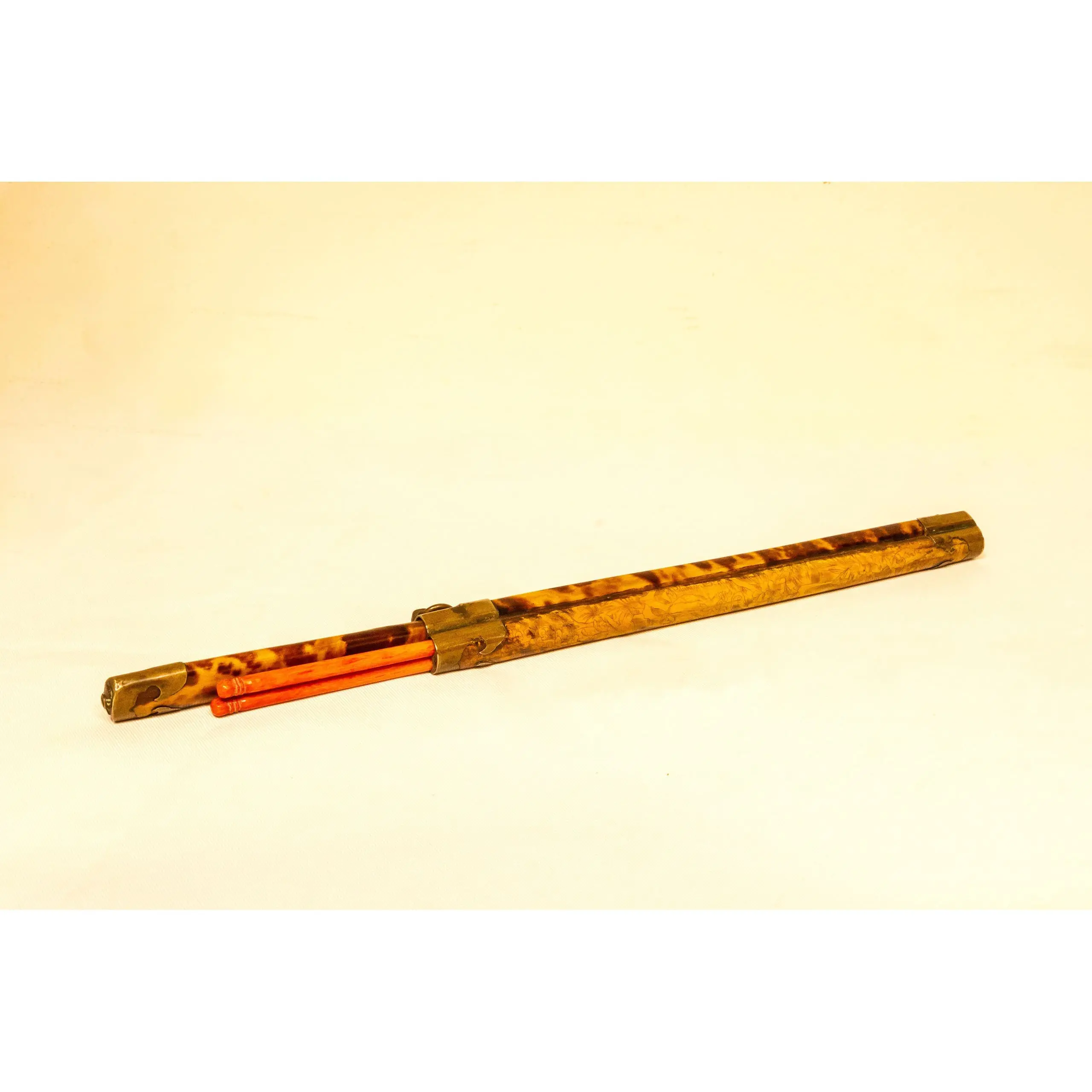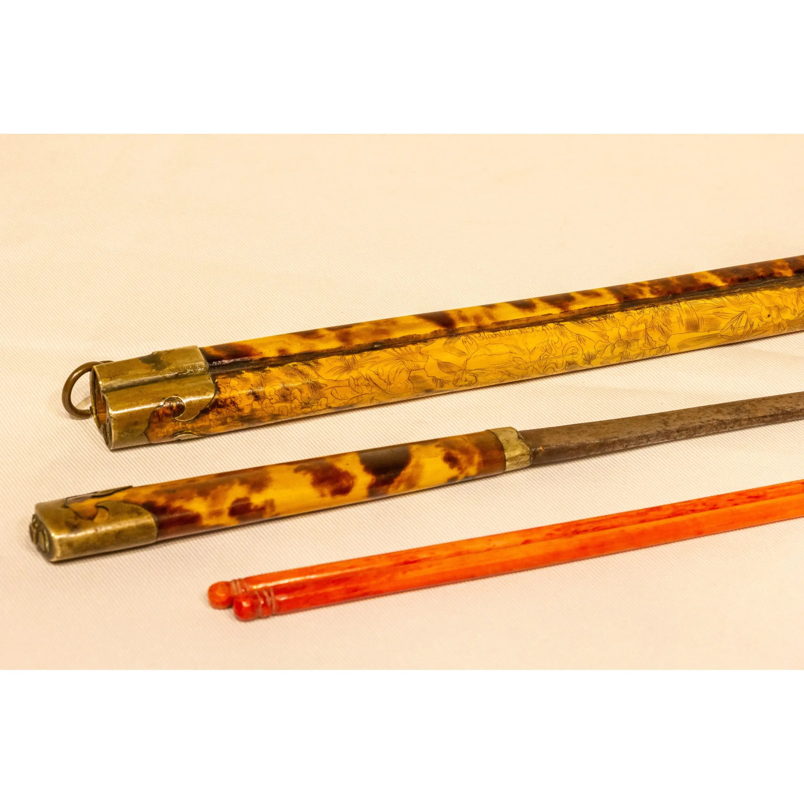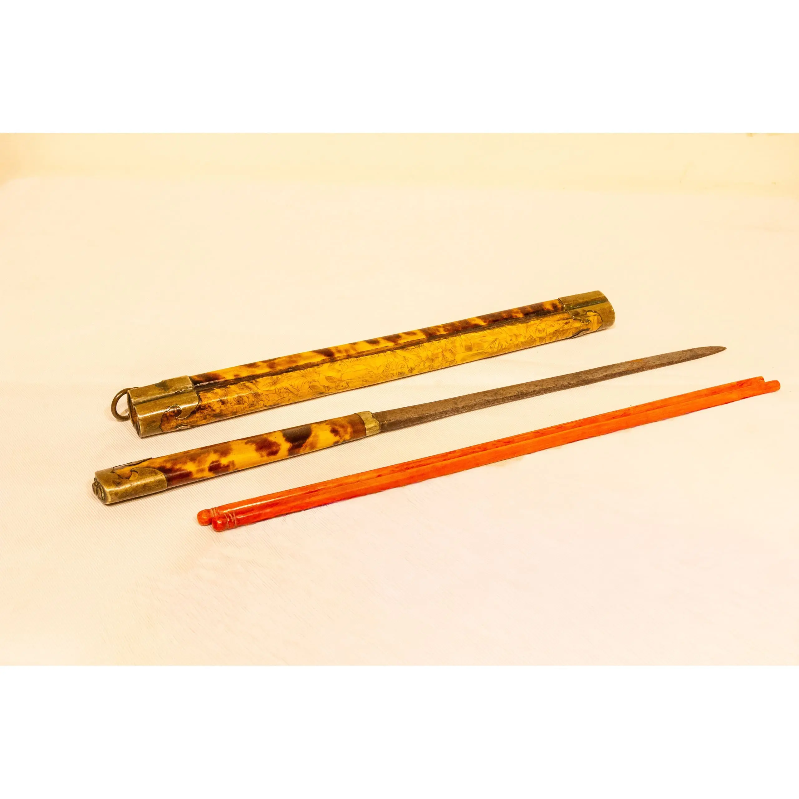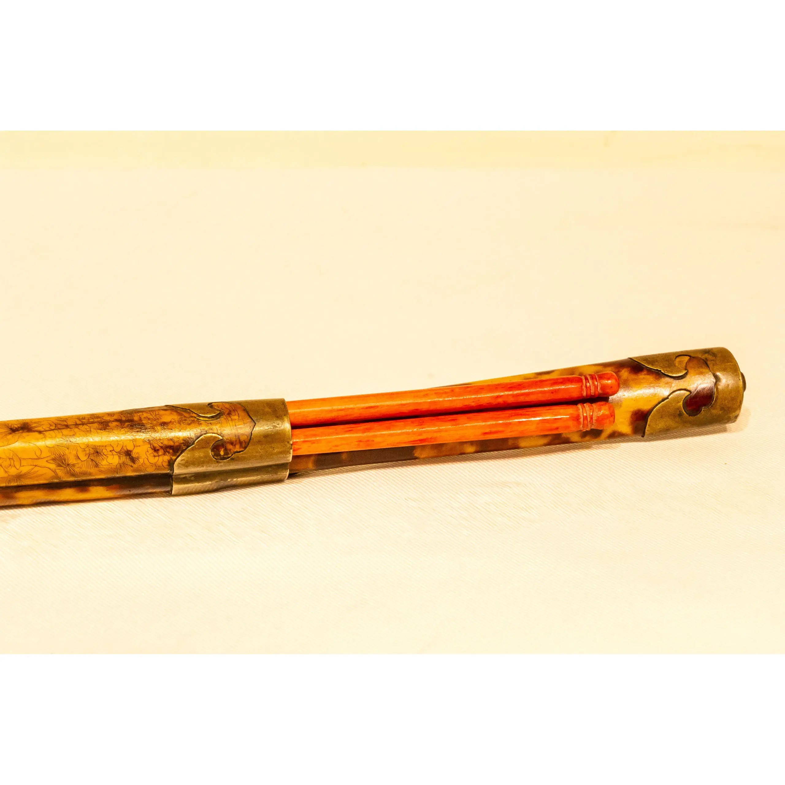 | Description | Mongolian knife and chopstick holder of tortoise bamboo, with bone chopsticks, brass decorative hardware |