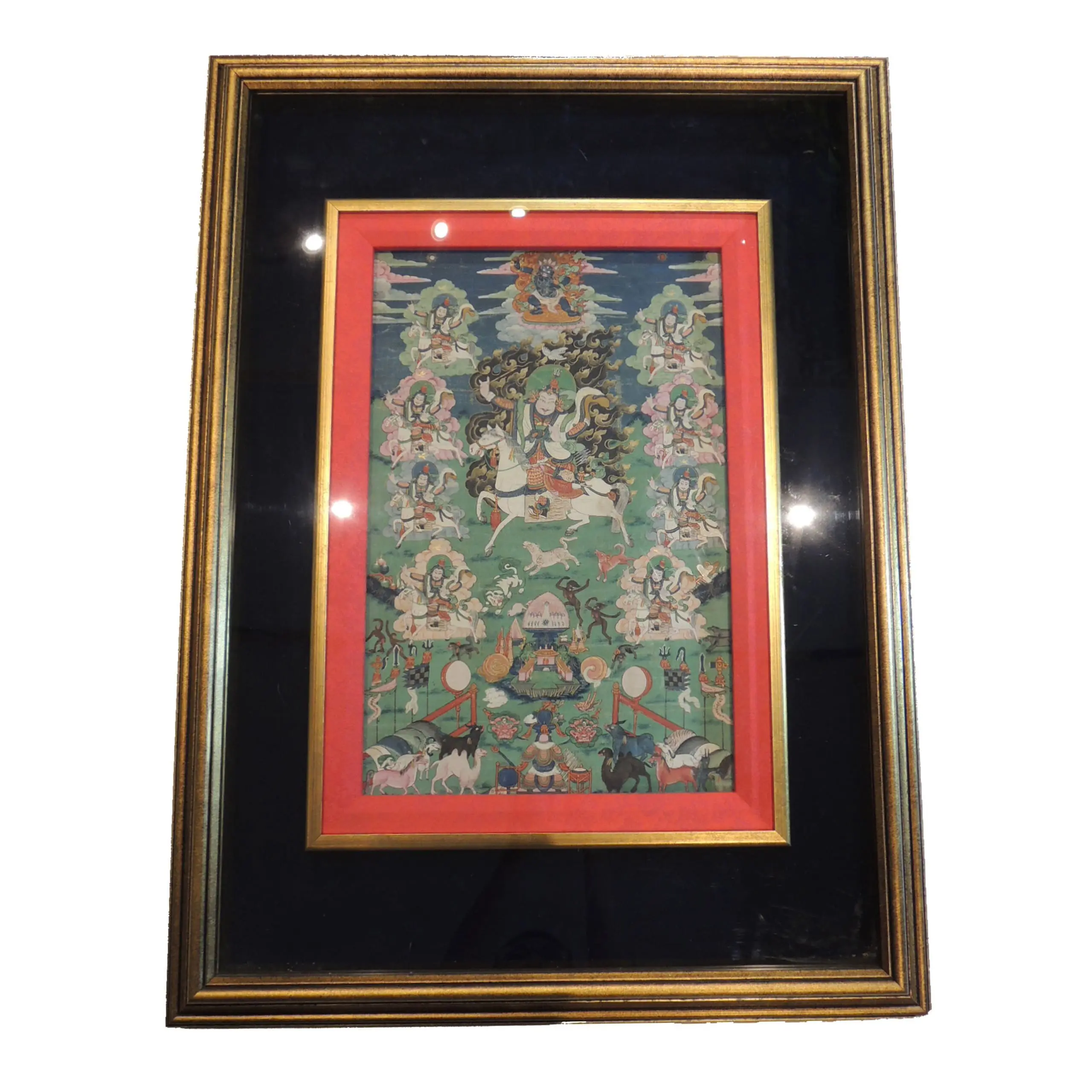 This early 19th-century Tibetan thangka depicts Palden Lhamo riding a white mule across a sea of blood, surrounded by wrathful deities. Vividly rendered on a green ground, the composition reflects classic protector thangka style. Housed in a modern frame, it balances preservation with striking visual presentation.