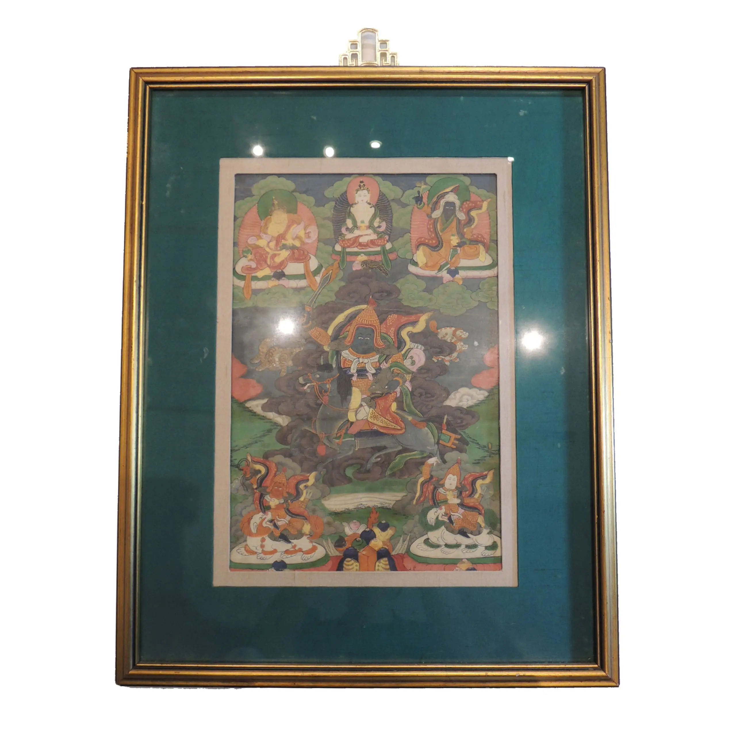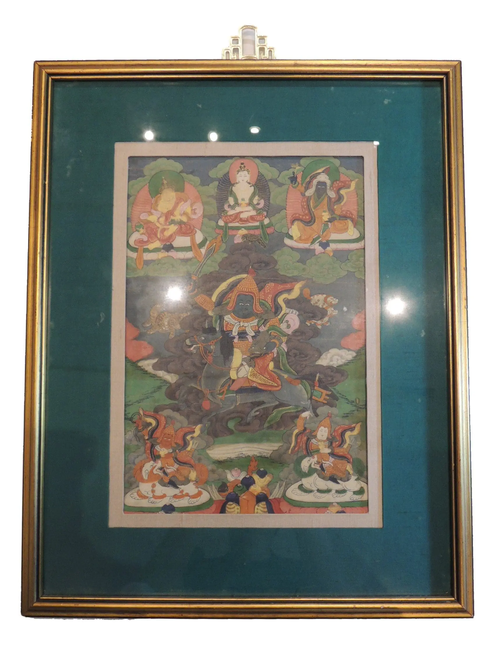 | Description | This early 19th-century Tibetan thangka (20 × 15.75 cm) shows a wrathful deity—likely Palden Lhamo or Mahakala—riding through black clouds amid flames. Surrounded by guardian figures and overseen by serene deities above, the composition unites tantric intensity with divine calm, exemplifying classical Tibetan artistry and spiritual symbolism. |