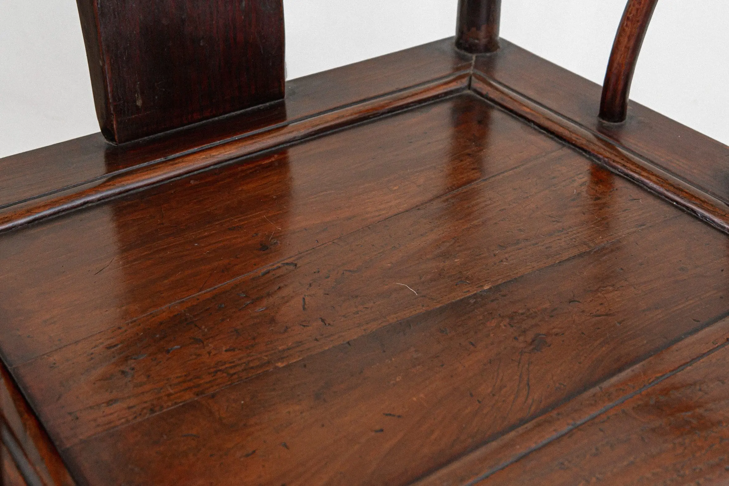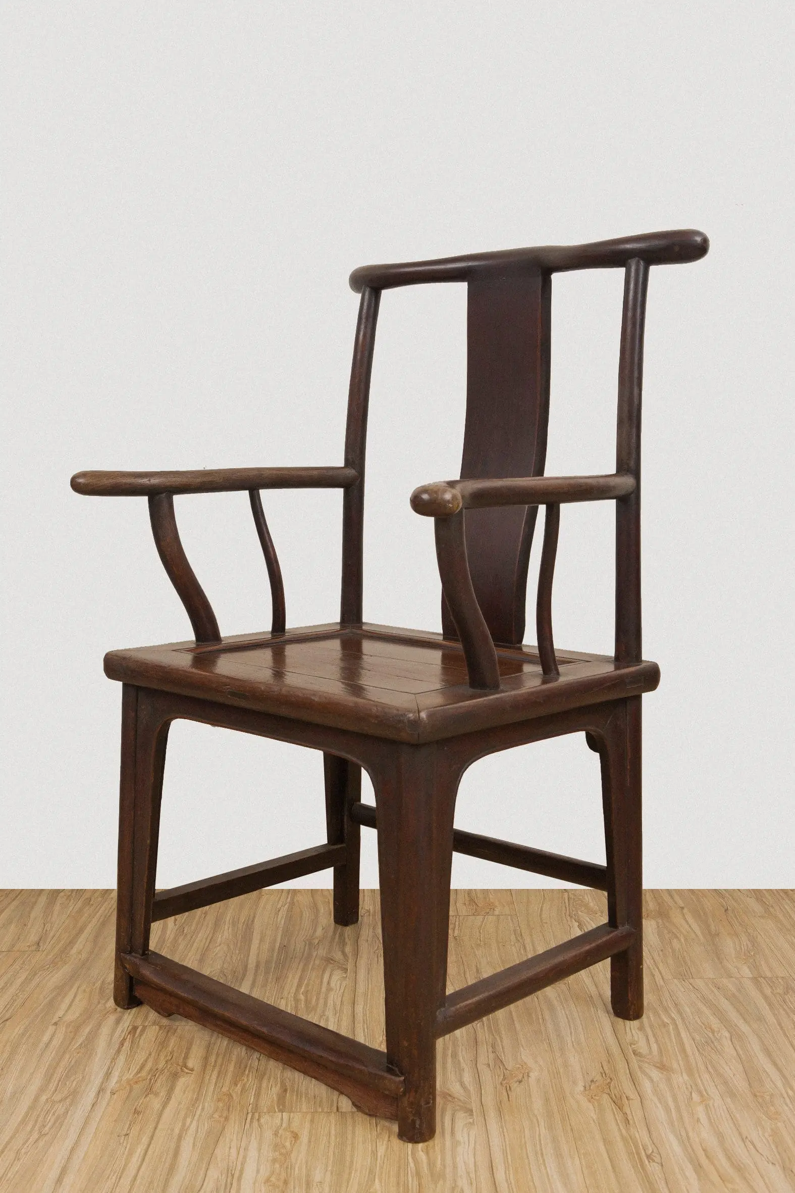 | Description | An 'official's hat' arm chair, wider than most, with a gently curved top rail, S curved arms raised on curved supports, stepped base stretchers and a footrest. |